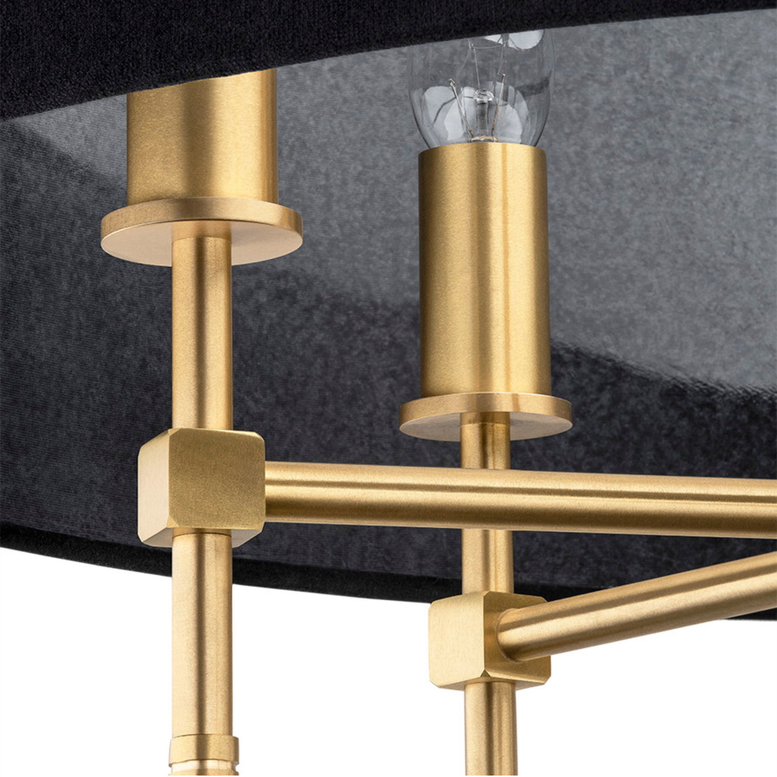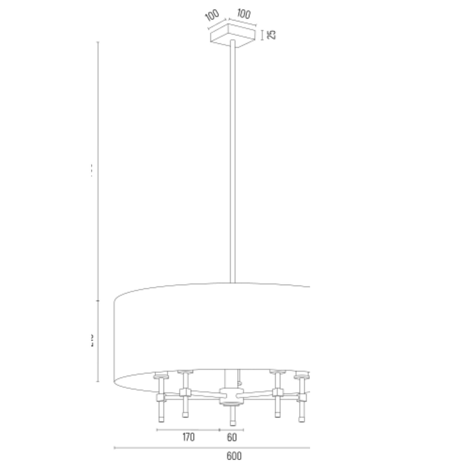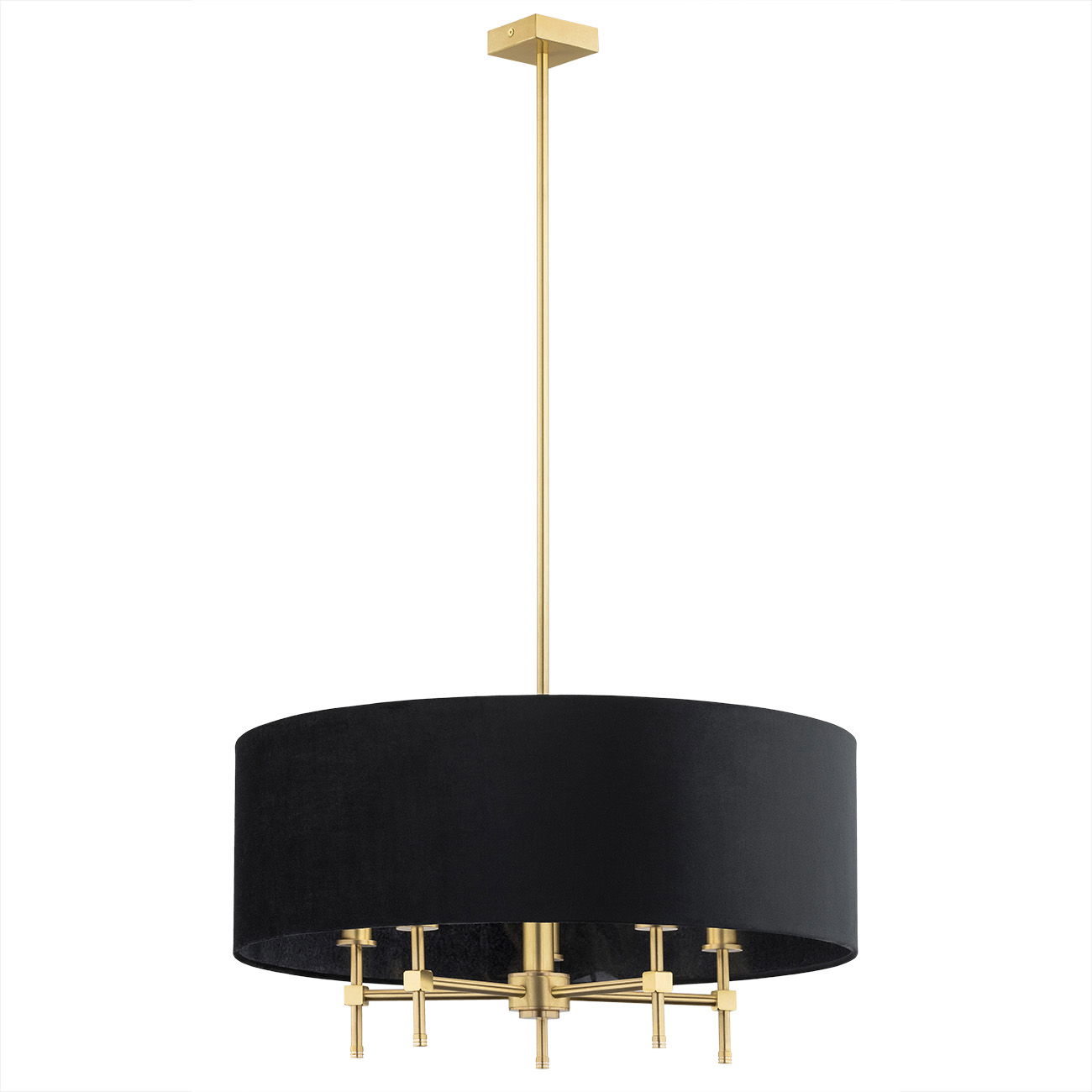 The Abano Drum Chandelier hangs 103cm down from the ceiling on a fixed rod with a 60cm wide black fabric shade. The chandelier uses five SES E14 candle bulbs positioned on brushed brass arms inside the drum shade.