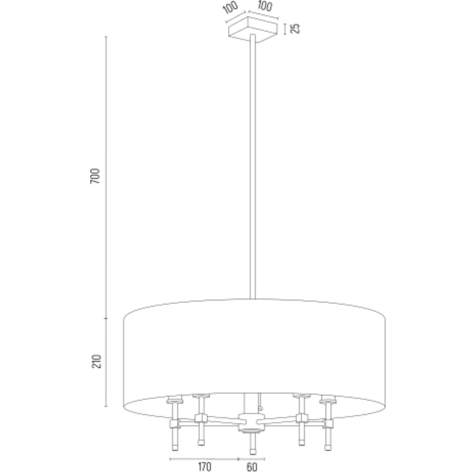 The Abano Drum Chandelier drops 103cm from the ceiling with a 60cm wide velvet green fabric shade. The chandelier holds five SES E14 candle bulbs (not included) on brushed brass arms positioned within the drum shade.