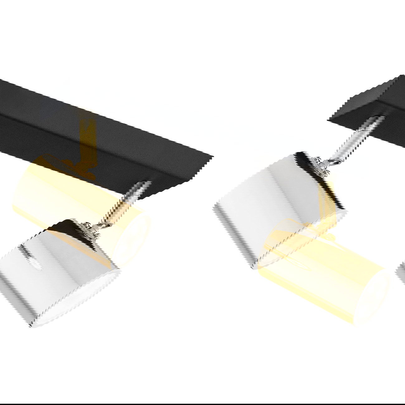 The Agos Adjustable Ceiling Spotlight has two brass cylindrical heads on a black rectangular bar. Each spotlight head can be tilted and rotated to direct light where needed.
