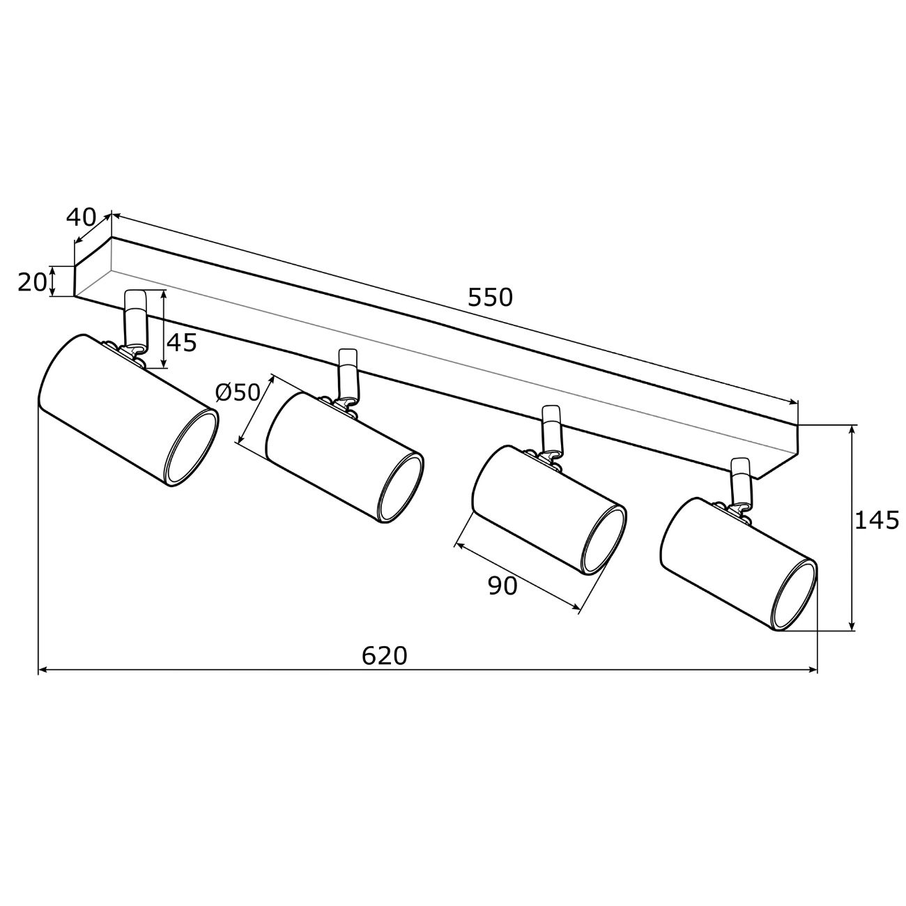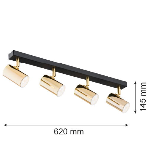 The Brass Agos Adjustable Ceiling Spotlight has four brass cylindrical heads on a black rectangular bar. Each head is mounted with a brass joint that you can angle. This ceiling spotlight is 62cm long in total.