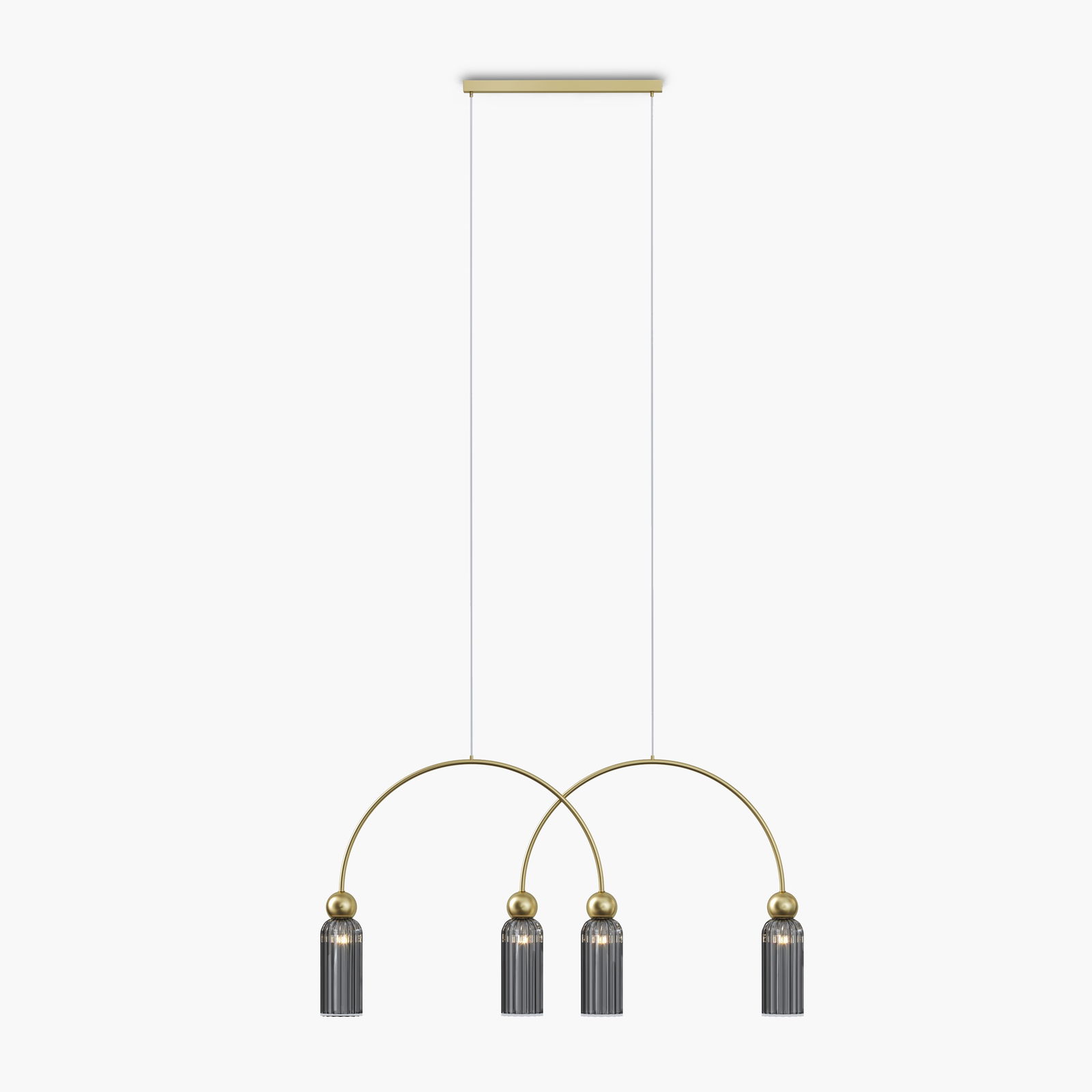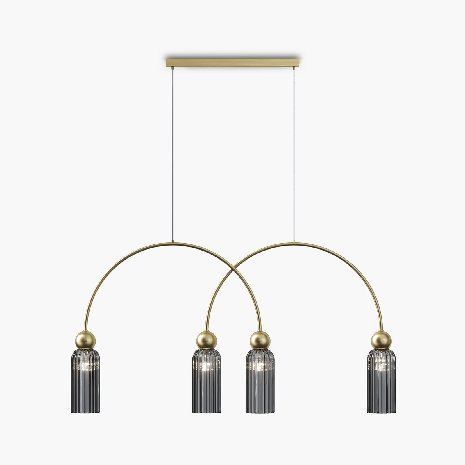 The Antic Curved Pendant Lamp has four grey ribbed glass cylinder shades hanging from curved arched gold metal arms suspended from a rectangular gold ceiling plate.
