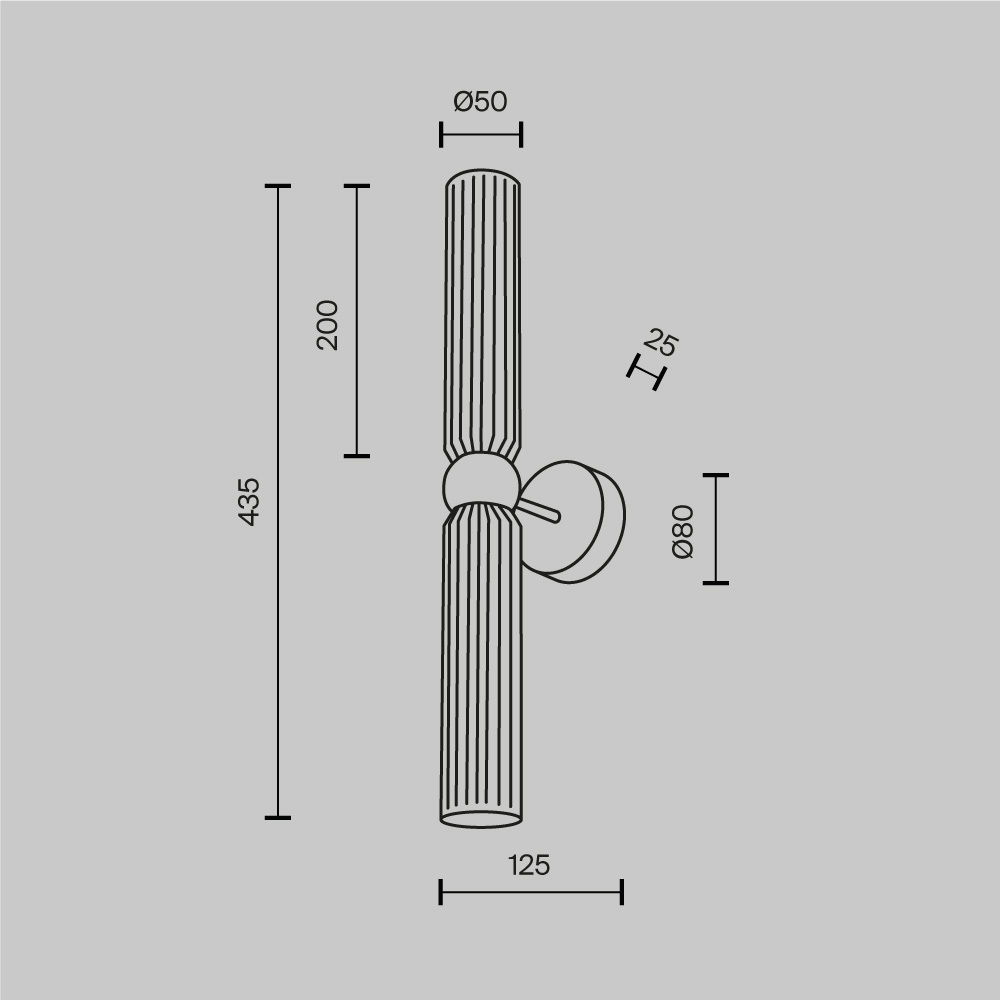 The Antic Up & Down Grey Glass Wall Lamp projects two narrow ribbed grey glass cylinders from a gold sphere detail, which is attached to a circular wall mount, with one cylinder directed upward and one directed downward.