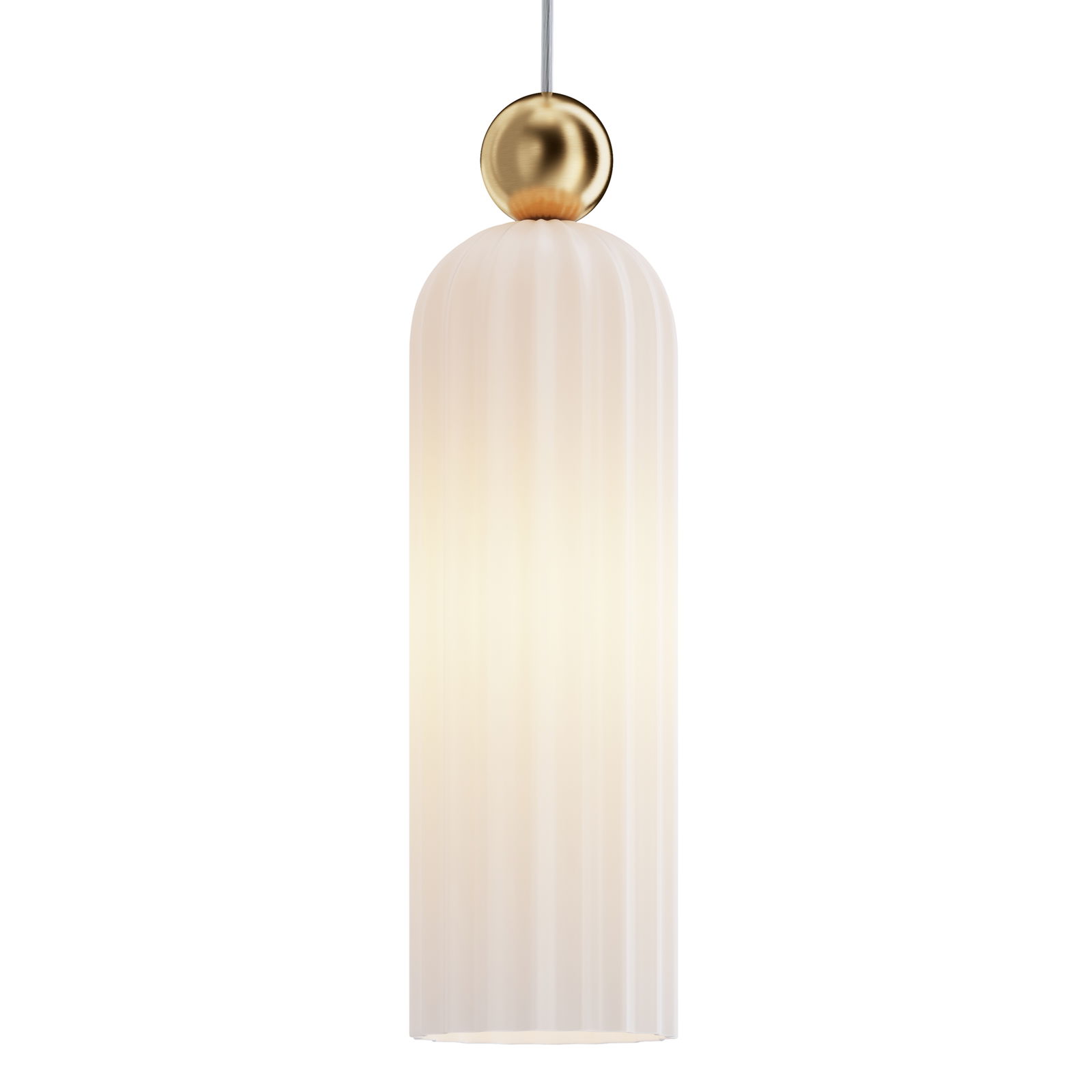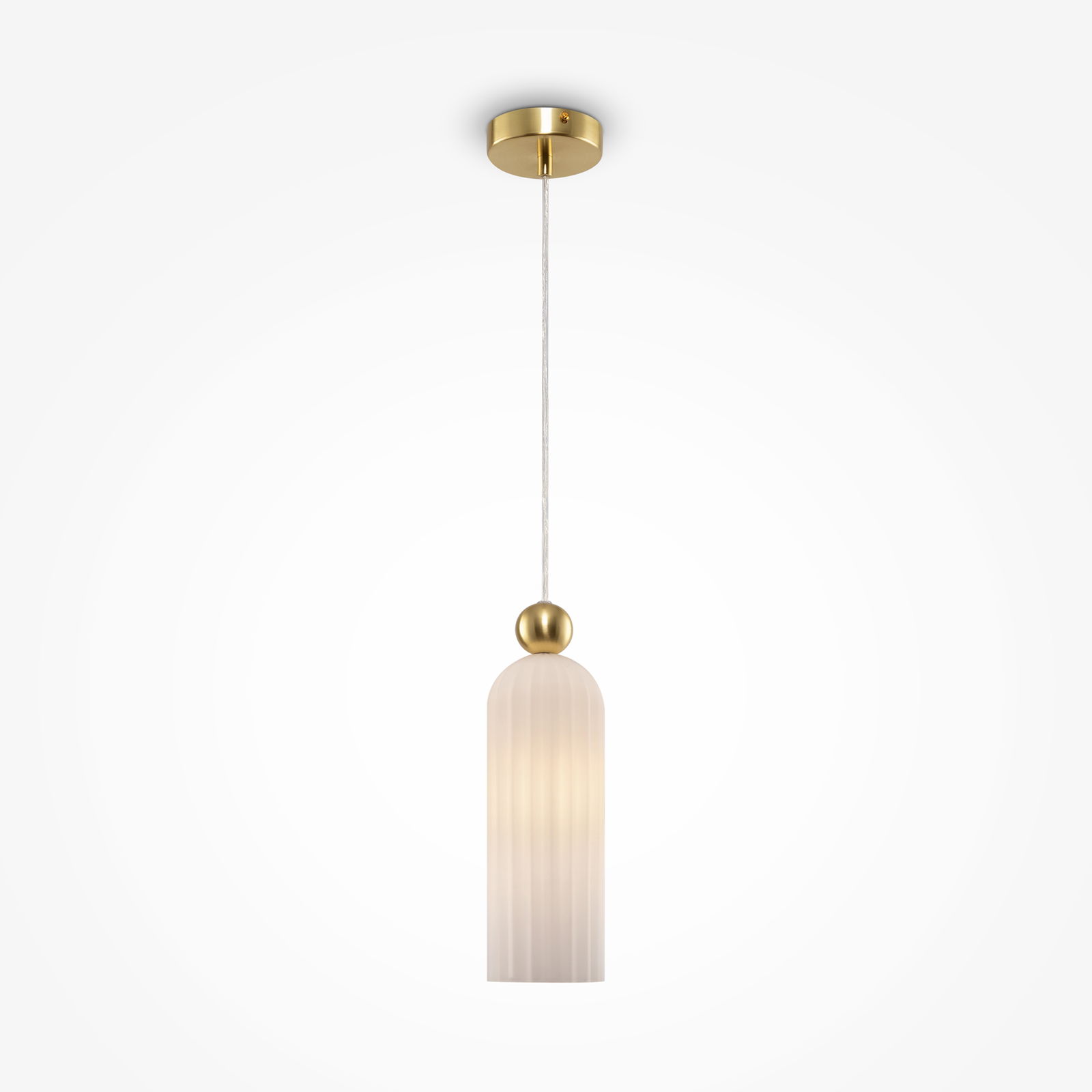 The Antic White Cylinder Glass Pendant Light suspends a white ribbed glass cylinder shade from a gold ceiling plate on a white fabric cable.