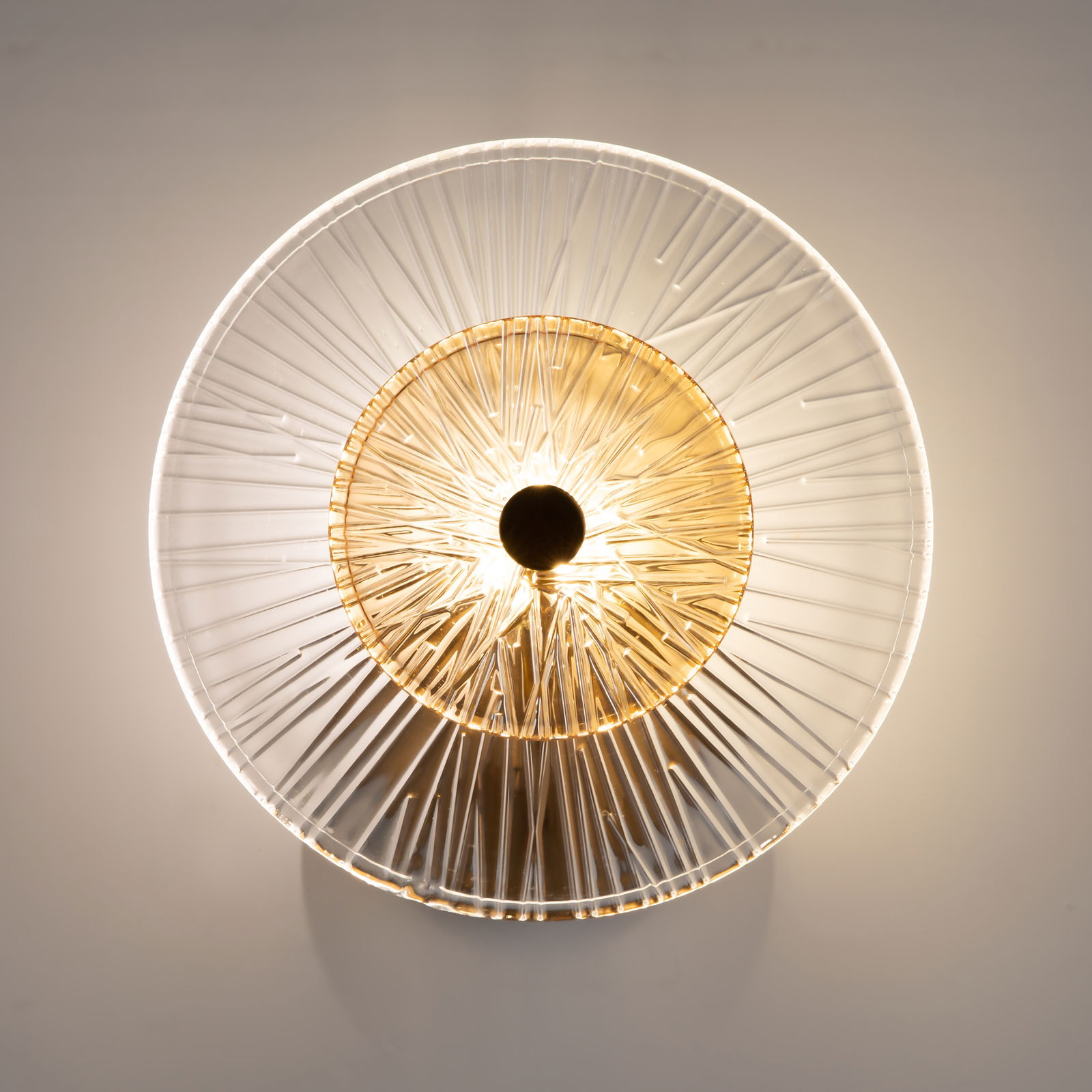 The Aster Circular Wall Light has a single circular amber and clear glass disc shade with a ribbed stamped glass, mounted on a round gold metal wall plate. The 28cm shade sits upright against the plate on a short gold arm, facing outward from the wall.