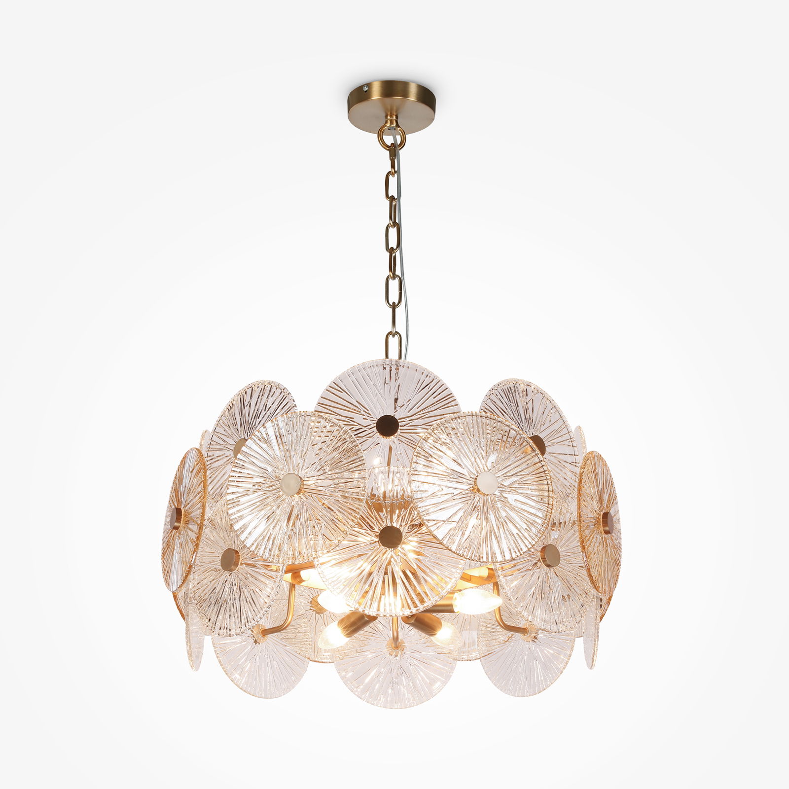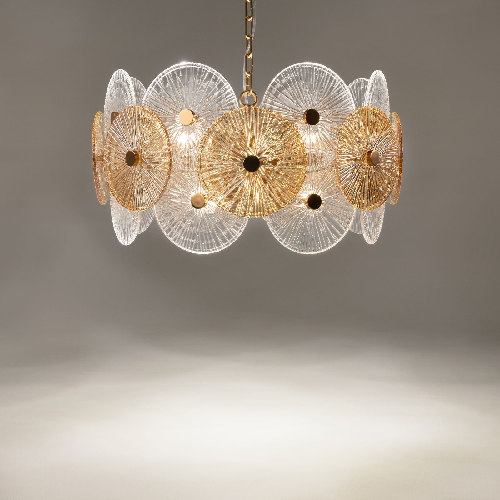The Aster Round Gold Pendant Light has two rows of circular amber glass discs with a starburst-stamped surface, fixed around a central gold hub and suspended on a gold chain from a round canopy.