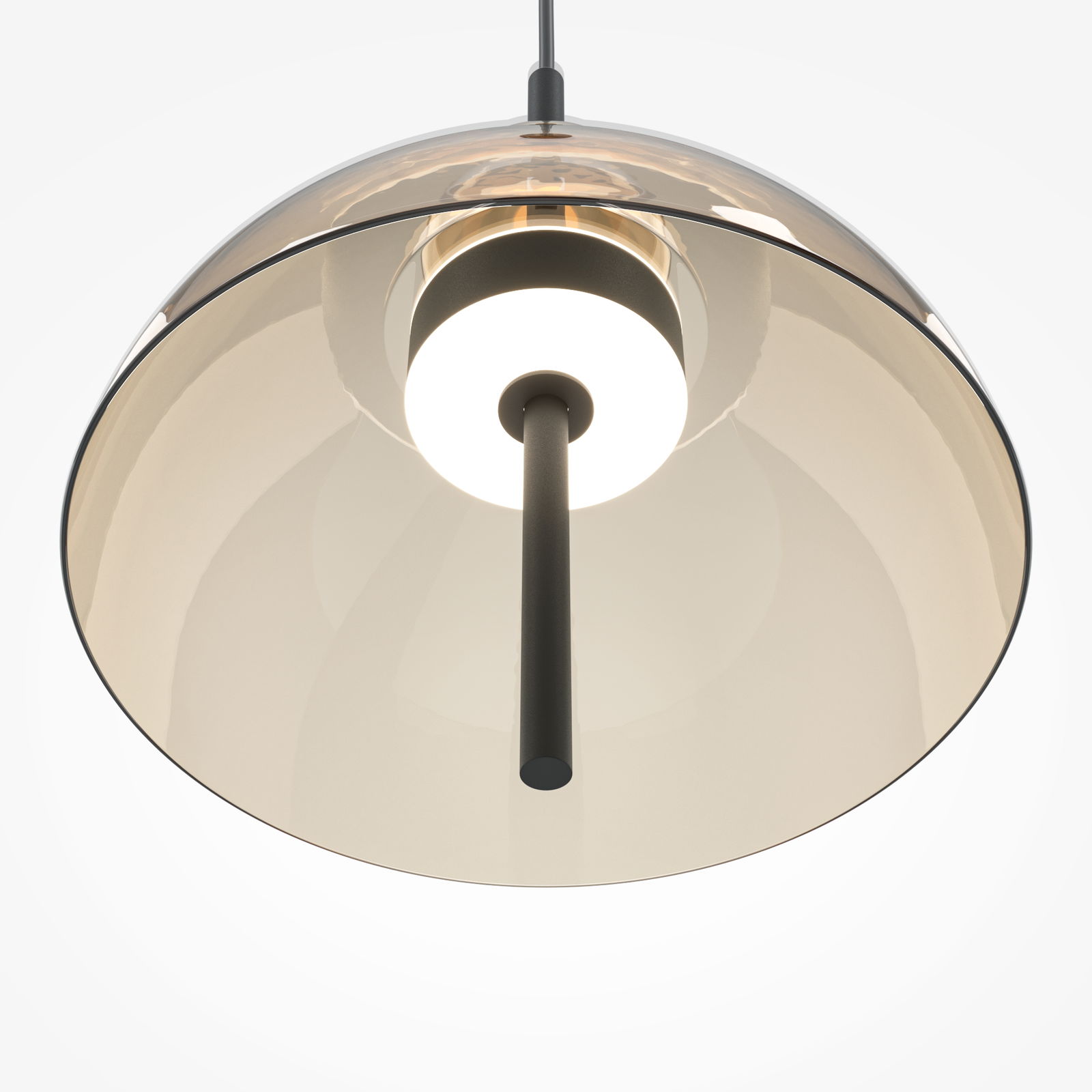 The Bangkok Mini Cognac Glass LED Pendant Light hangs from a thin black cable with a 25cm cognac-tinted glass shade. A black metal rod runs through the centre with the LED positioned at the base of the dome-shaped shade.