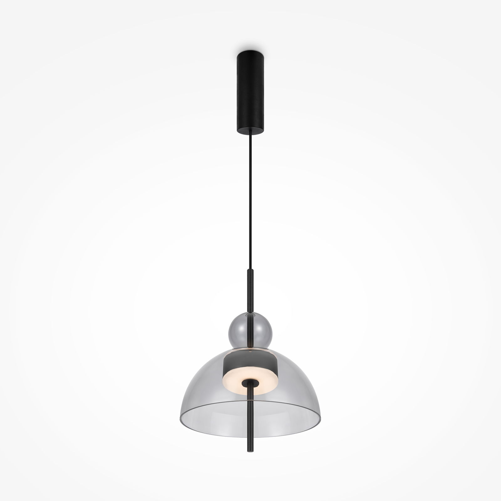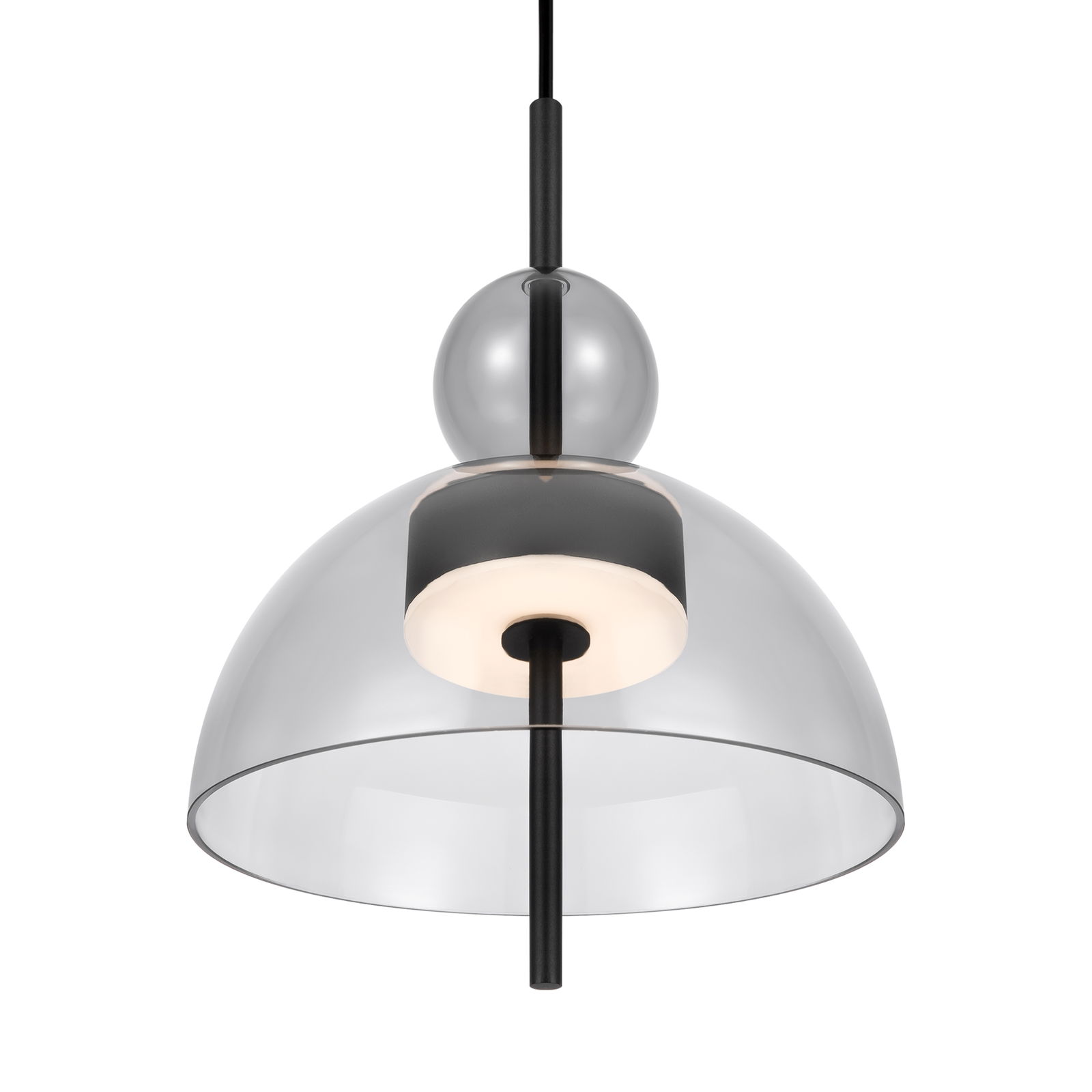 The Bangkok Mini Grey Glass Pendant Lamp has a wide smoked grey glass dome shade with a black rod running through its centre with the integrated LED module attached.