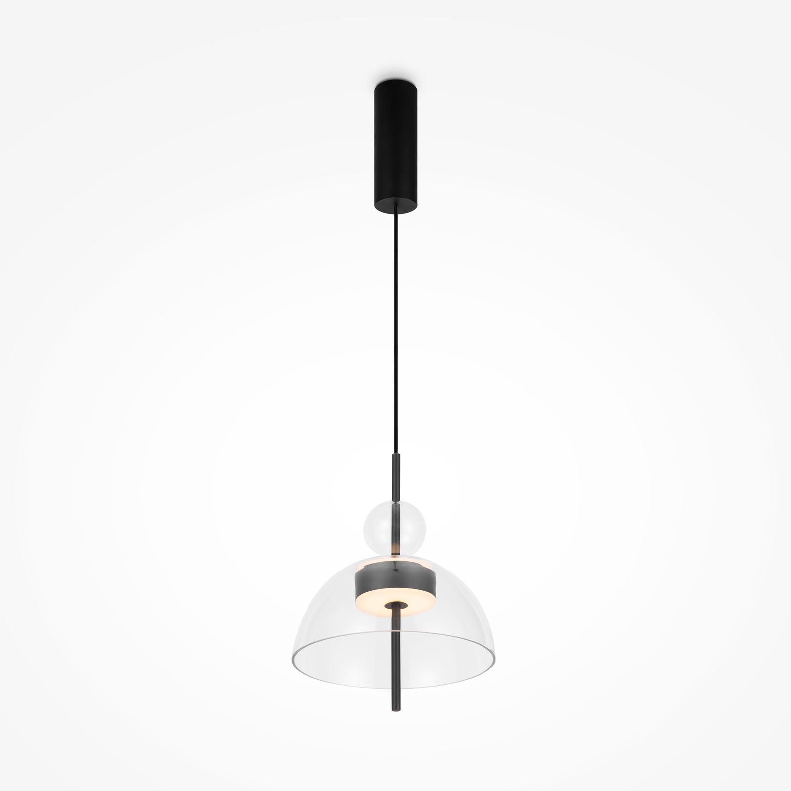 The Bangkok Mini LED Pendant Light hangs from a thin black cable with a 25cm clear glass shade that has a gently curved dome shape. A black metal rod passes vertically through the shade with the integrated LED positioned at the bottom.