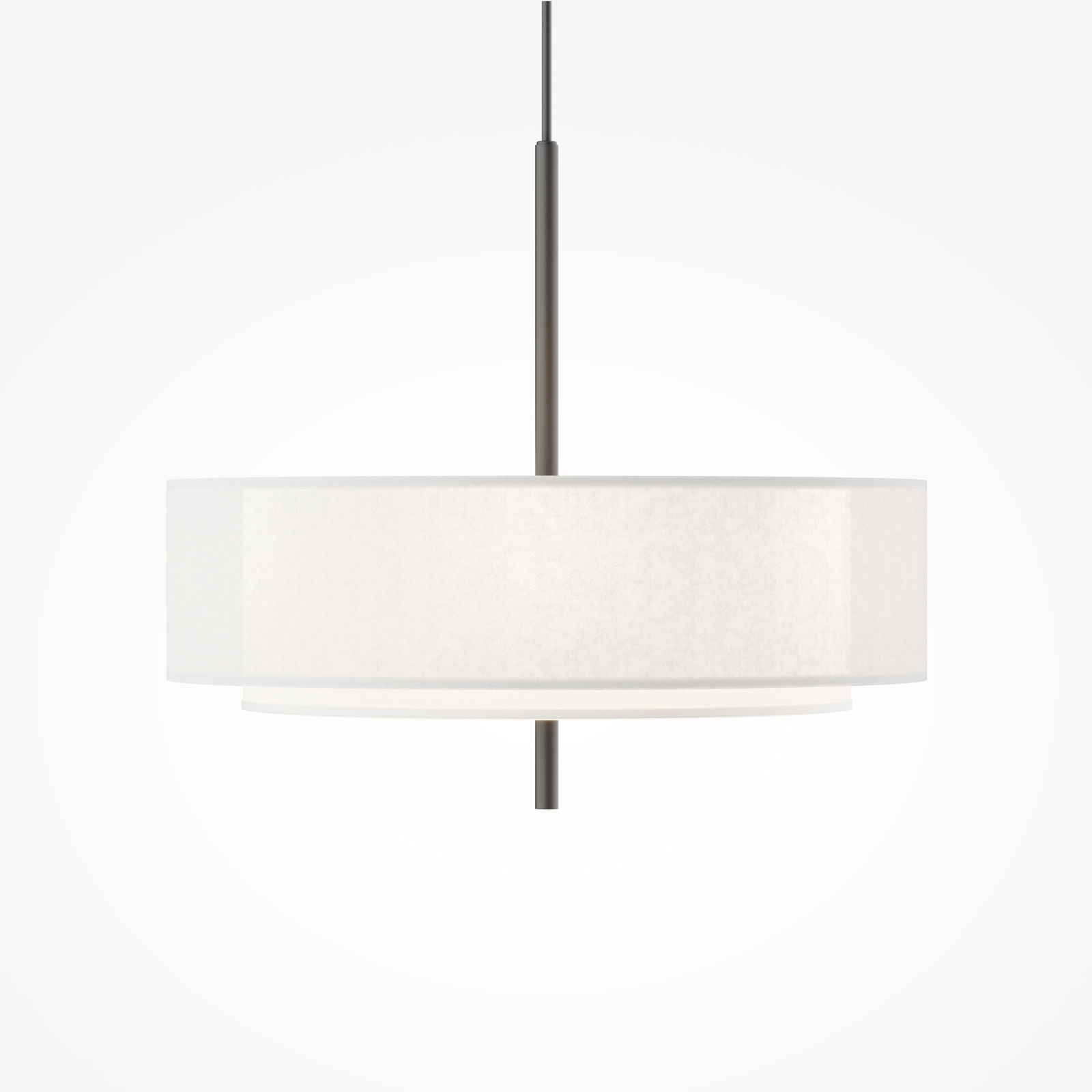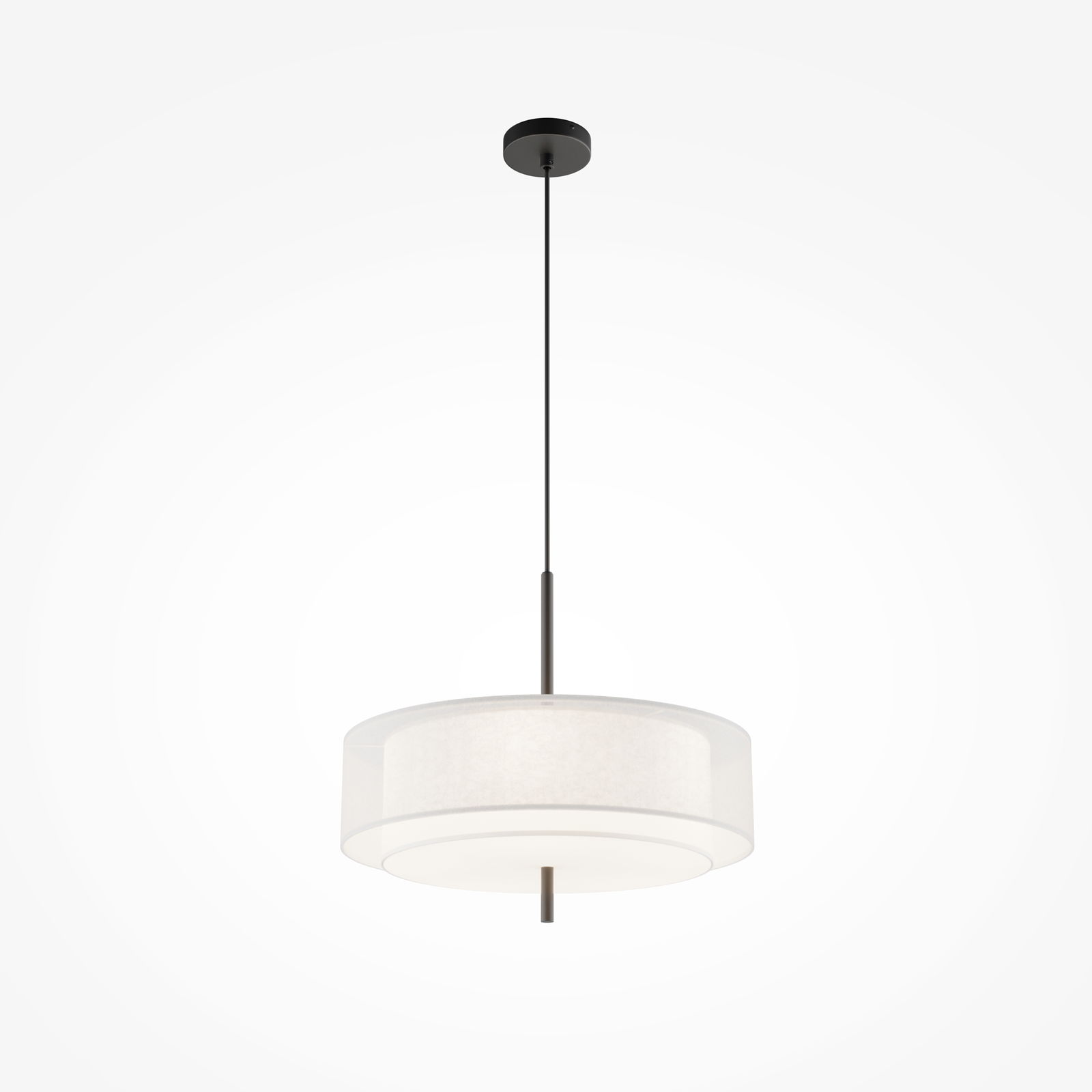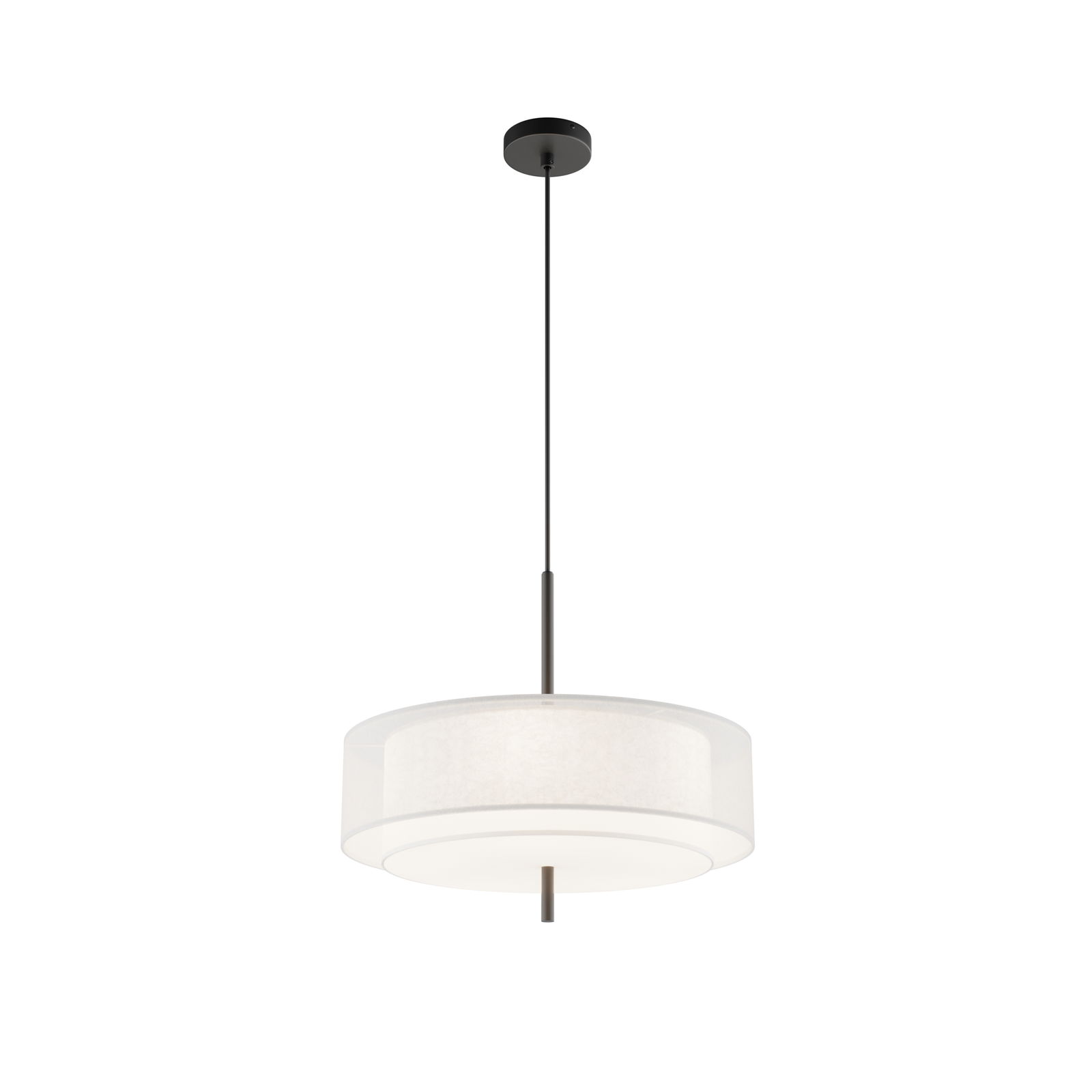 The Bergamo clear and white pendant light has one clear drum with a smaller white drum shade hanging from a black metal frame.