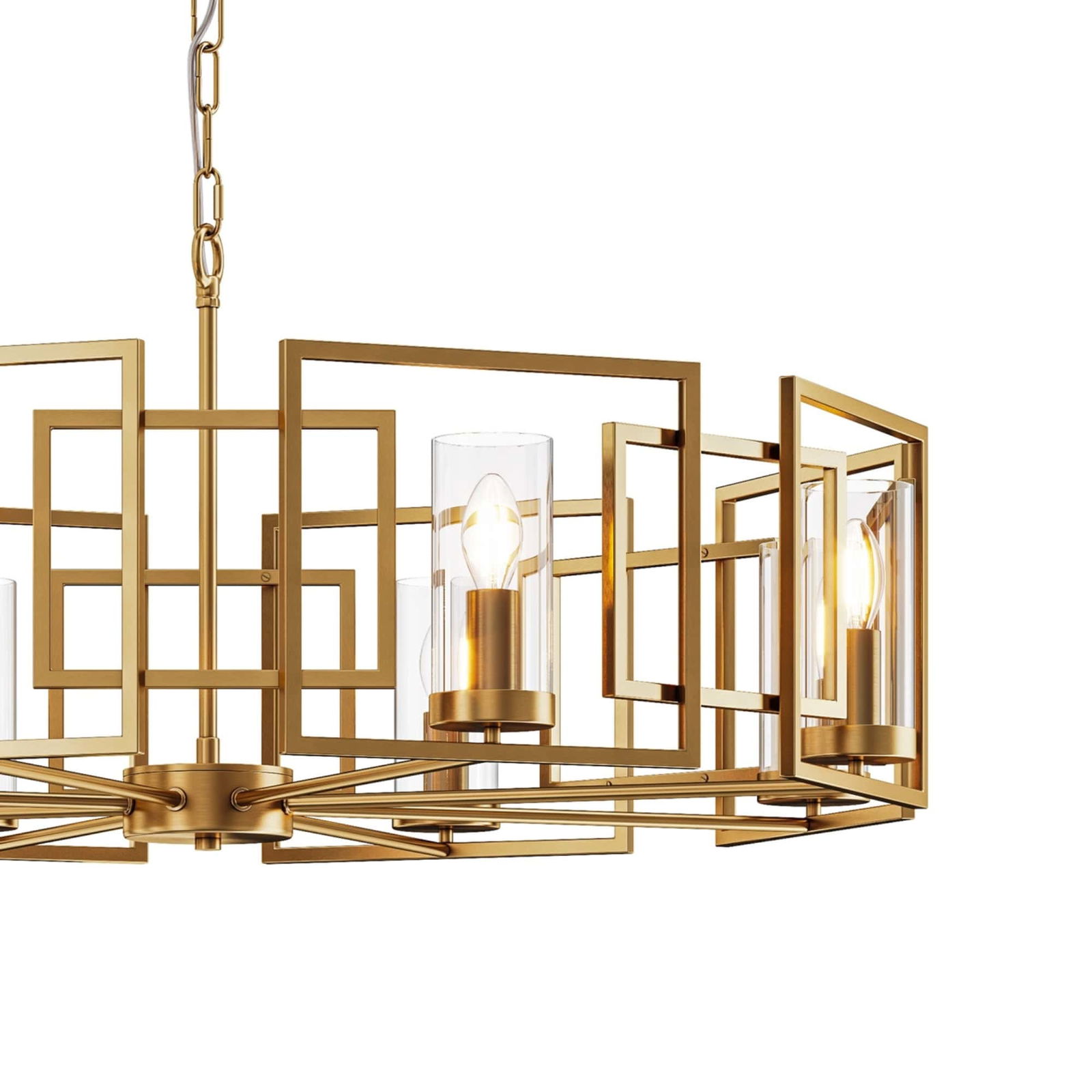 The Bowi 8 Light Chandelier features eight clear glass shades in a 87.5cm-wide circular gold metal cage. The chandelier hangs 60.5cm at minimum and has a 143.5cm at maximum drop. The height can be adjusted by removing the links in the chain at the point of installation.