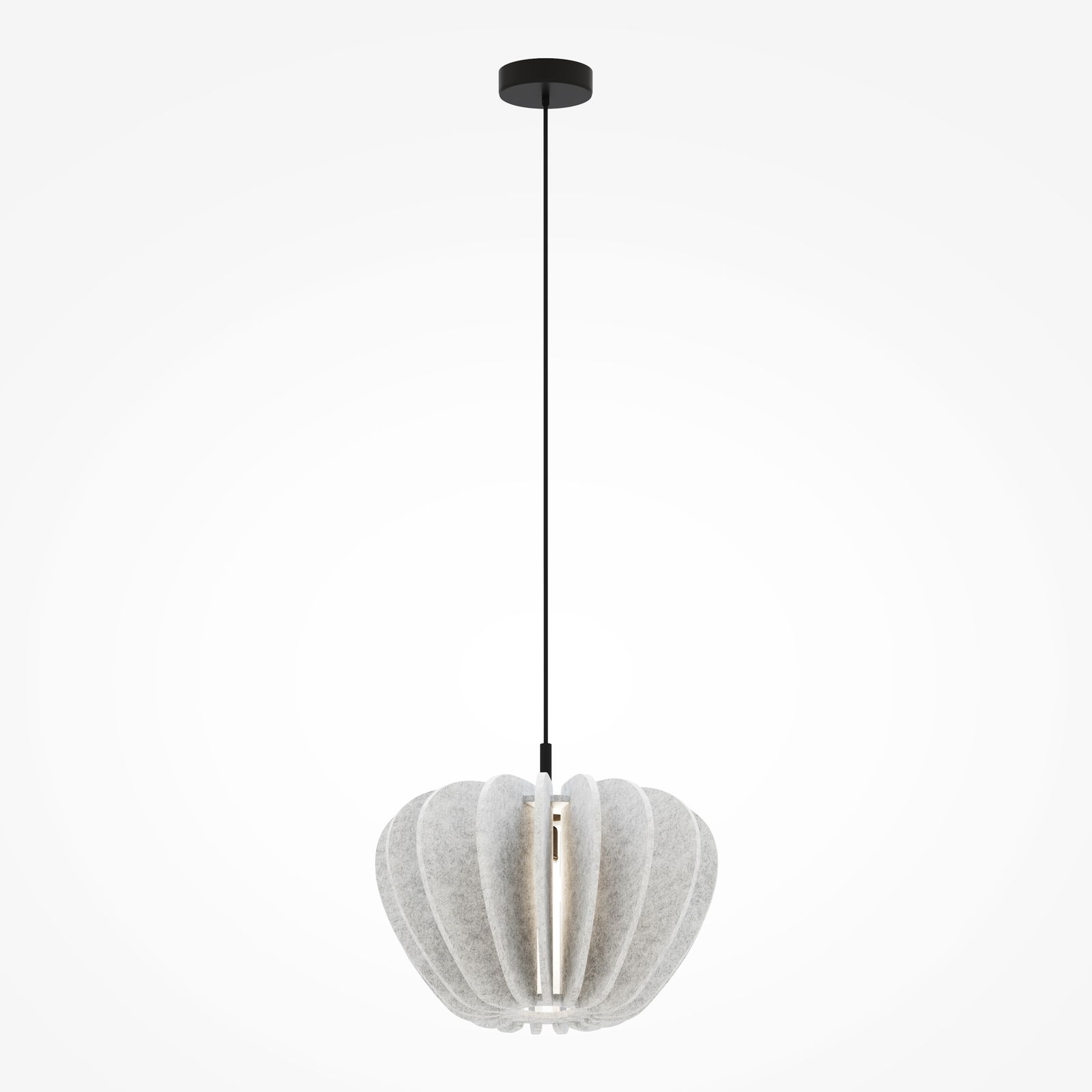 The Cambio Natural Felt Silver Pendant Light has a reversible dome shade formed from multiple vertical felt fins, tapering from a wide rim to a central black metal spine, in a pale silver-white felt finish. It hangs from a black cable with a small, round, black canopy.
