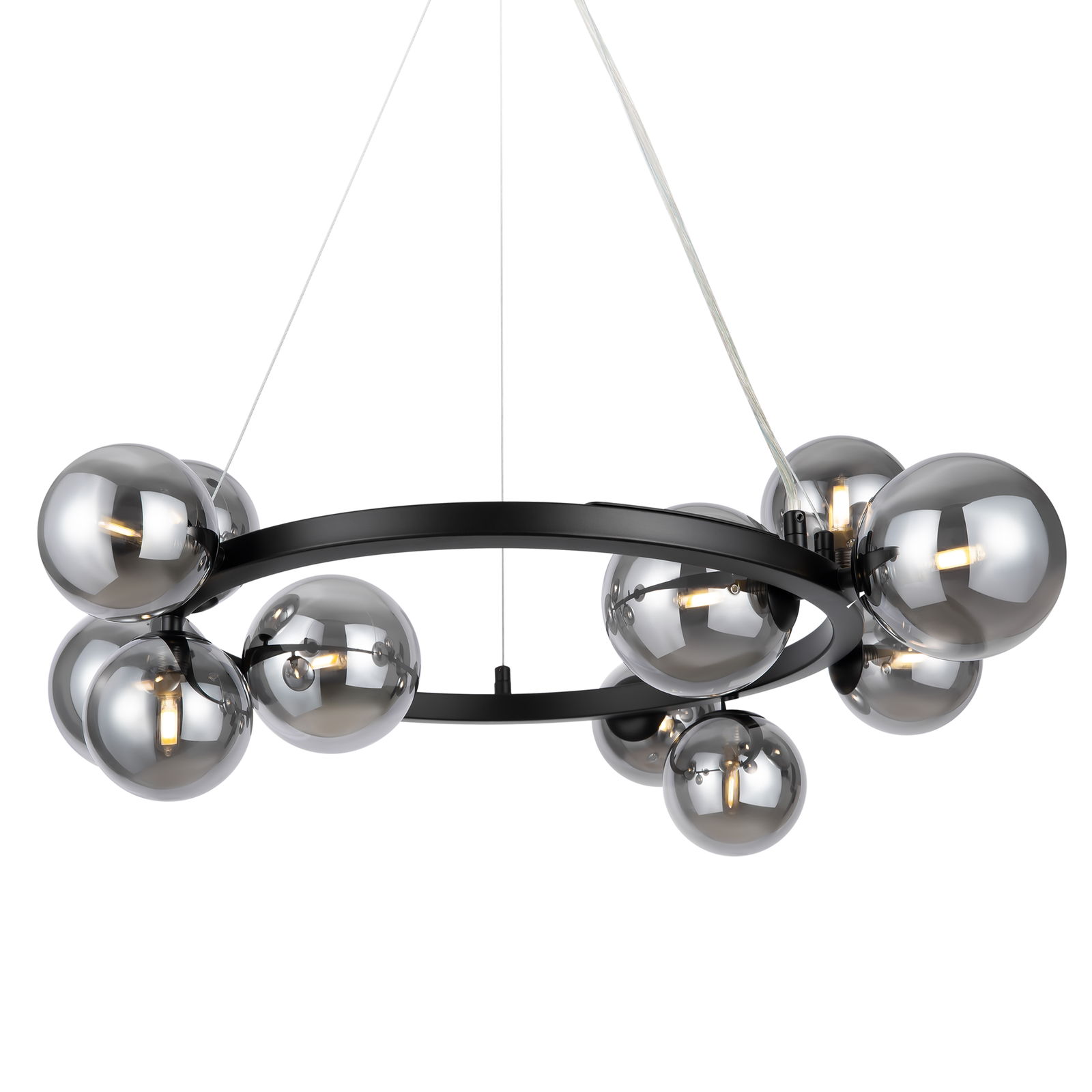The Dallas 11 light bubble glass chandelier comes complete with 11 smoked glass globes around a black ring. The globes sit at different angles, which helps project the light output in all directions, and the fixture is 67cm across and 25cm deep.