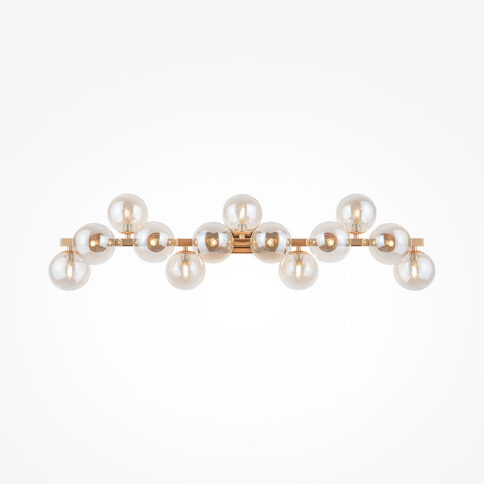 The Dallas 13 light bubble glass wall light has 13 amber glass globes on a gold bar. The globes are staggered along the 95cm wide bar, pointing in different directions.