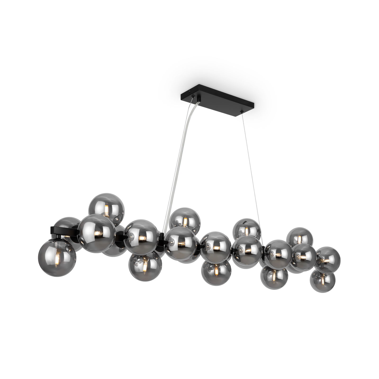 The Dallas black linear pendant lamp comes with 25 smoked glass globes along a 123.5cm black metal bar. Each globe has a reflective grey smoked finish, and the pendant light hangs from a rectangular black ceiling plate.