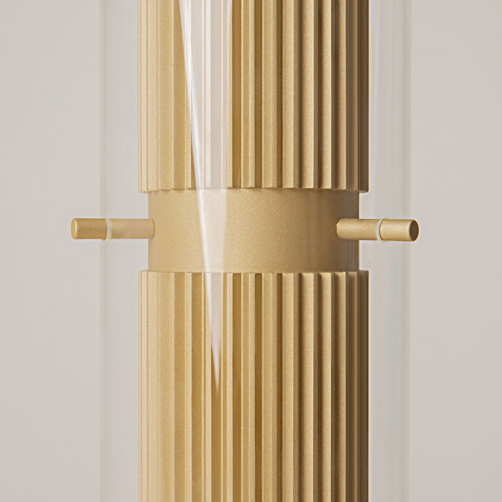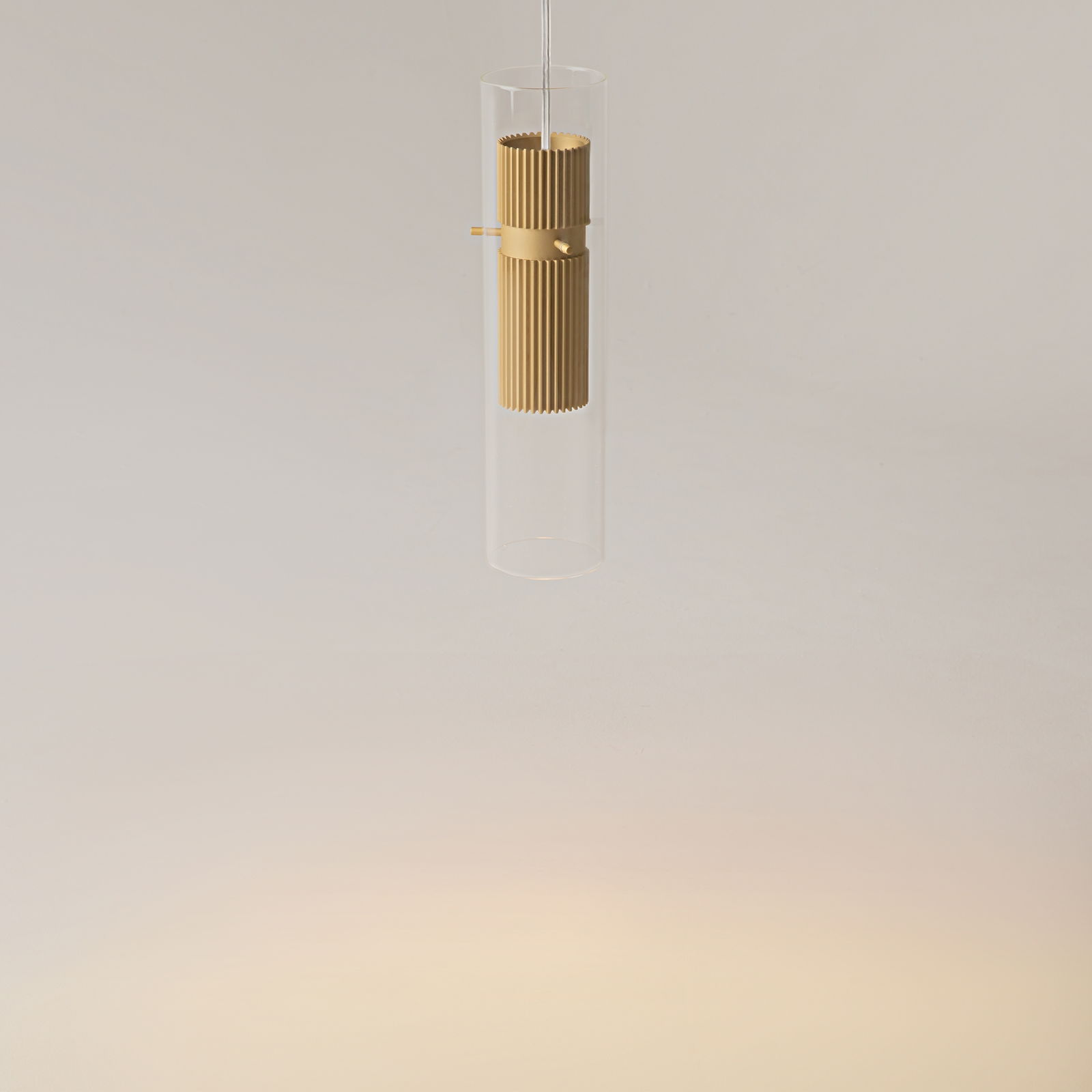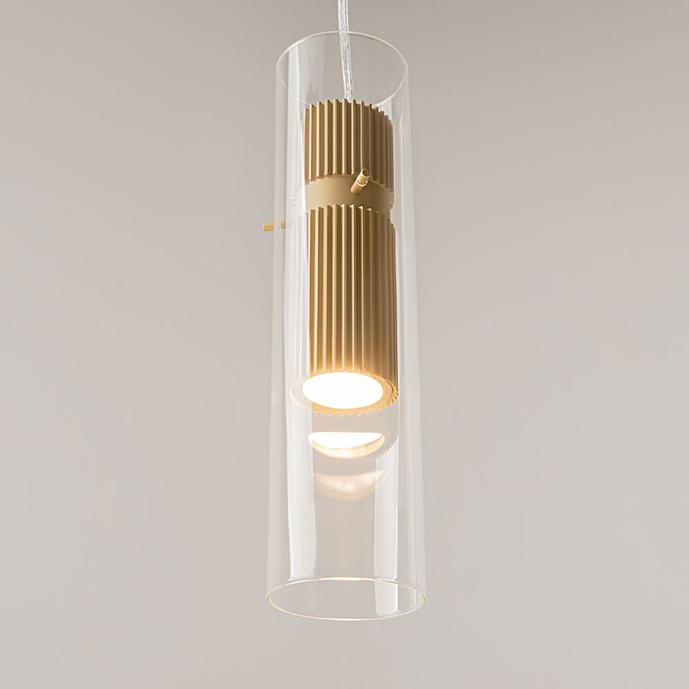 The Dynamics Gold Cylinder Pendant Lamp is 8cm in diameter and hangs on a cable, with a gold painted metal inner shade and an outer clear glass cylinder-shaped shade.