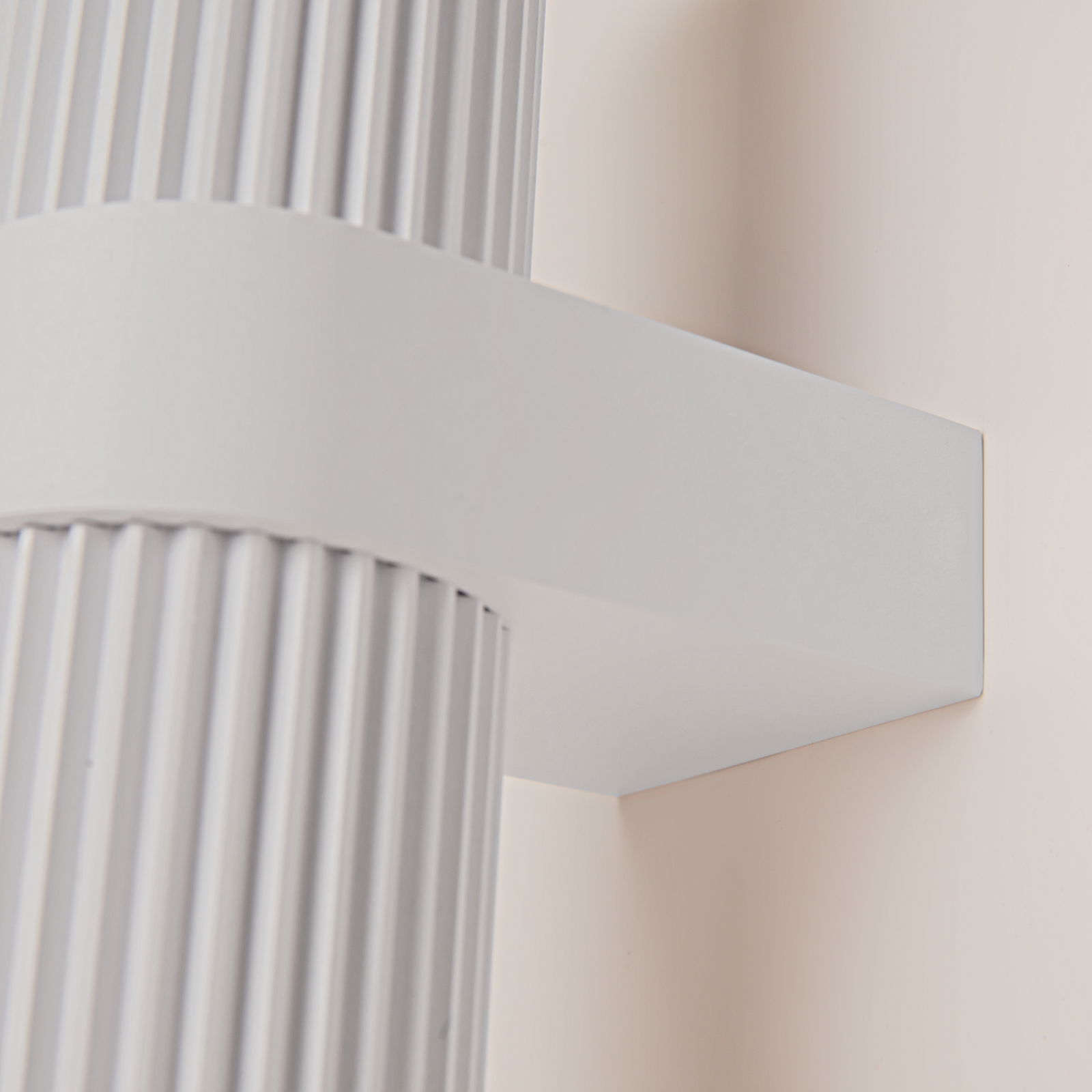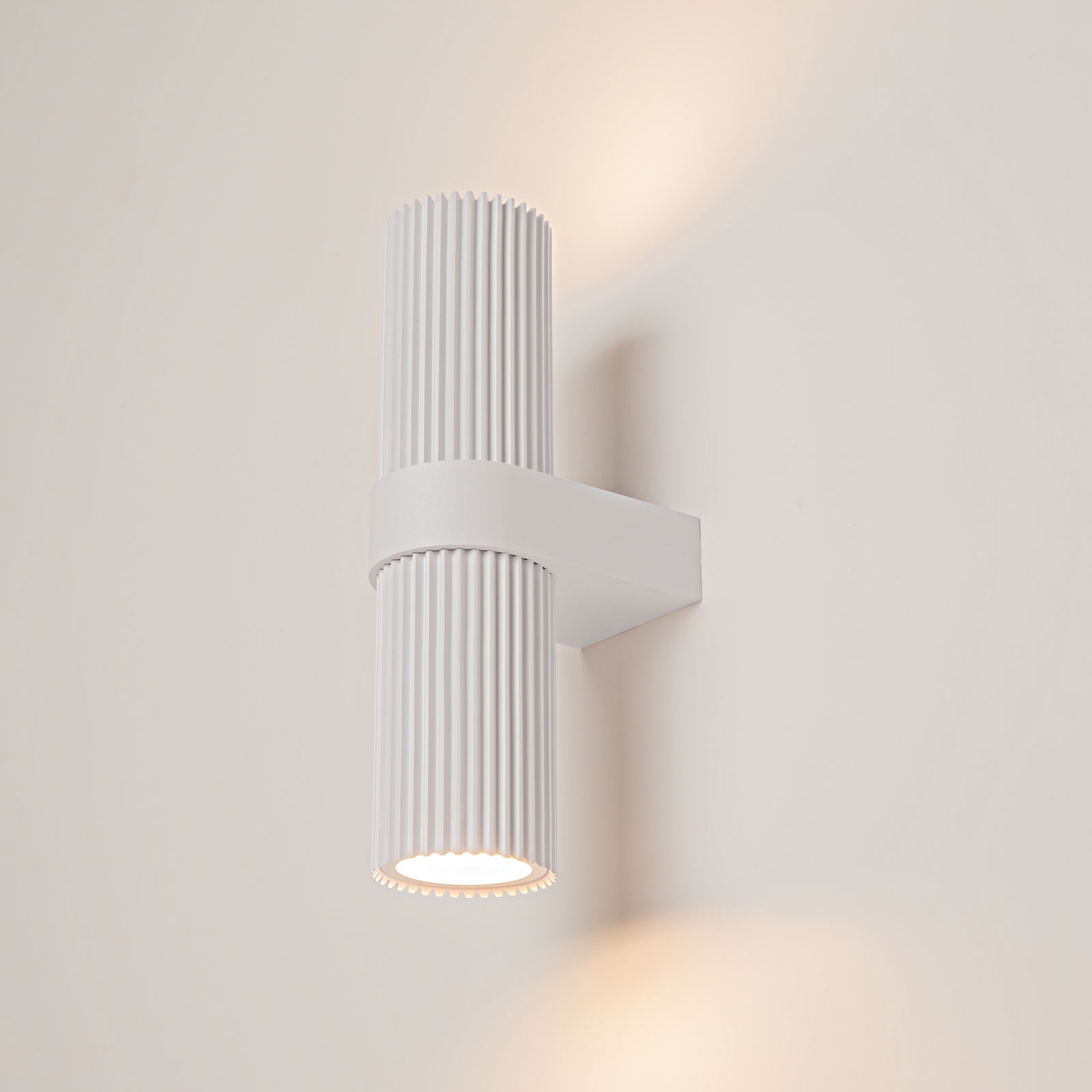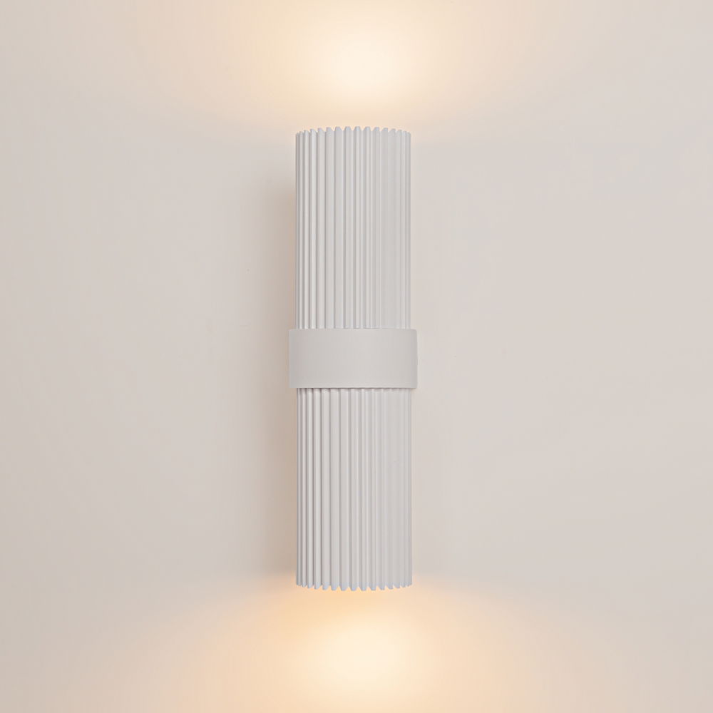 The Dynamics Up & Down Wall Light is 6cm wide and 23cm tall, with a white metal cylinder shade that has a vertical ribbed line on both the top and bottom sections, separated by a horizontal white wall bracket in the middle.