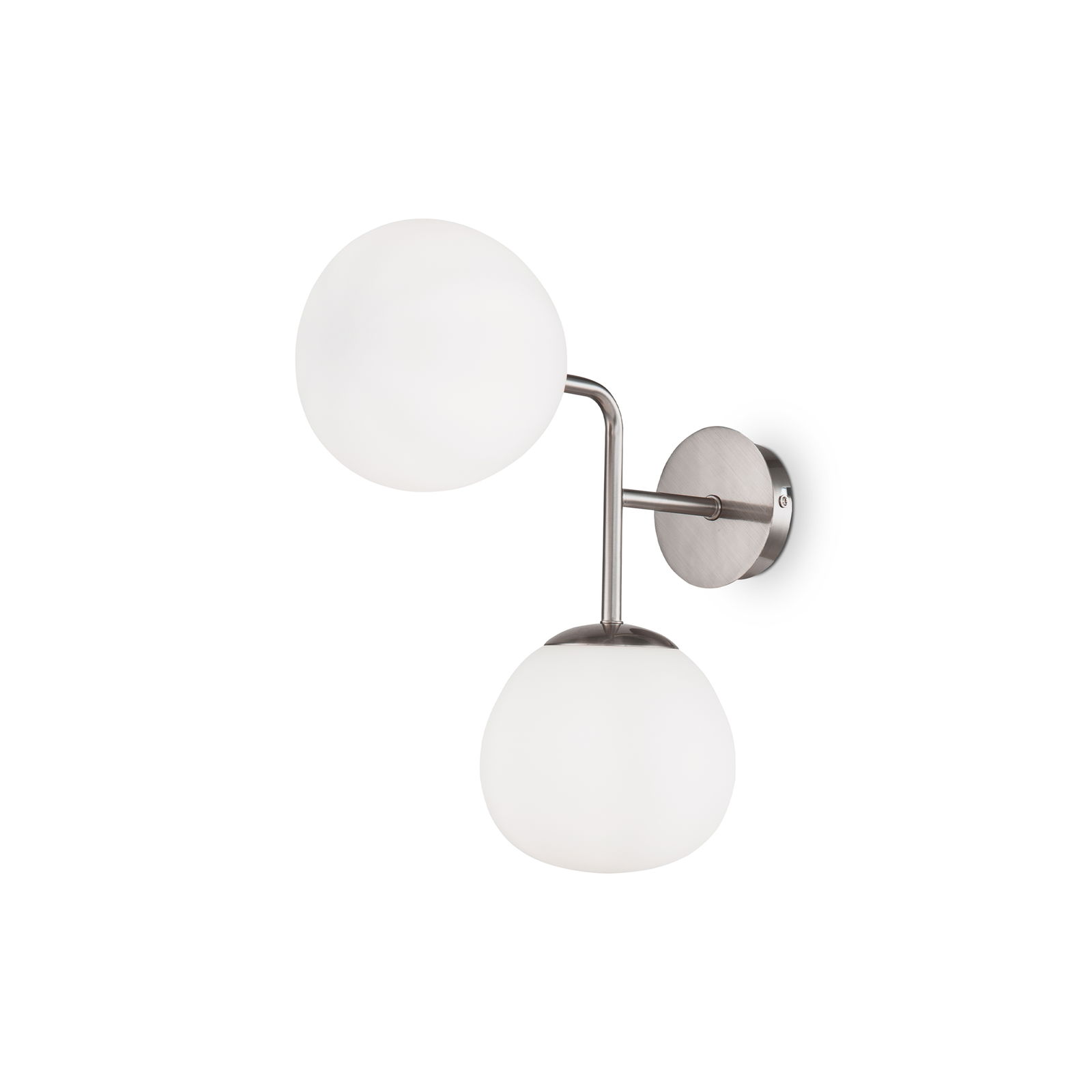 The Erich 2 Light Wall Lamp is 15cm wide with nickel metal arms. It has two white opal glass globes that point down and outward on a curved arm. You can install this the opposite way if you prefer the glass pointing upward.