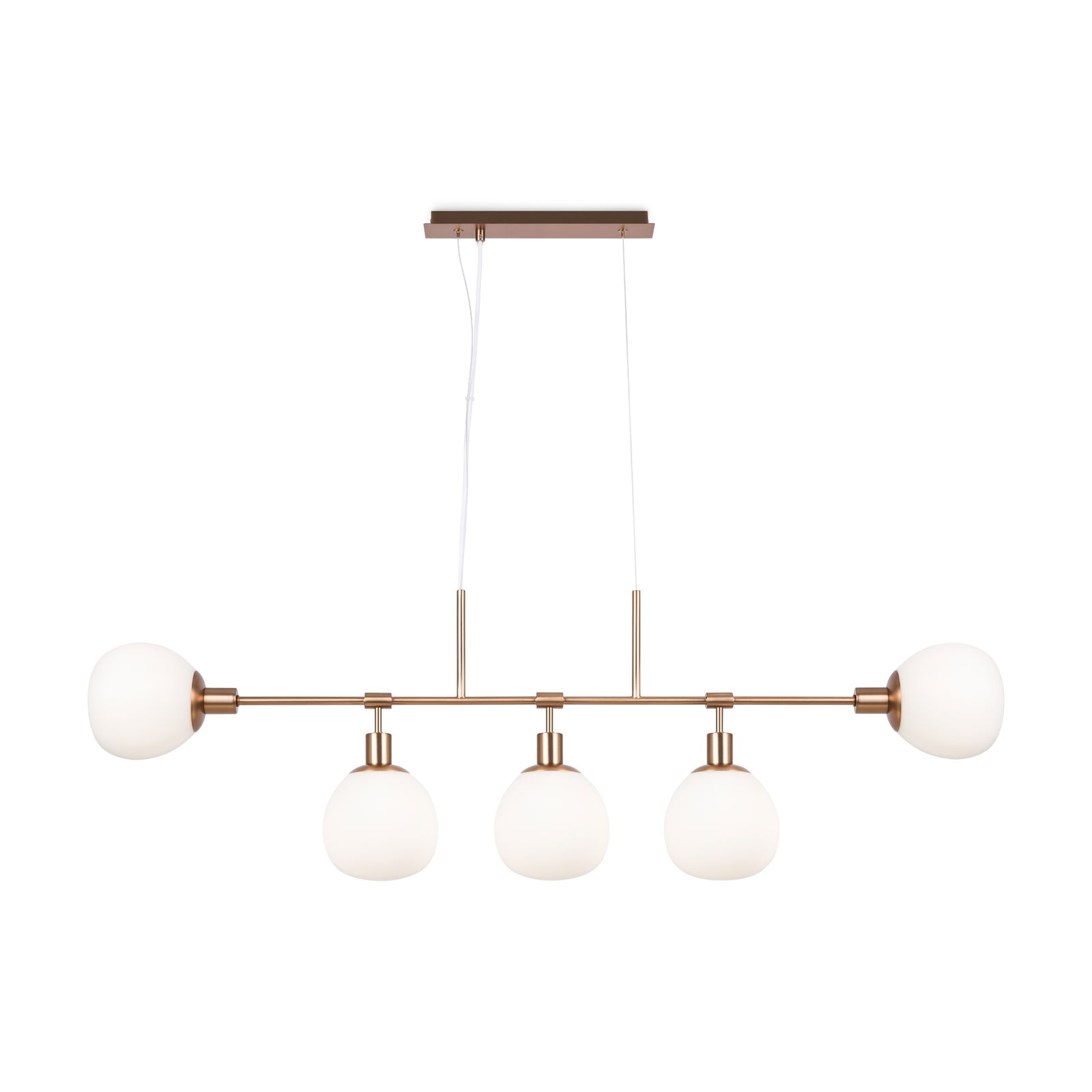 The Erich Gold Bar Glass Pendant Lamp is 120cm wide and comes with five white opal glass globes which sit along a horizontal bar pointing downward and outward.