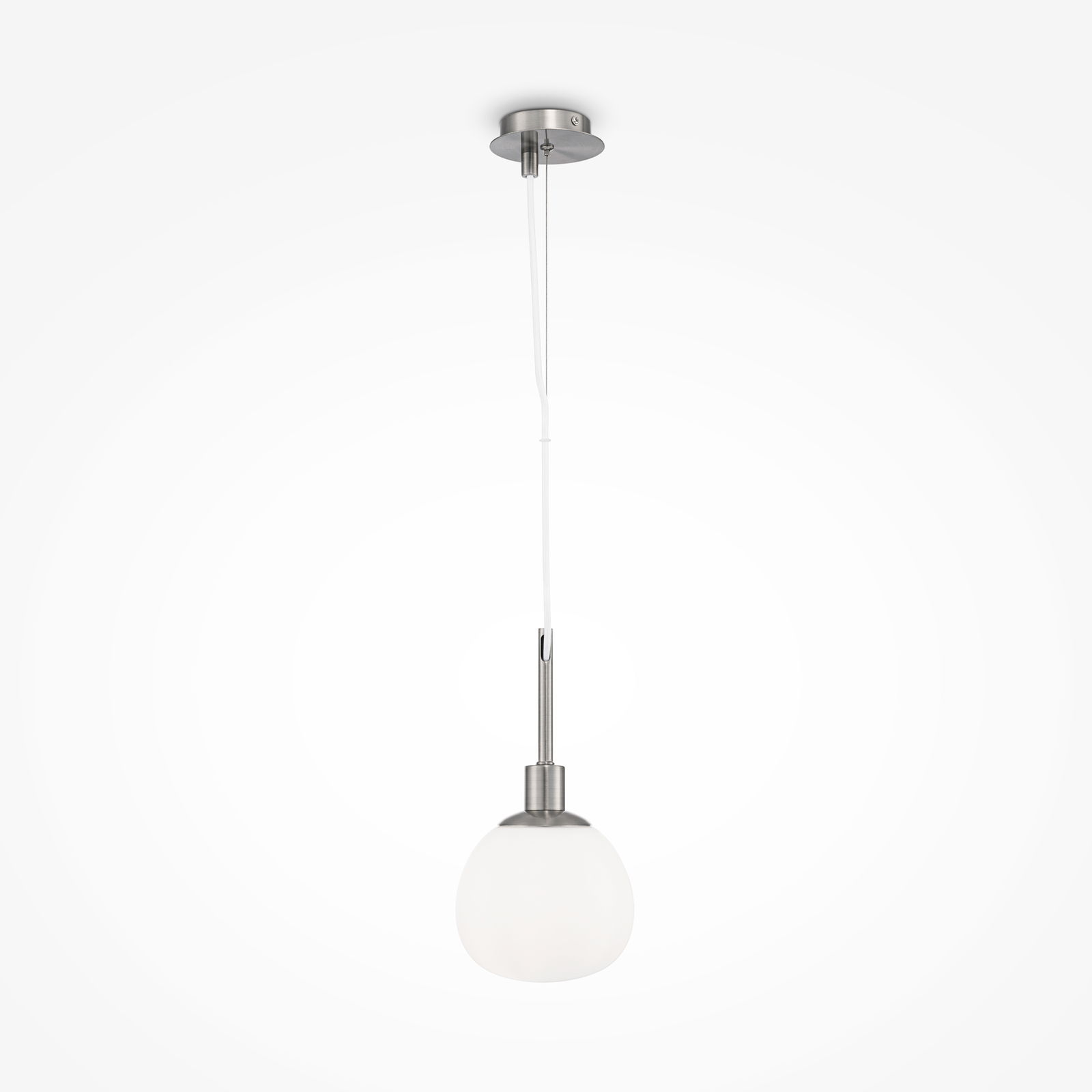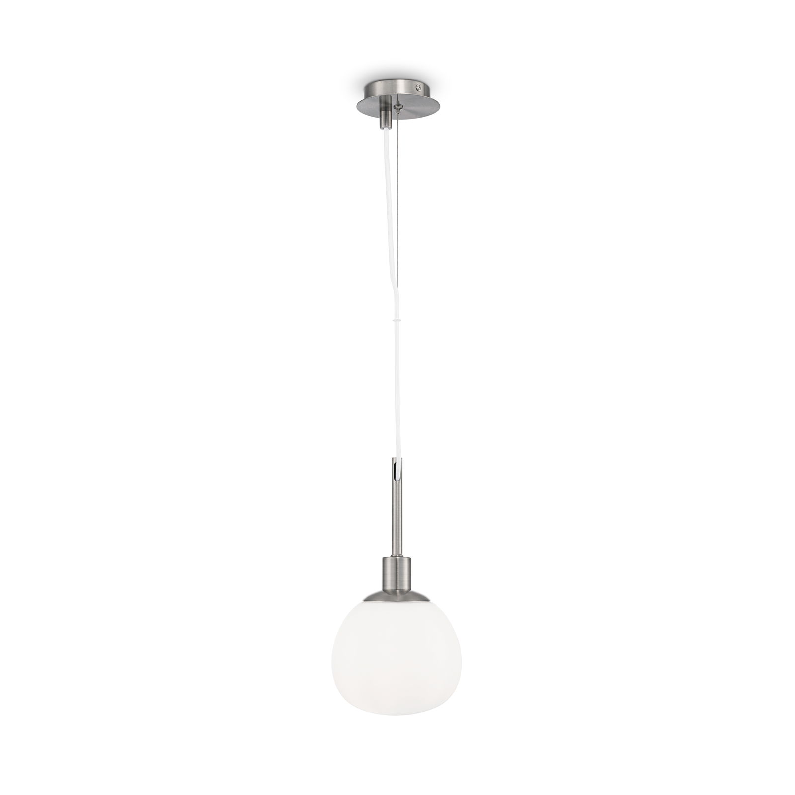 The Erich Nickel Single Pendant Light hangs on clear and steel cables and has one white opal glass globe in a brushed nickel cup.