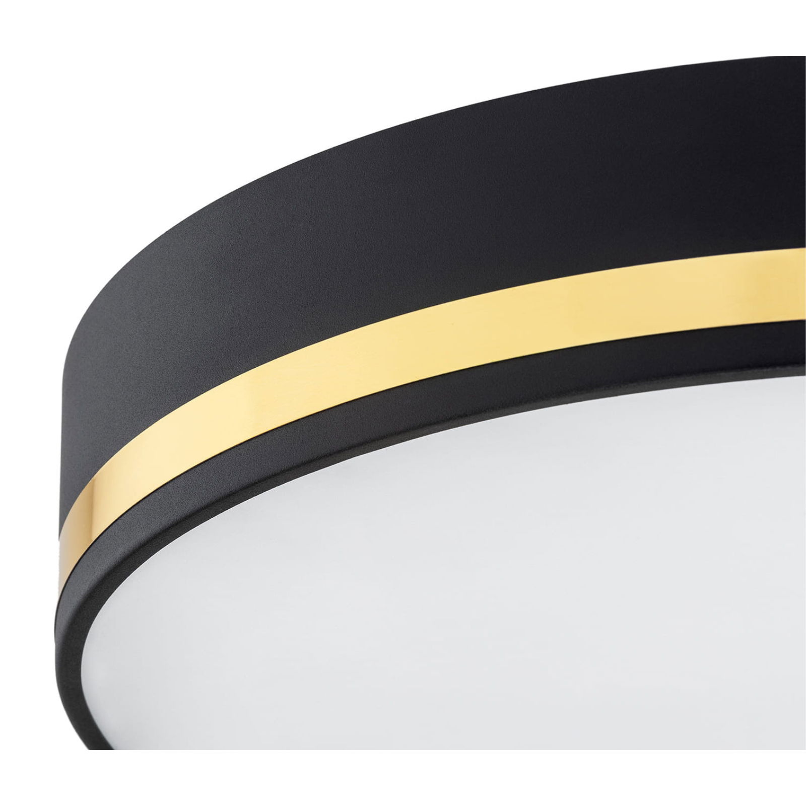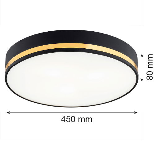 The 45cm wide Erome Large Flush Ceiling Light comes with three lamp holder fittings, which sit inside a round opal cover, which sits inside a round black and gold trimmed flush ceiling fitting.