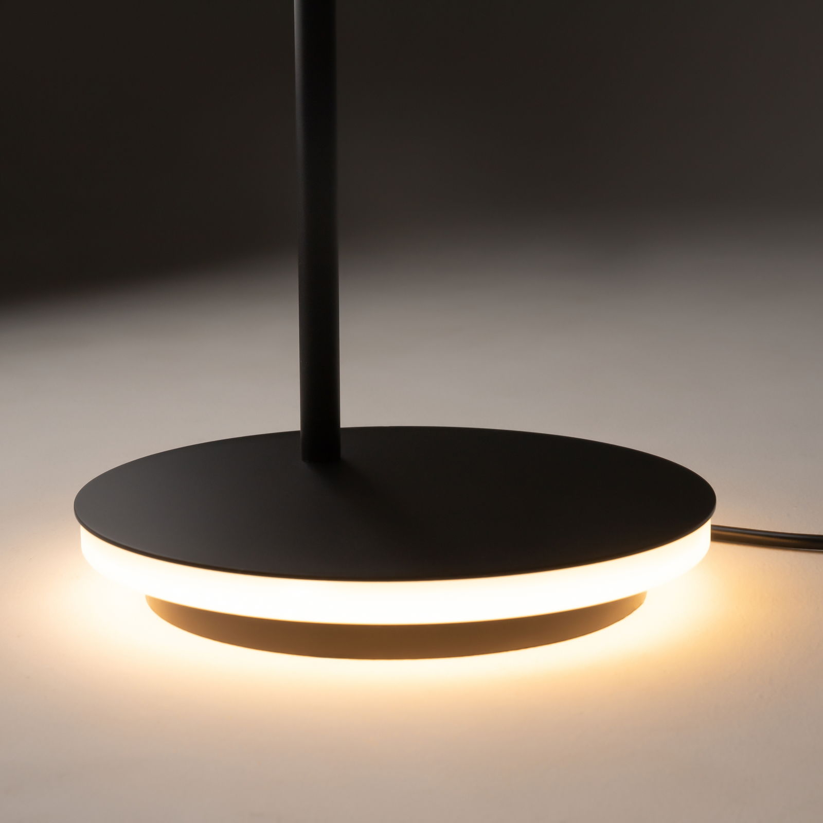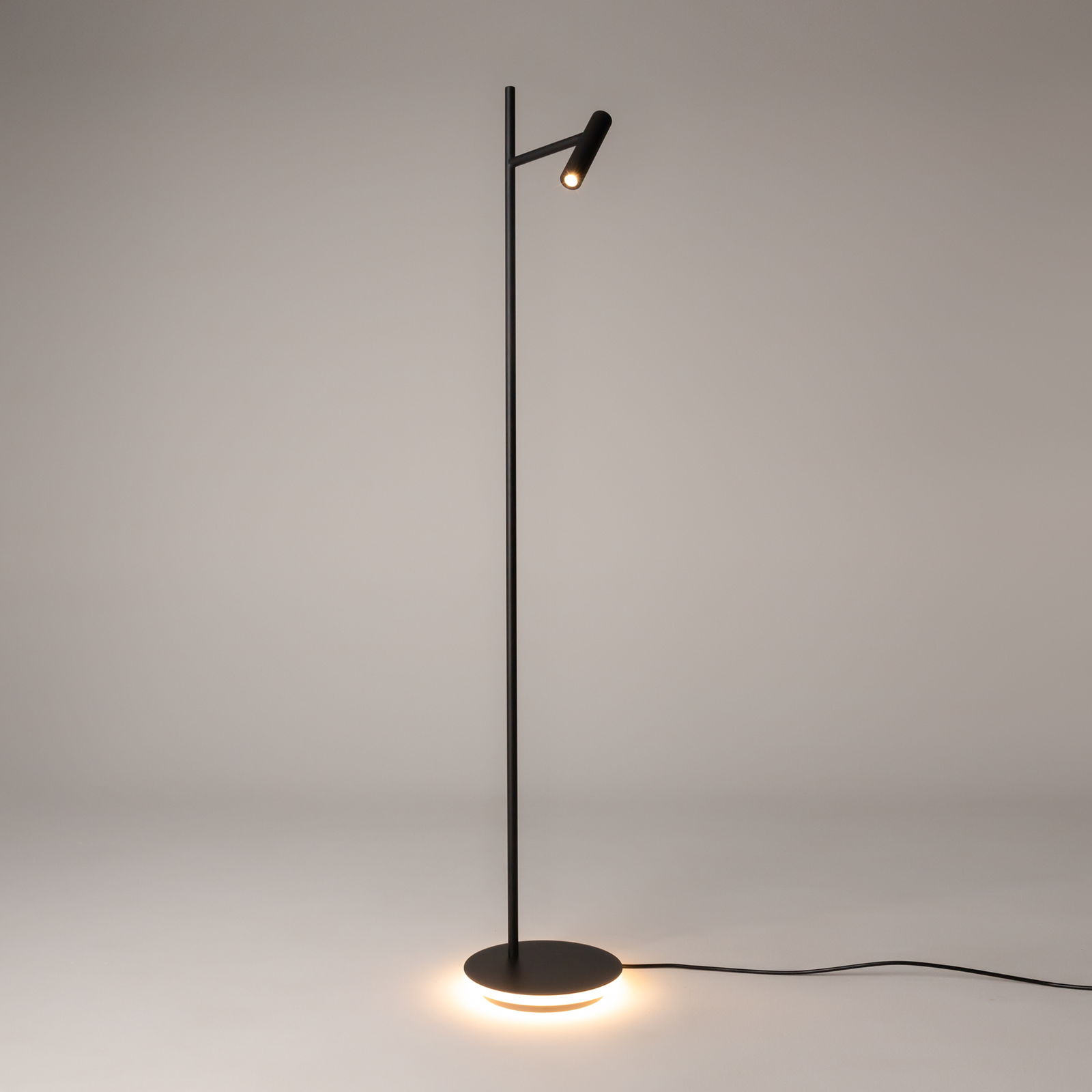 The Estudo Black LED Floor Lamp is 138.7cm tall with an adjustable black metal head. The lamp has integrated warm white LEDs on the top spotlight and also on the base, which creates a warm glow around the bottom.