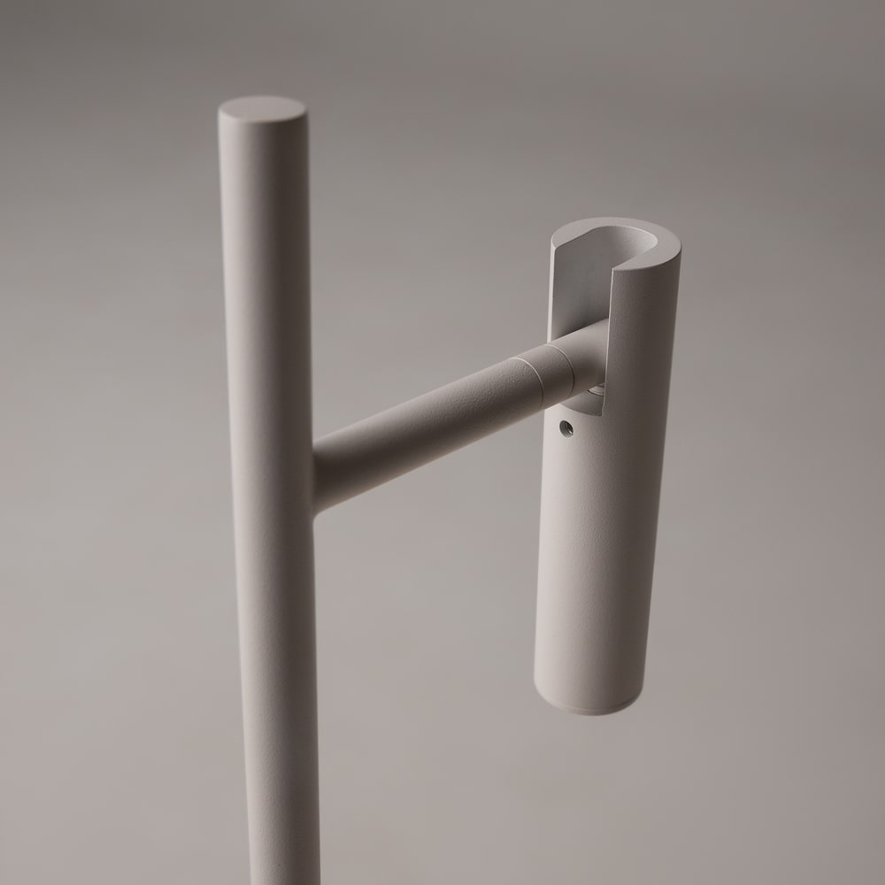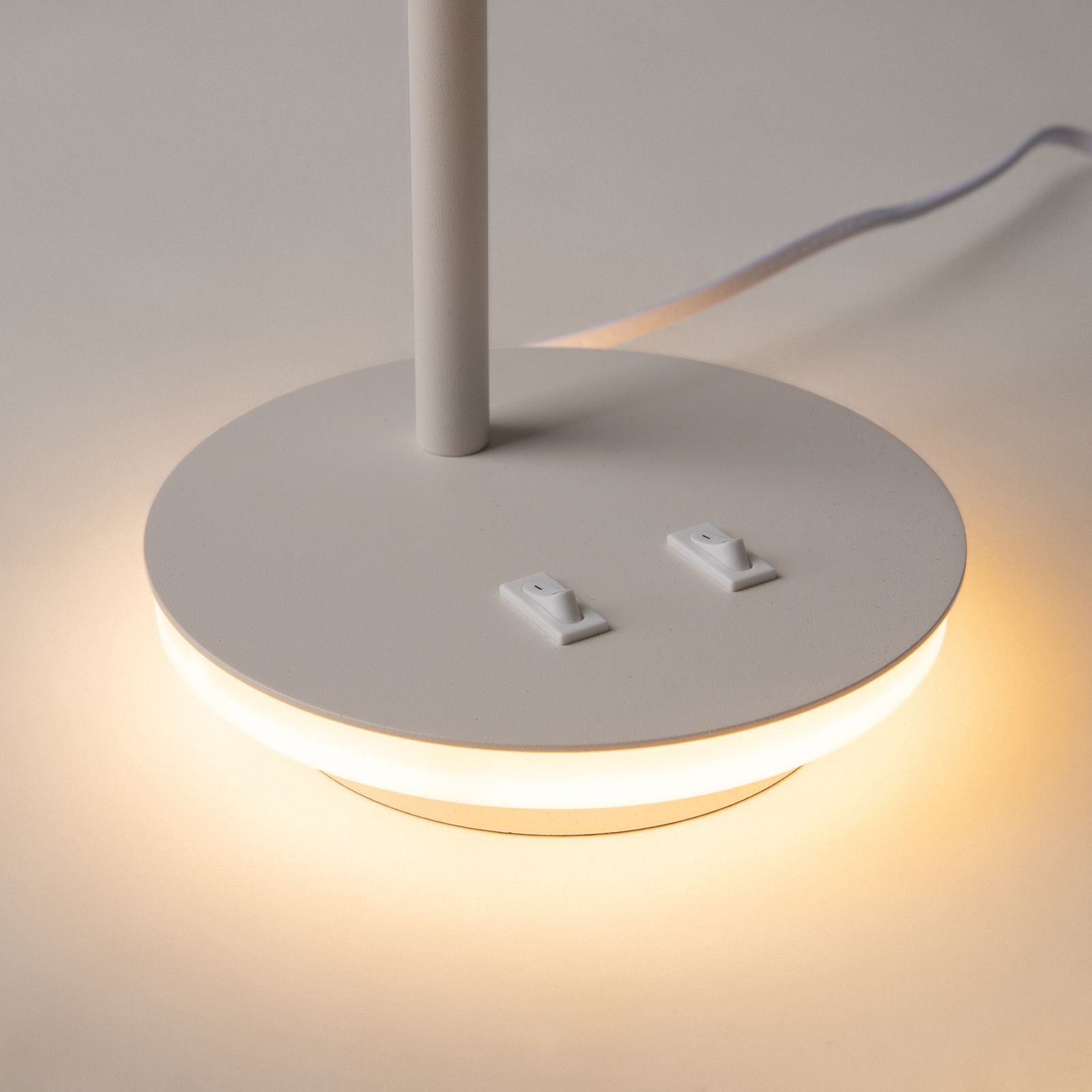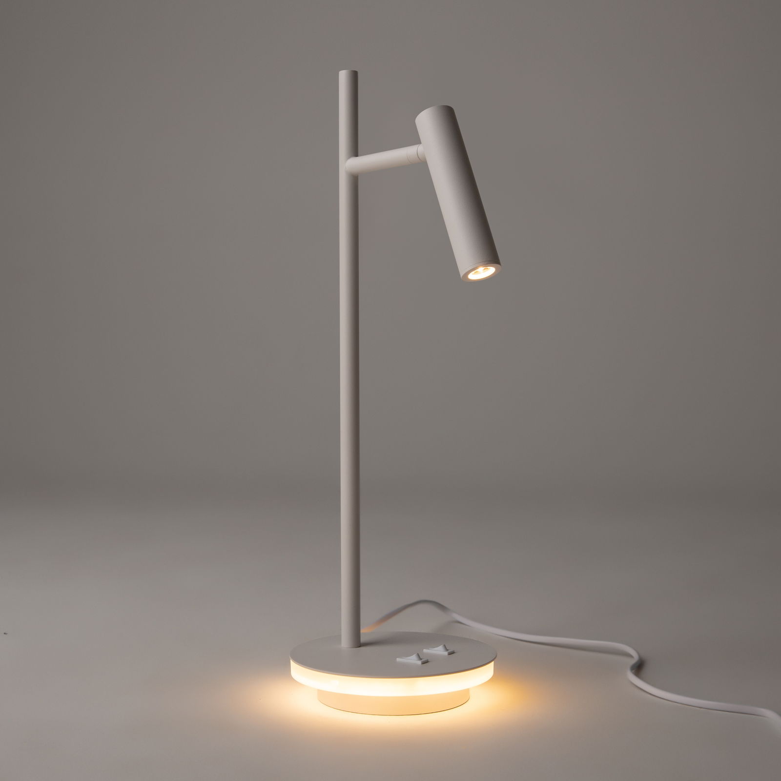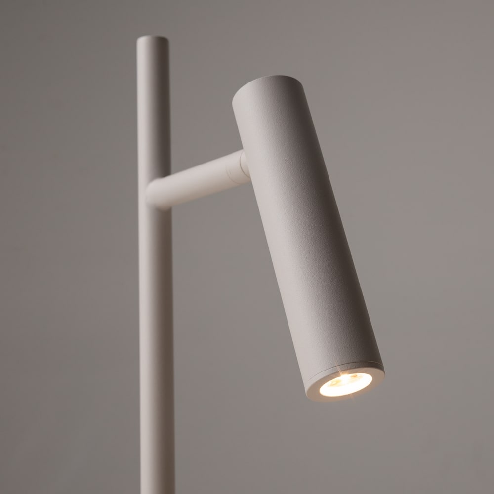 The Estudo White LED Table Lamp is 45.5cm tall with an adjustable metal head. The desk lamp has two integrated warm white LEDs located in the head and the base, which can both be switched independently. The base LED provides a warm ambient light to the surface.