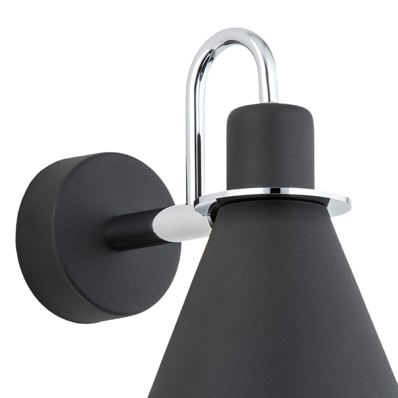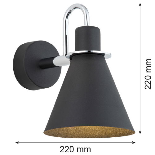 The Black & Chrome Everly wall light comes with a looped chrome arm which holds a 14.5cm wide black cone shade. The interior of the shade is also black and it has a single lamp holder inside the shade. As standard the wall light does not come with a built in on/off rocker switch and it is controlled by a wall switch or dimmer. If you would like to add an on/off switch this can be manufactured within 3-4 weeks. Please contact our sales team prior to placing your order if you would like to add this option.
