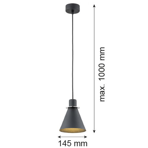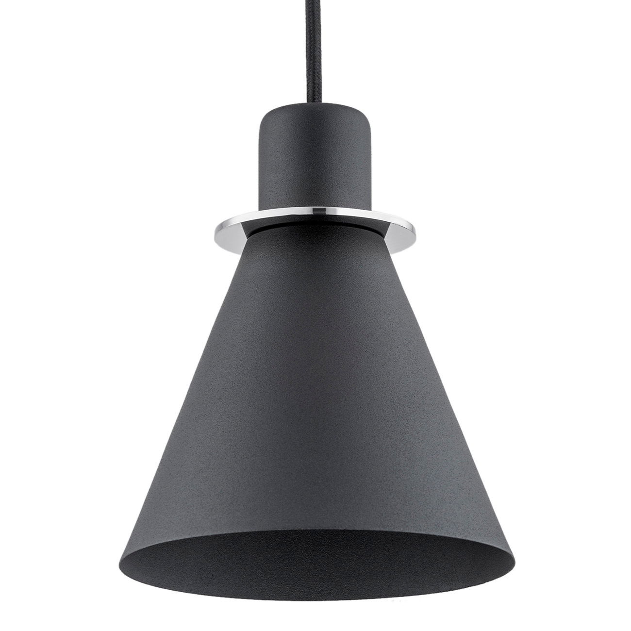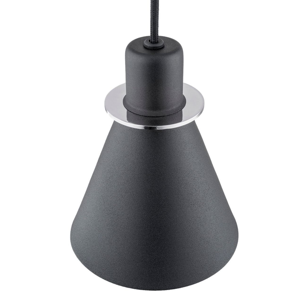 The Everly Black & Chrome Pendant Lamp has a conical shade in black steel. It is 14.5cm wide. The shade hangs from a round black ceiling rose. A chrome ring separates the shade from the cylindrical holder and the cable is 80cm long which can be adjusted.
