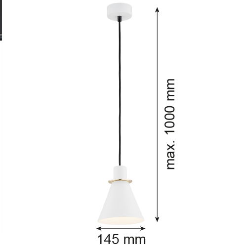 The Everly White & Brass Pendant Lamp is 14.5cm wide and it has a fluted cone shade with a brass ring that sits between the white mount and shade. The black cable drops 80cm; however, it can be shortened. If you require a longer cable length, please get in touch with us with your requirements, as custom lengths can be made within 3-4 weeks.