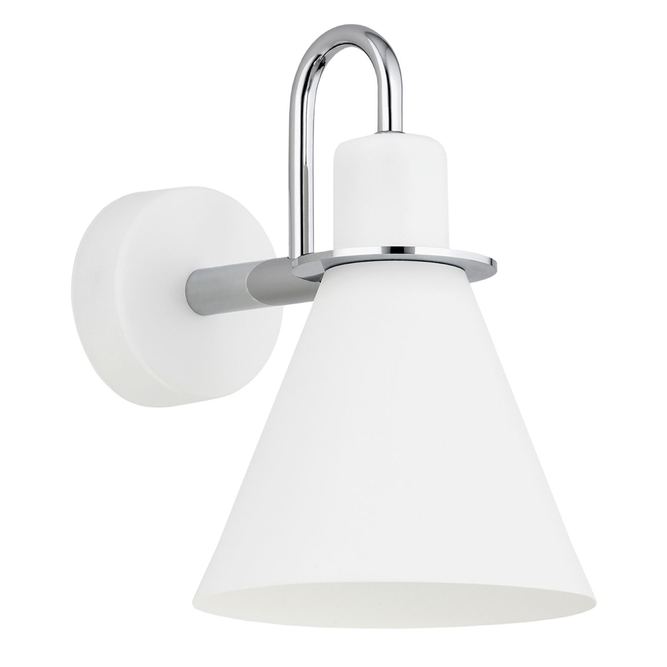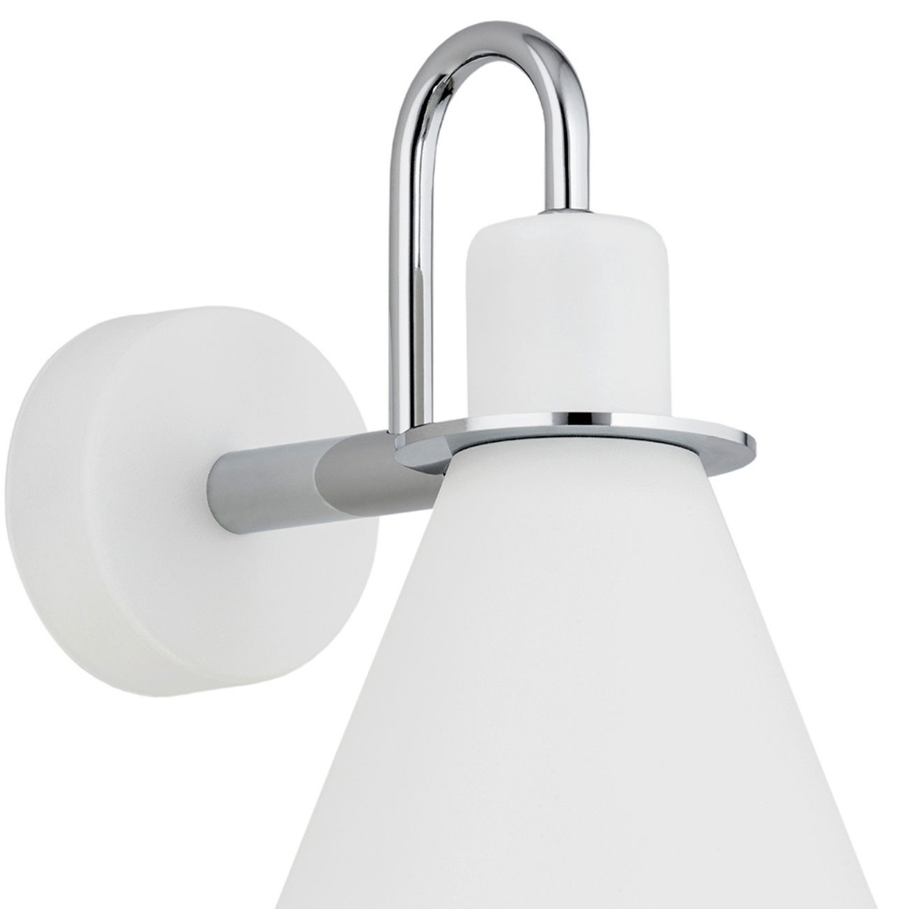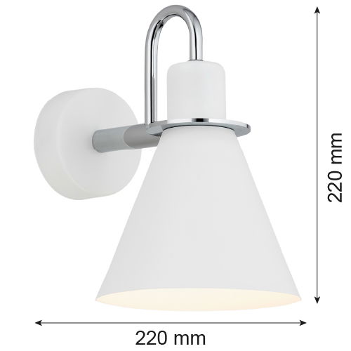 The White & Chrome Everly Wall Light has a cone shaped shade on a chrome curved arm. A chrome ring sits at the shade neck, and the round wall plate is white. The wall lamp has an option to add an integrated on/off rocker switch, which can be made within 3-4 weeks. Please get in touch with our sales team before placing your order if you require this option.