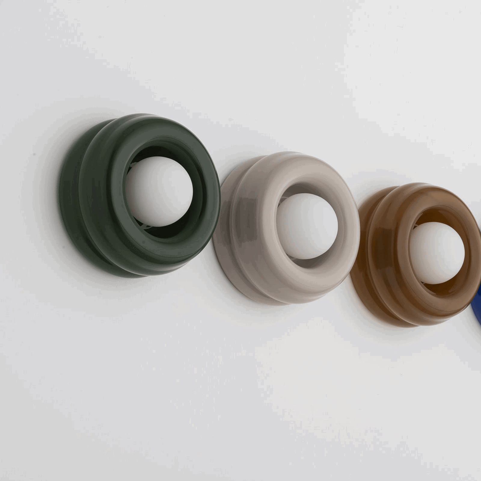 The green Evo Circular Wall Light uses dark green and opal glass layers in a circular design. The wall light mounts close to the wall and takes a G9 capsule bulb, which sits within the opal sphere shade in the middle.