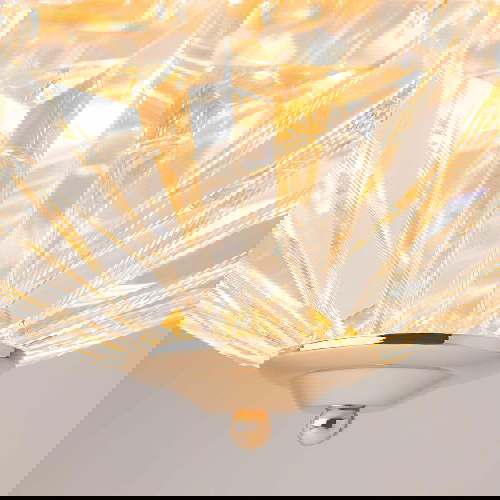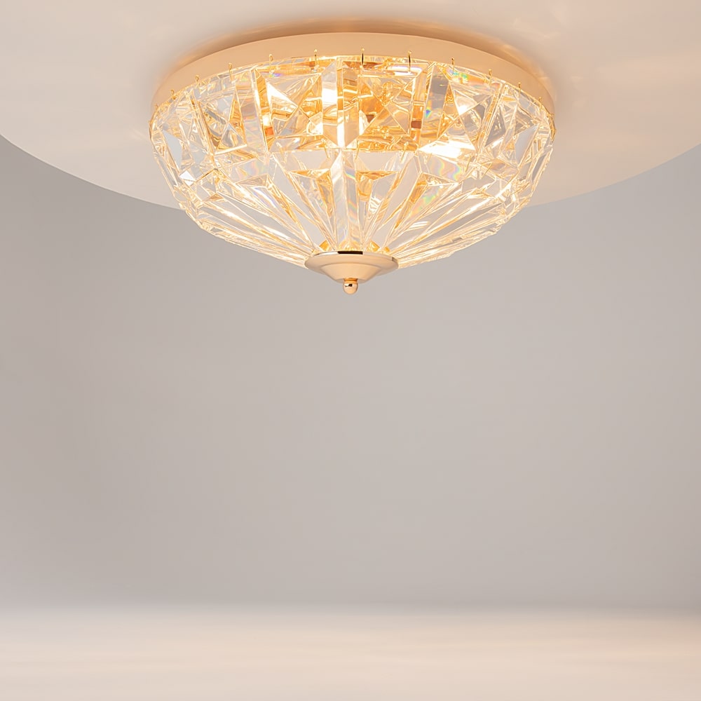 The Facet 4 Lamp Flush Ceiling Light sits close to the ceiling and has a bowl-shaped frame with faceted crystal glass which surrounds a gold rim.