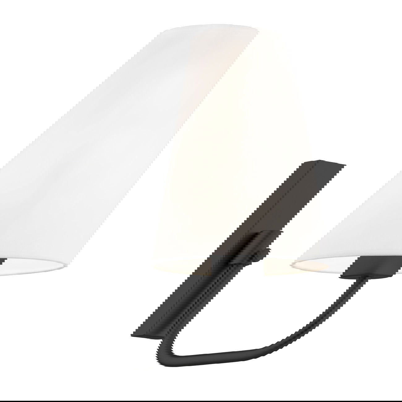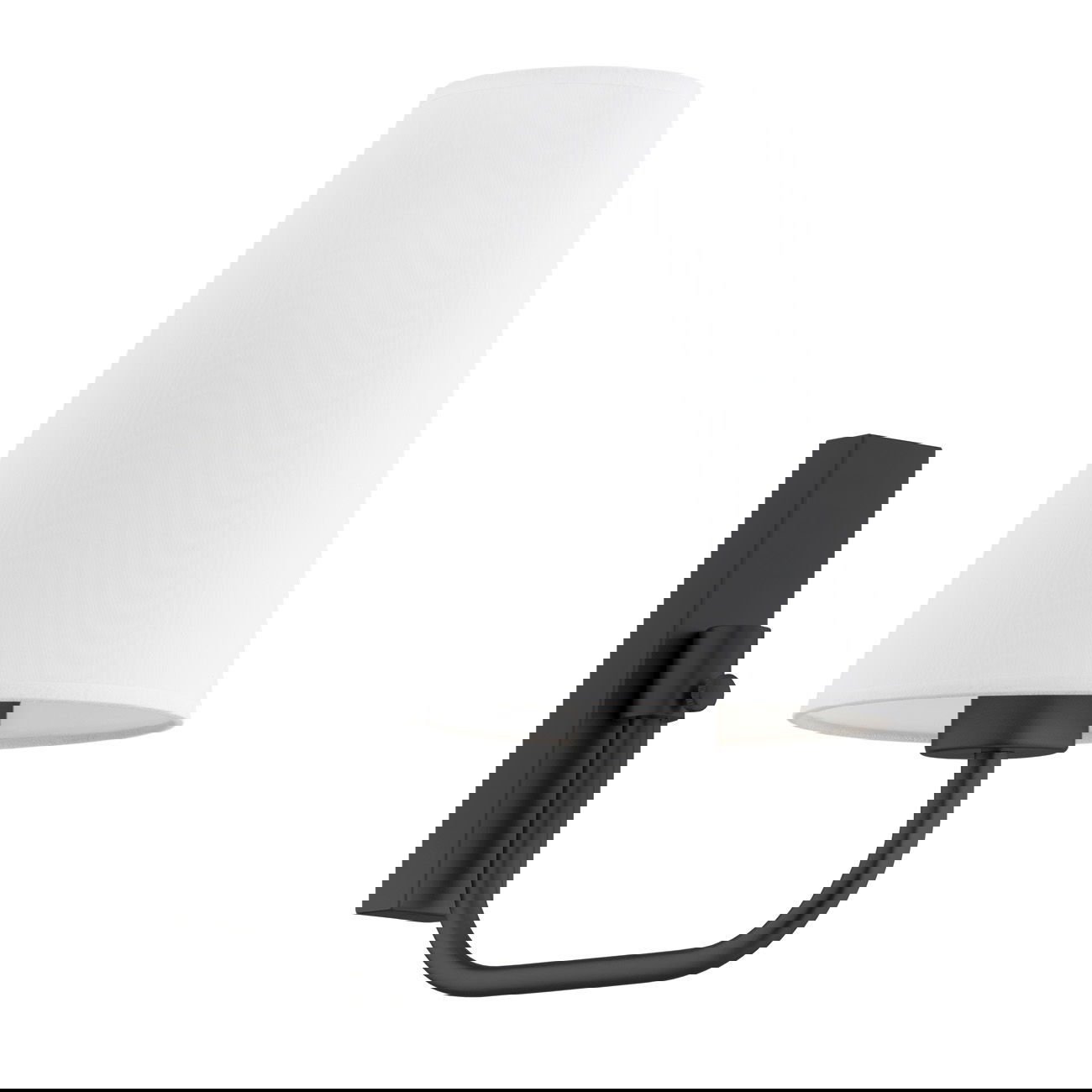 - The wall mount has a black finish, while the shade is white fabric.