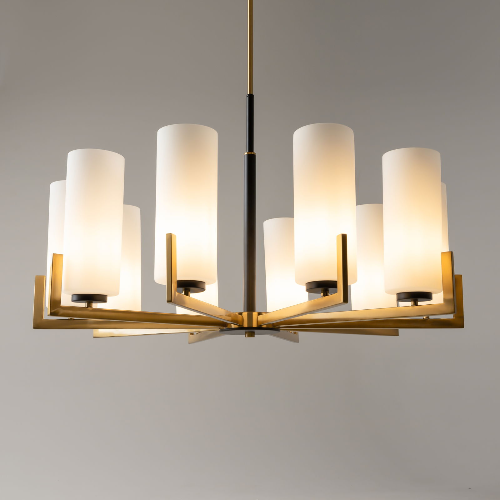 The Fortano 10 Light Chandelier has ten white glass shades on brass arms. The frame is made of metal with black and brass colours.
