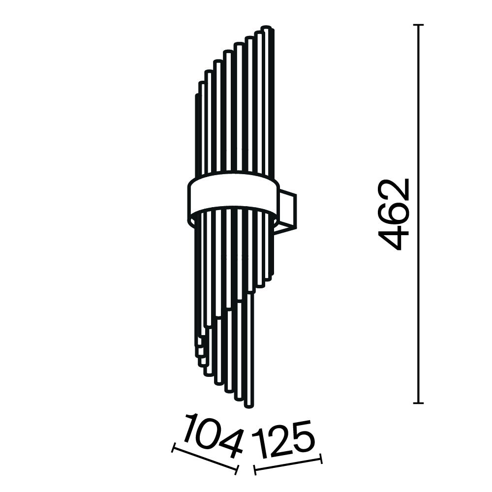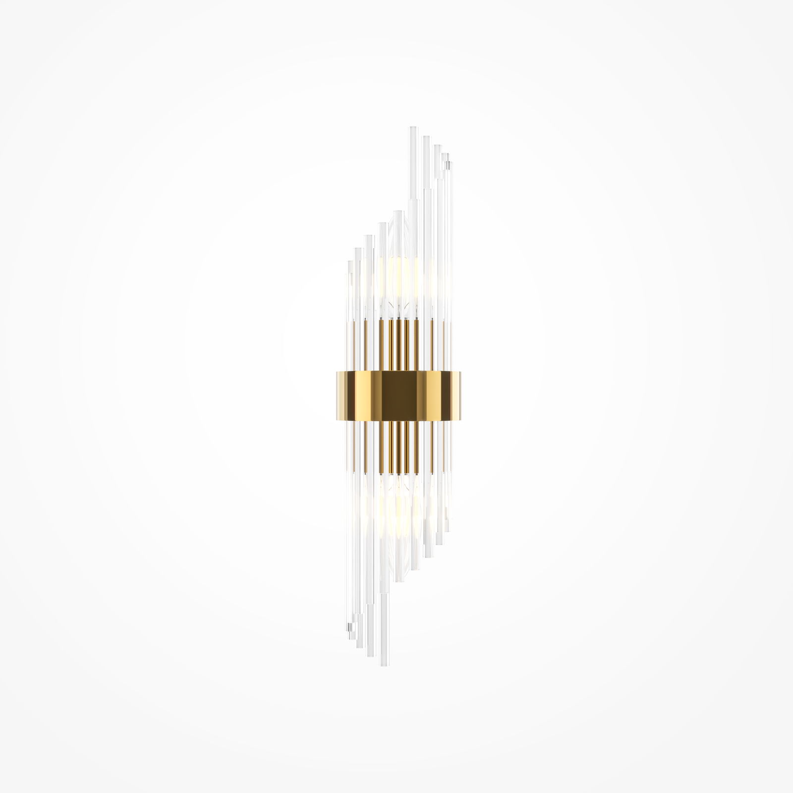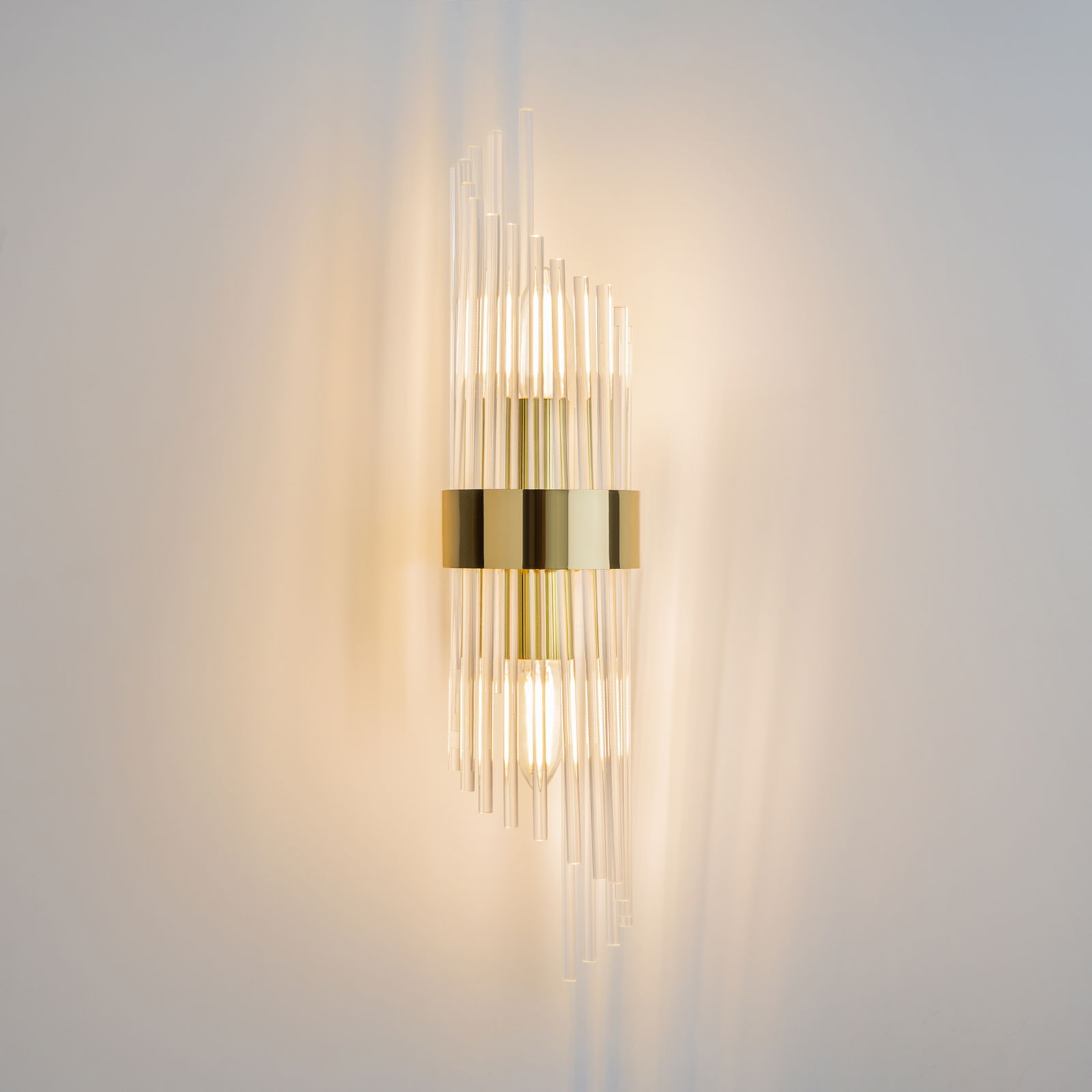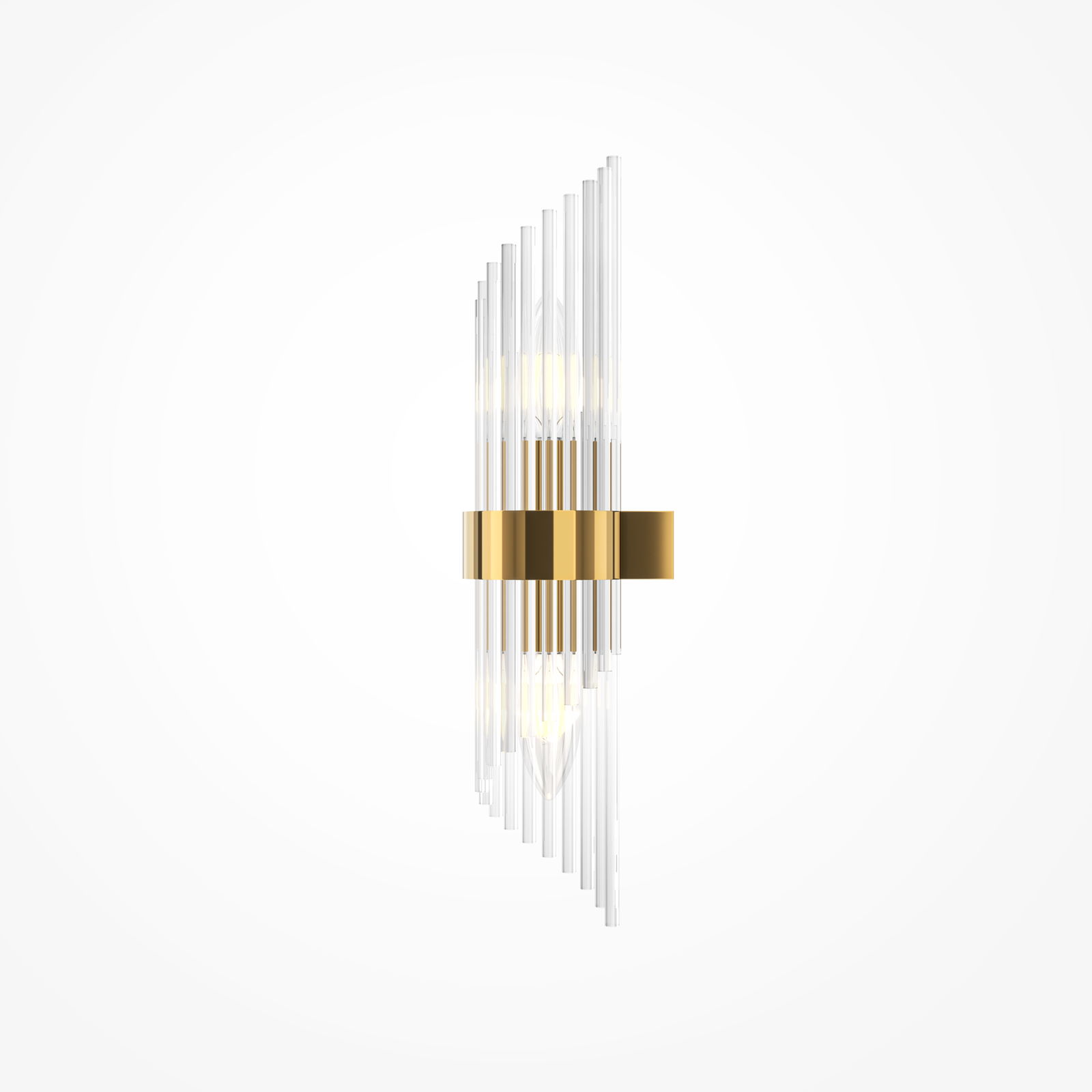 The Frame 2 Lamp Wall Light is 10.4cm wide and has two clusters of vertical clear glass rods above and below a central gold metal wall bracket, with longer rods in the middle and shorter rods at the edges creating a tapered spiral effect.