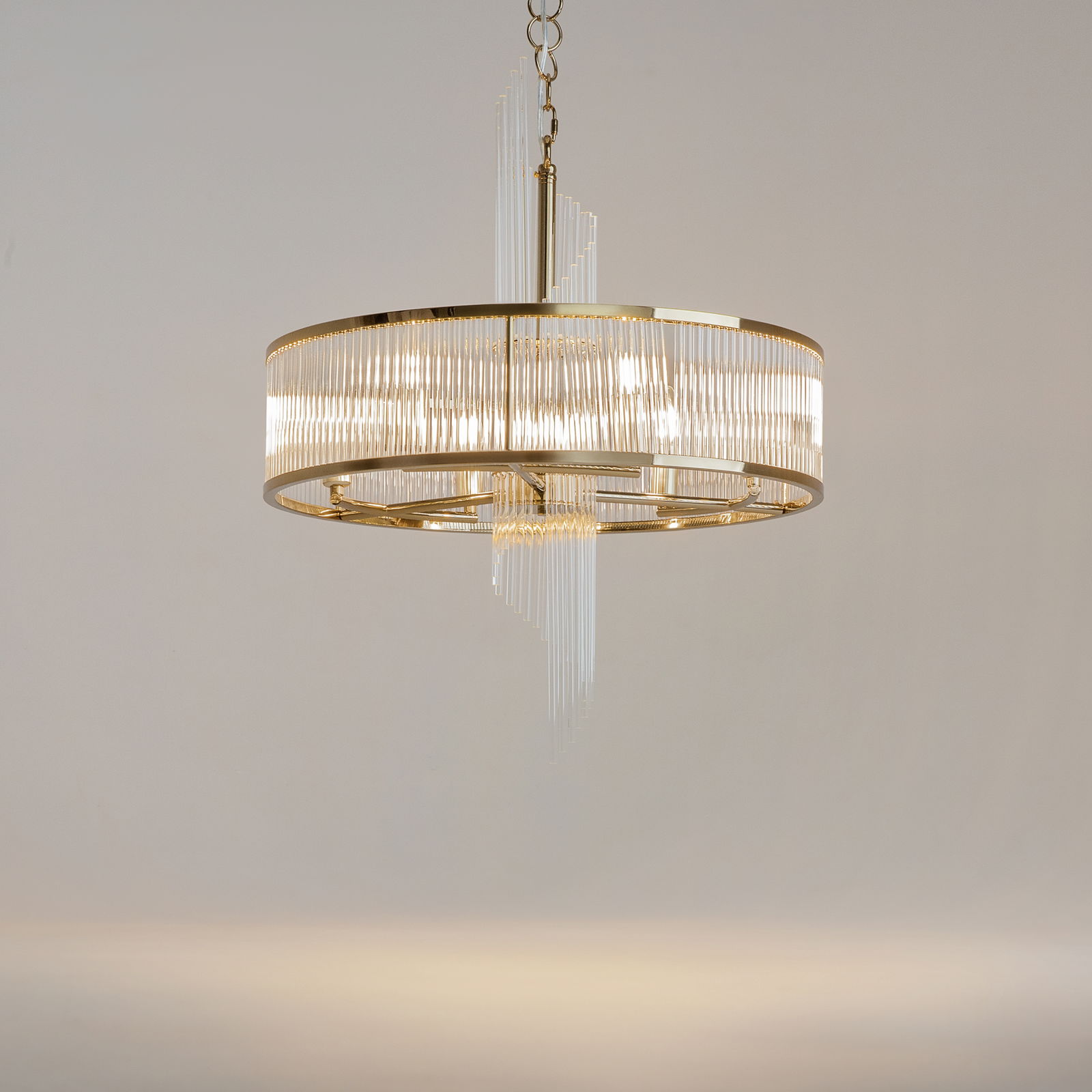 The Frame 6 Light Round Chandelier is 58cm in diameter and has two gold metal circular rings positioned one above the other, connected by vertical glass, with clear glass rods hanging down between the rings to form a spiral-shaped effect inside the circular drum.
