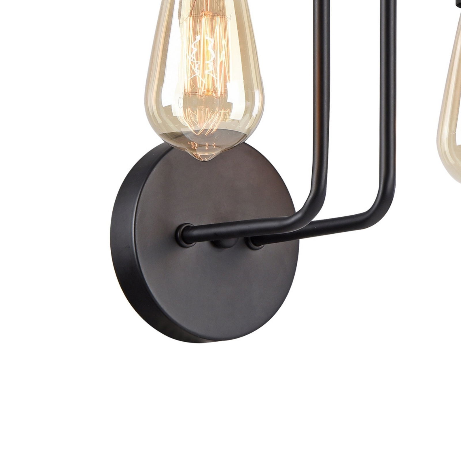 The Gilbert wall light has two black metal arms that curve upwards from a round backplate. Each arm holds one exposed lamp bulb socket in a cylinder shape.