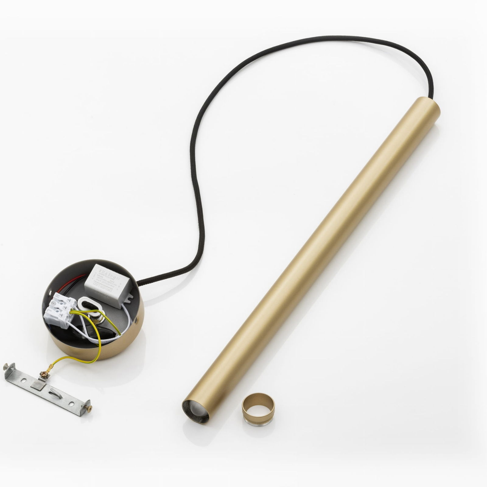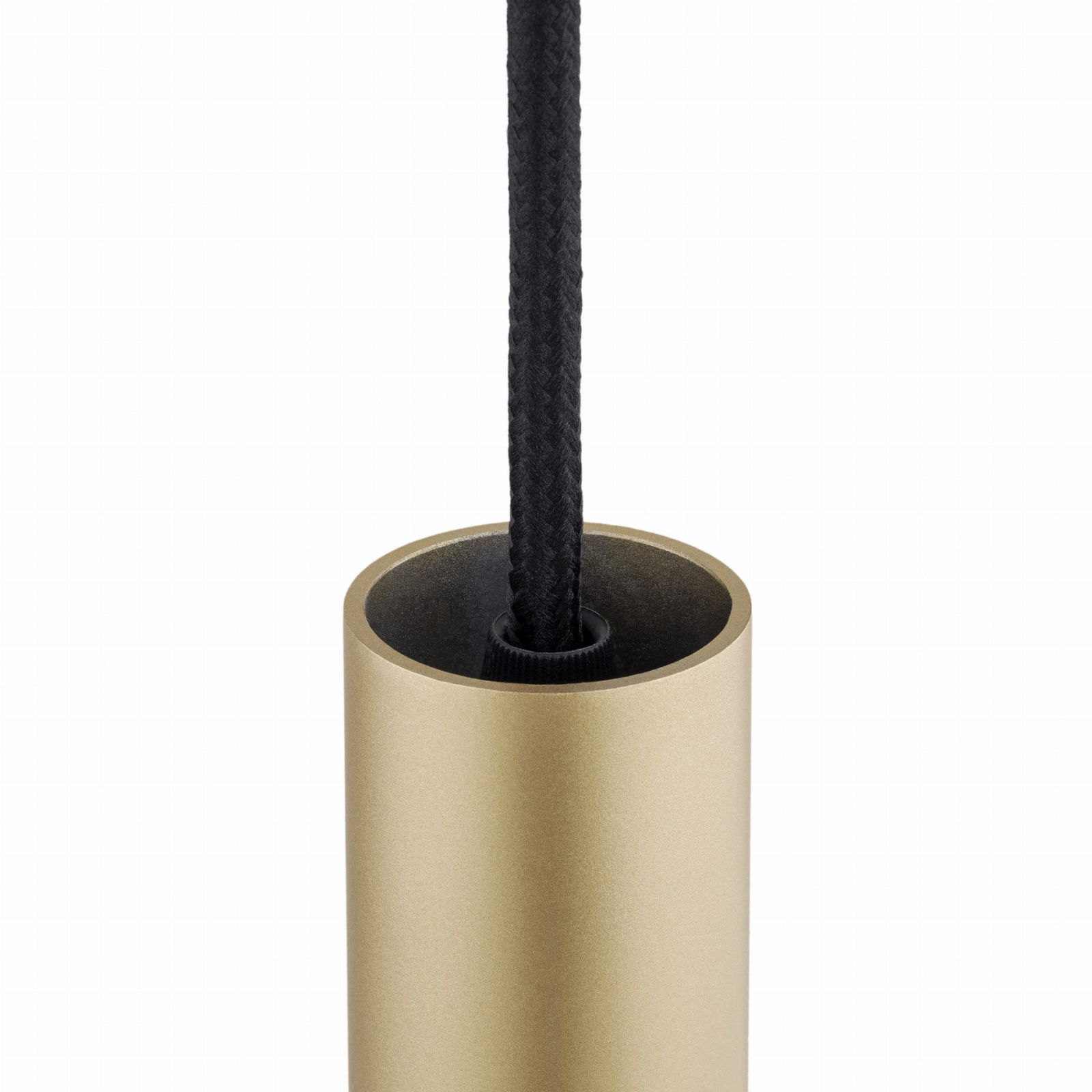 The gold Janiero LED Pendant Lamp uses an integrated 4.2W LED in a gold thin tube. The pendant lamp drops down 133.5cm from the ceiling on an 80cm black fabric cable, which can be shortened at the point of installation.