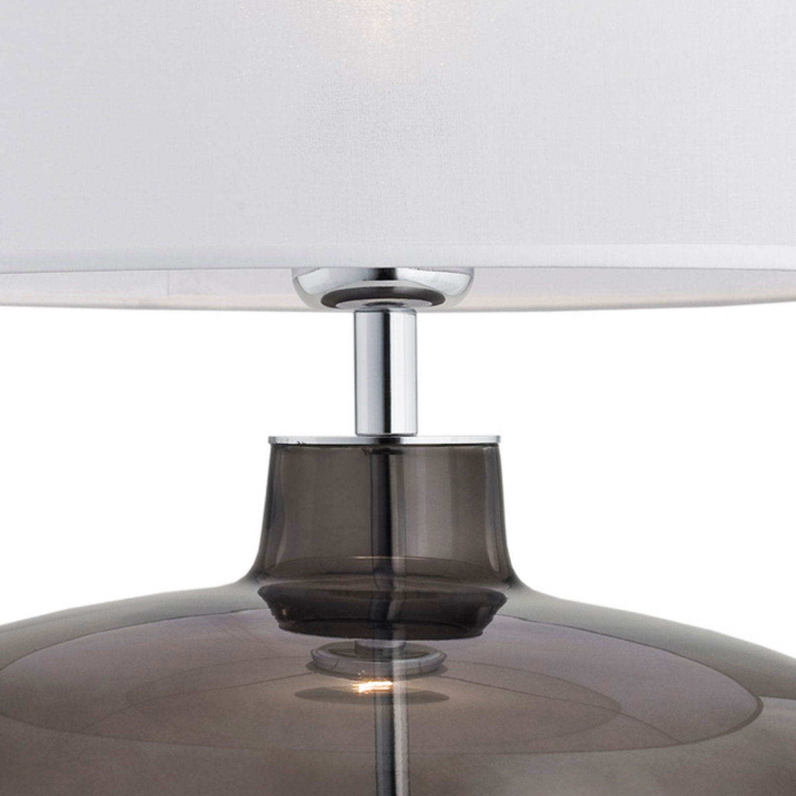 The Kwana Table Lamp has a smoked glass base and a white fabric drum shade. The table lamp also has a polished chrome stem which holds the lampshade and is secured within the base.