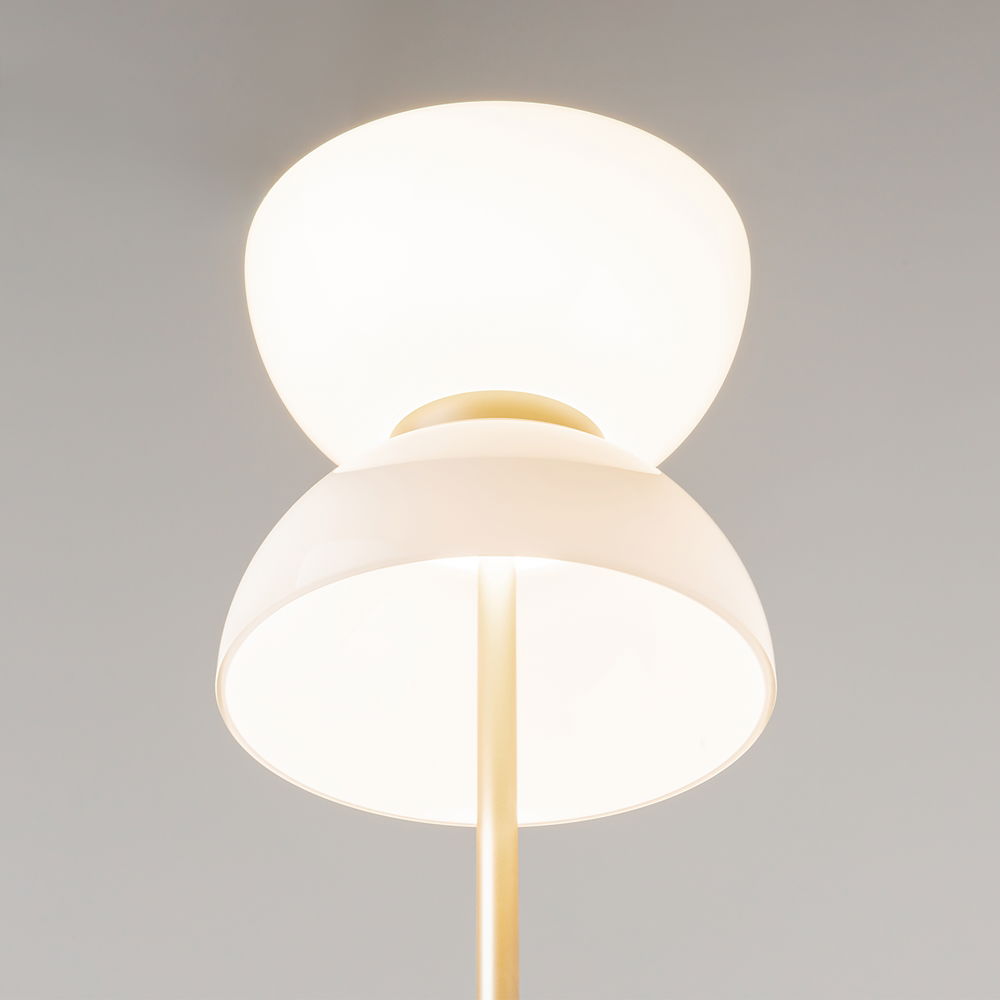 The Kyoto Gold & Grey Marble LED Floor Lamp has a grey marble cylinder base and a slim gold-toned metal pole that holds a double-bowl white glass shade, with the two rounded glass bowl halves joined at a gold metal band partway up the shade body.