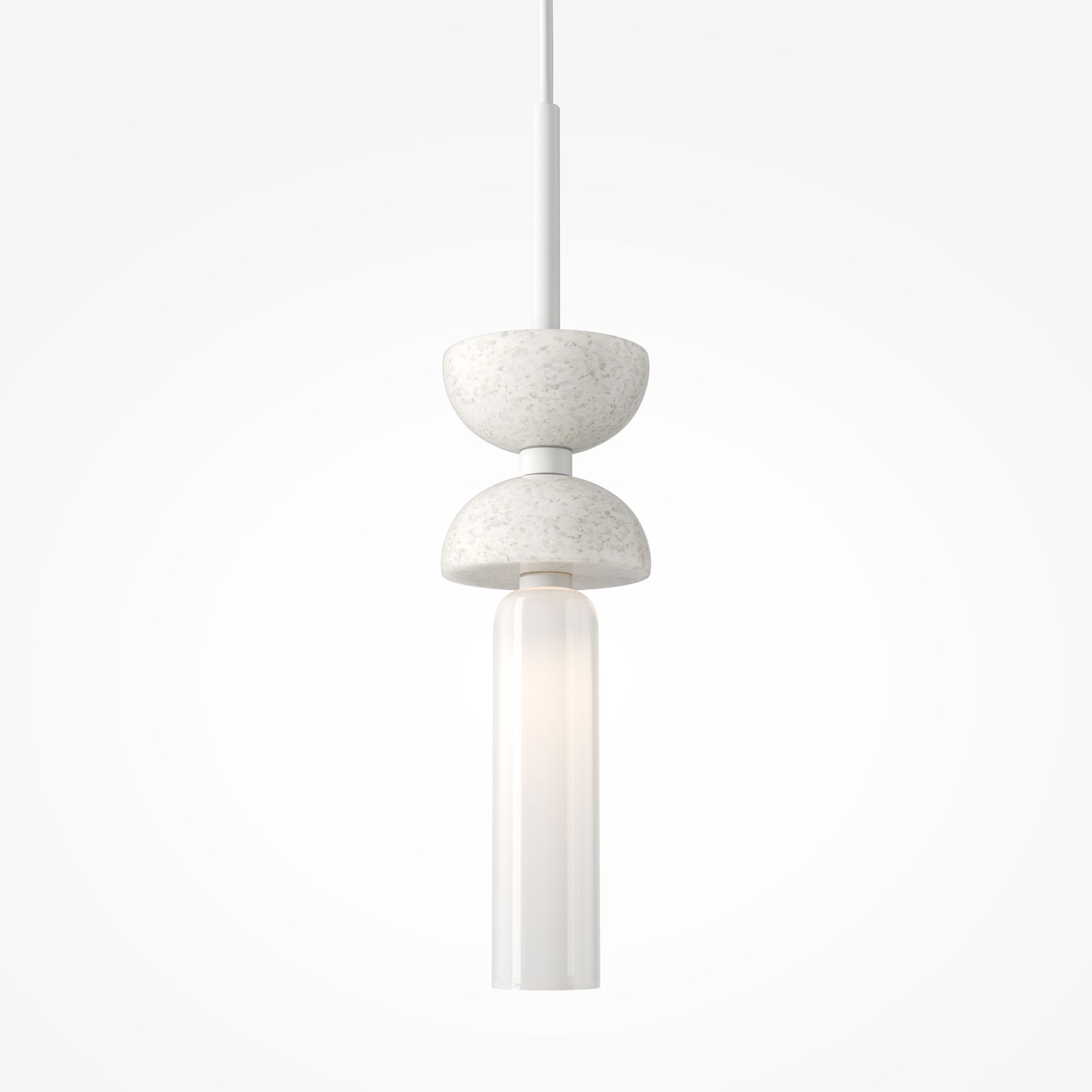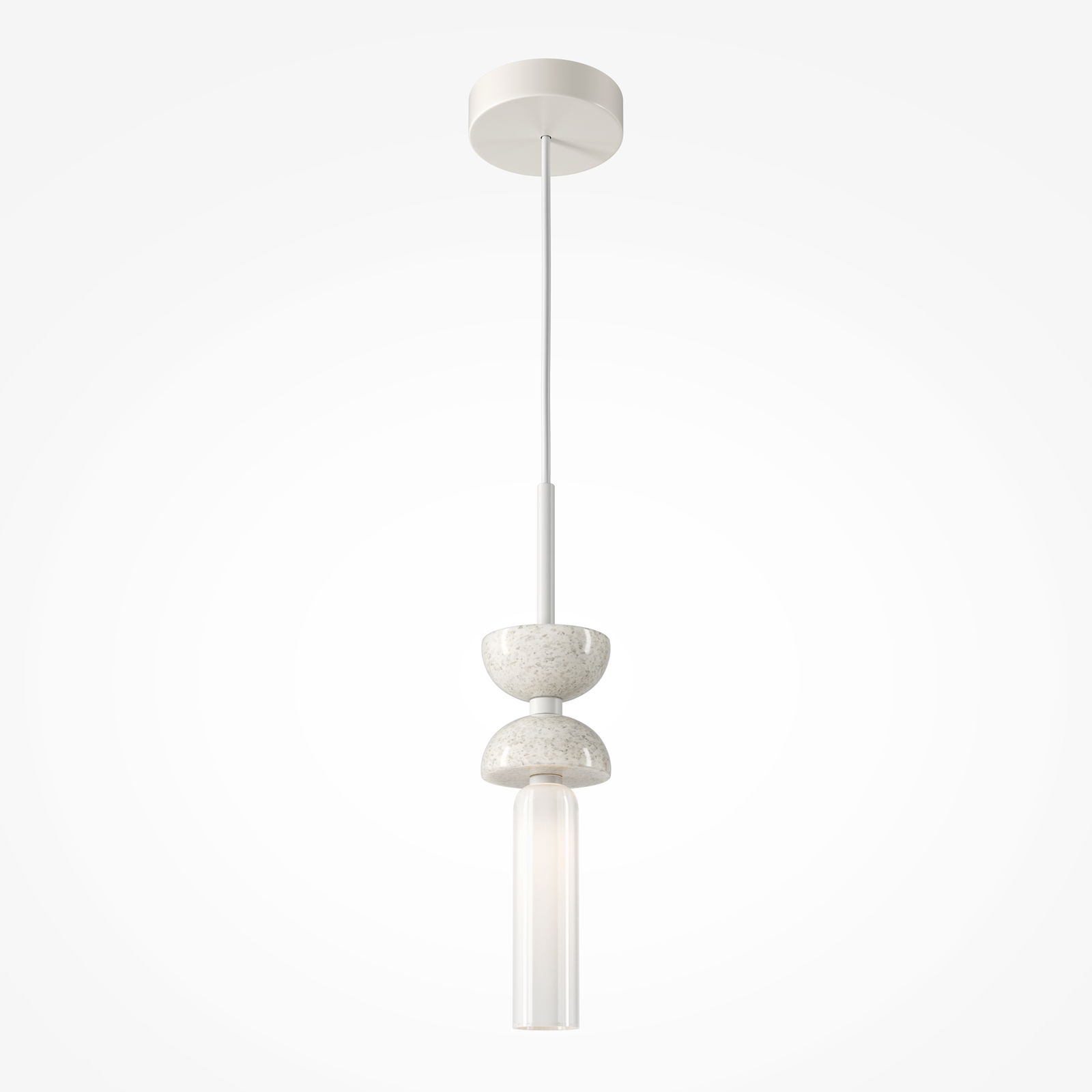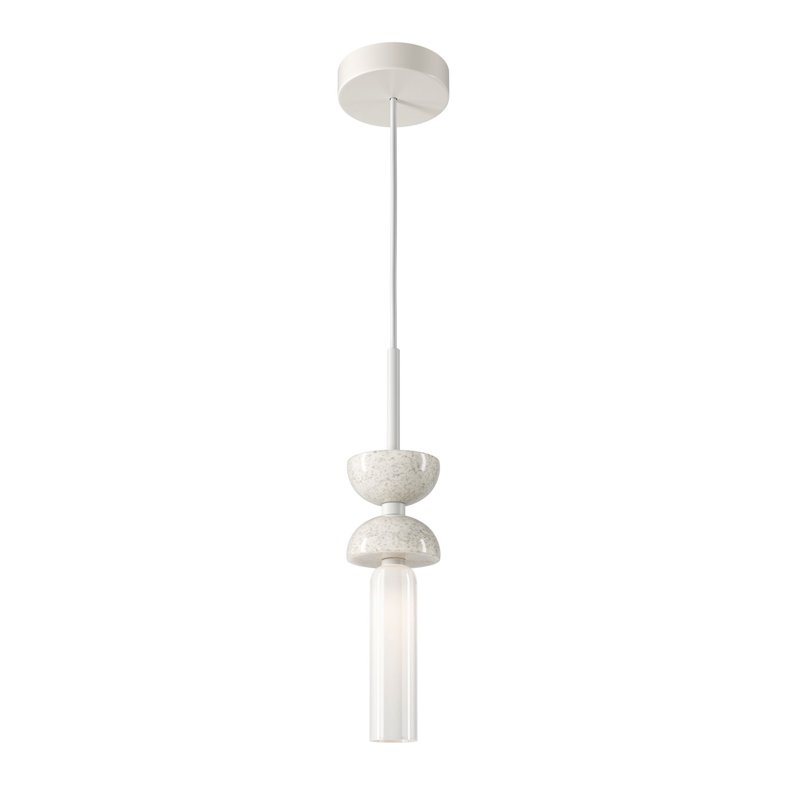The Kyoto White Marble Pendant Light has two stacked, rounded white marble disc shapes, a frosted glass cylinder tube that hangs below the marble elements, and white metal sections throughout, including the flat circular ceiling canopy.