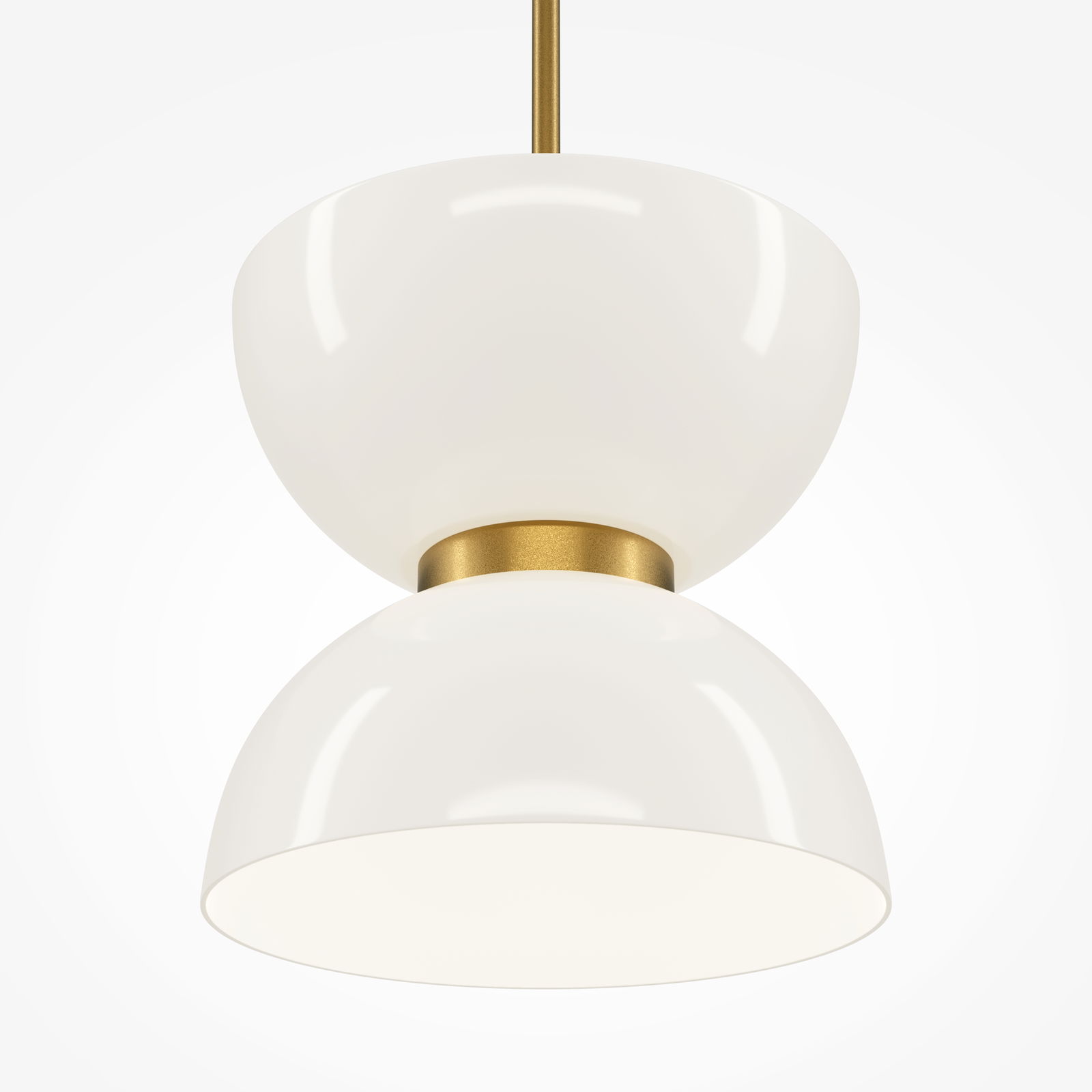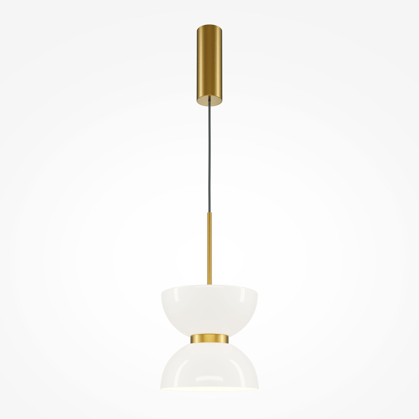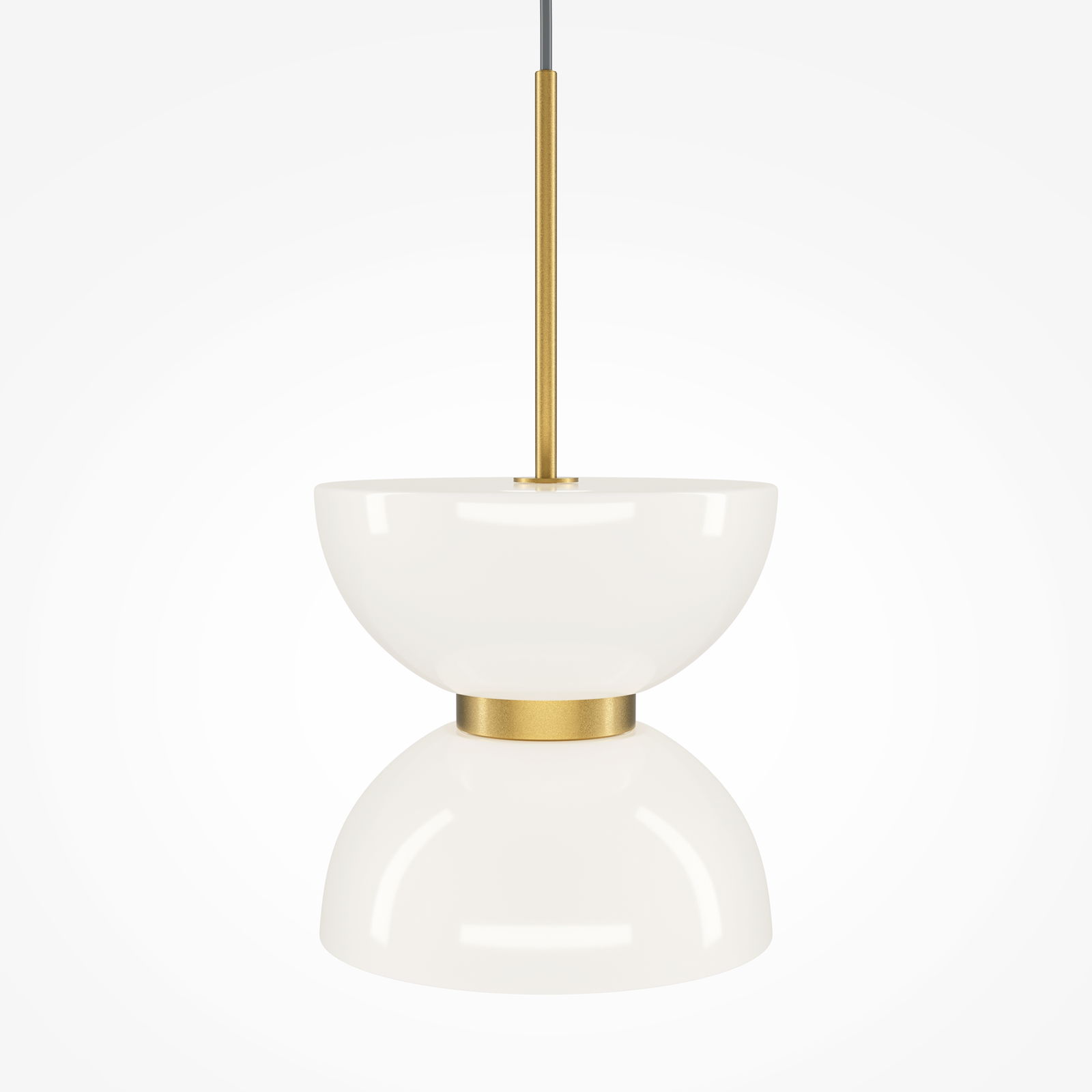 The Kyoto Single Gold & White Pendant Lamp has a double bowl glass shade with a gold coloured canopy, fabric cable, and centre metal connecting ring that sits between the two white glass bowl-shaped halves.