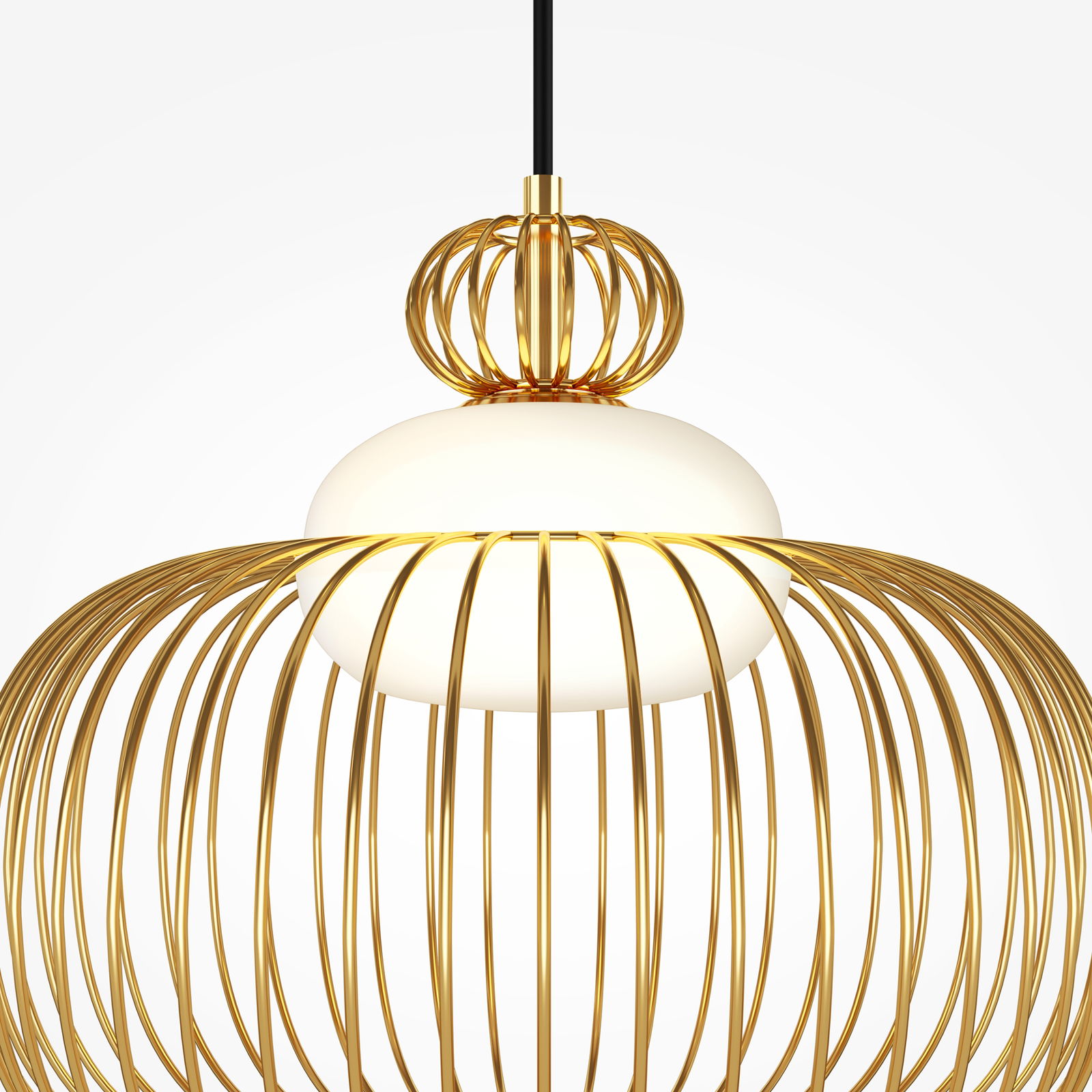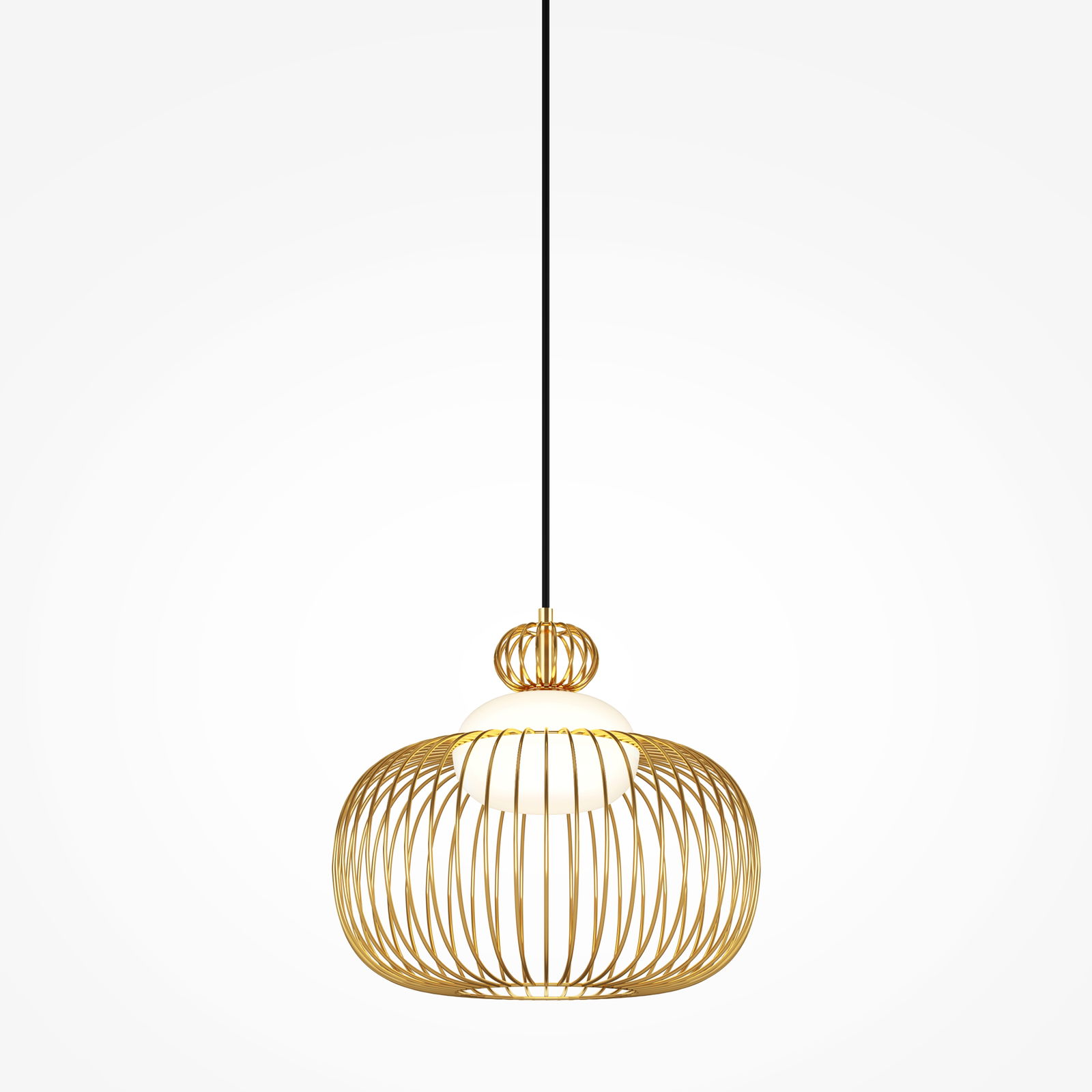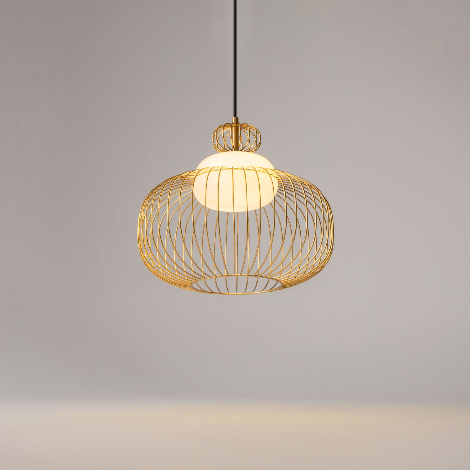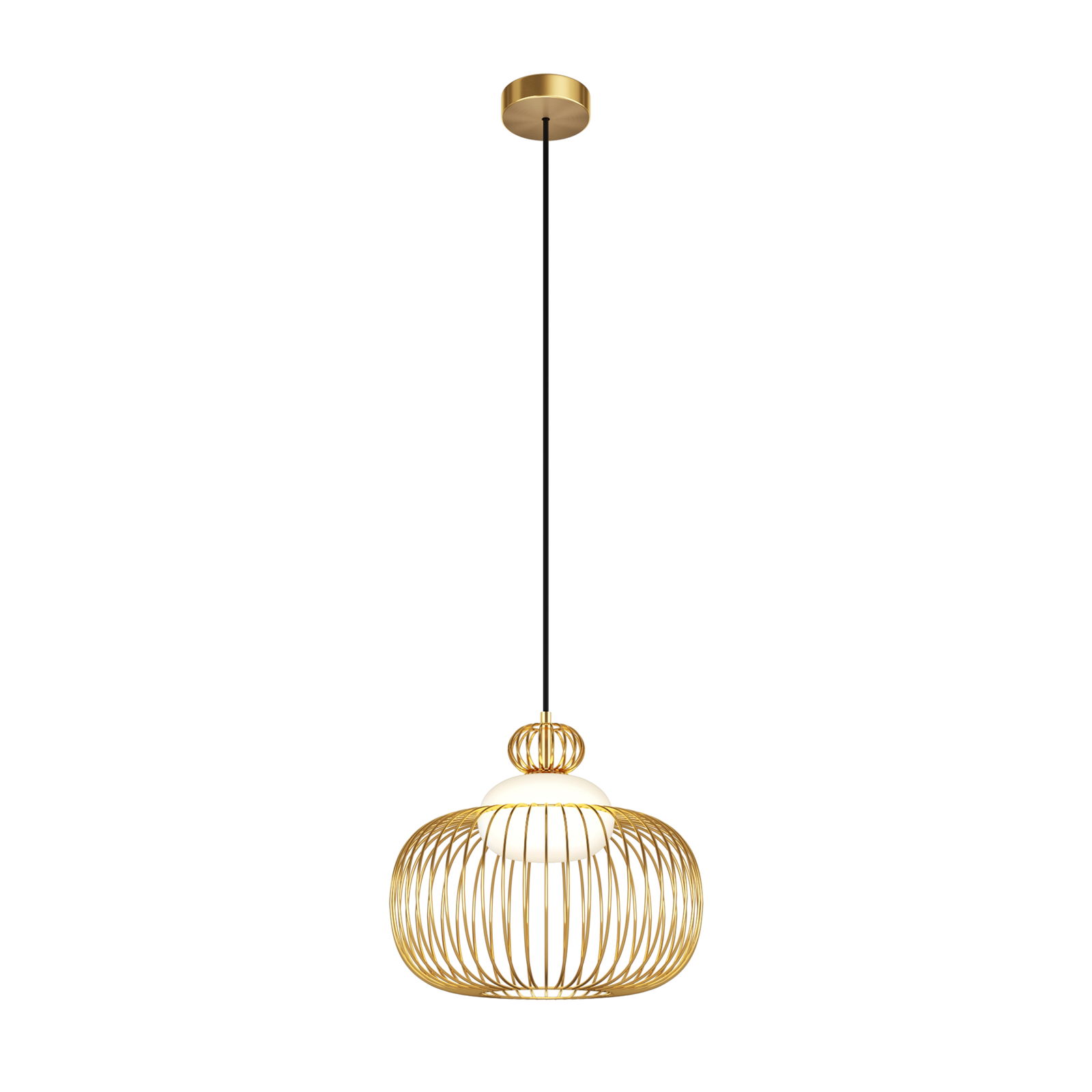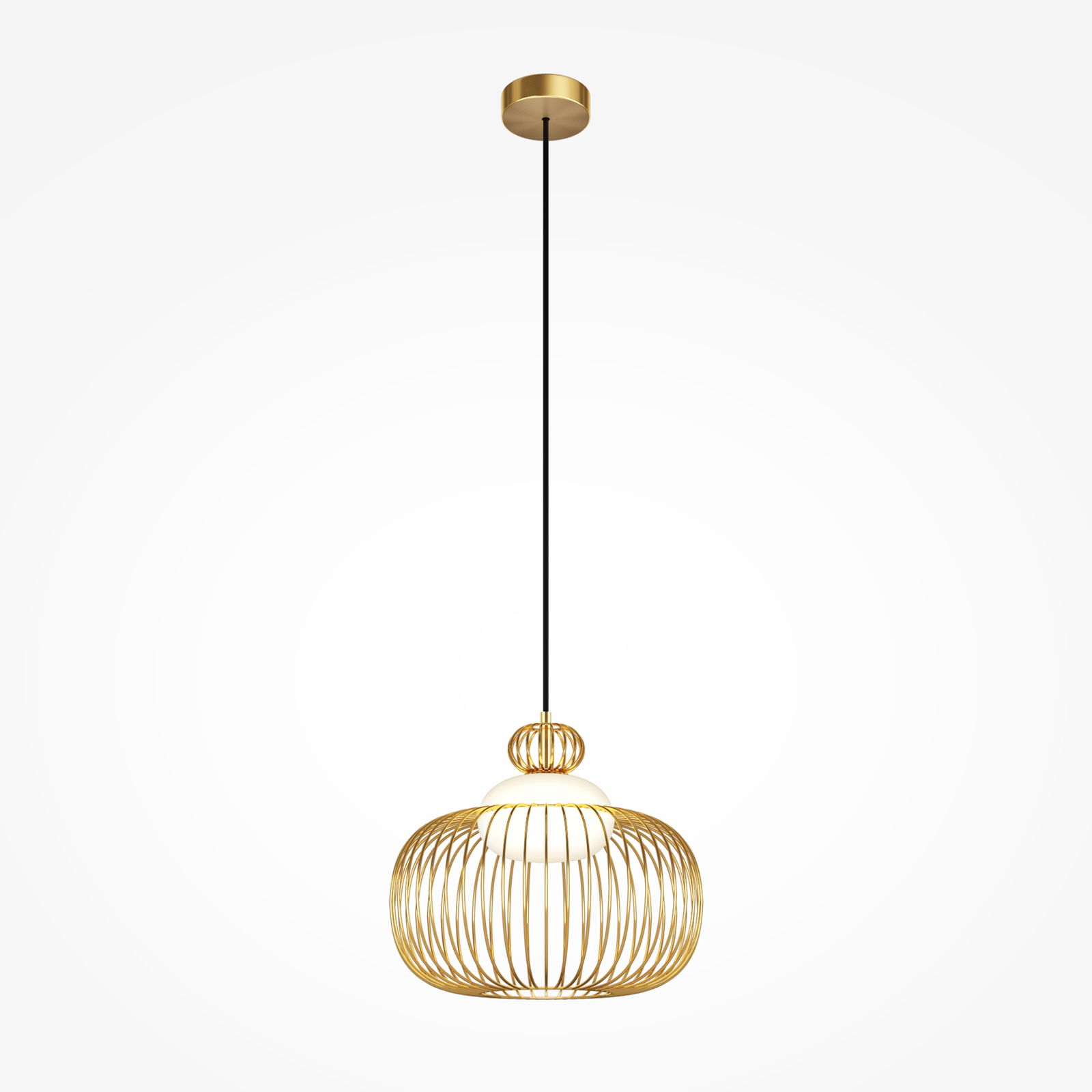 The Levitation Medium Brass Pendant Light has a round brass cage made from vertical metal slats that curve outward to form a lantern shape, 34.5cm in diameter. Inside the cage sits an opal white glass globe that diffuses the light output.