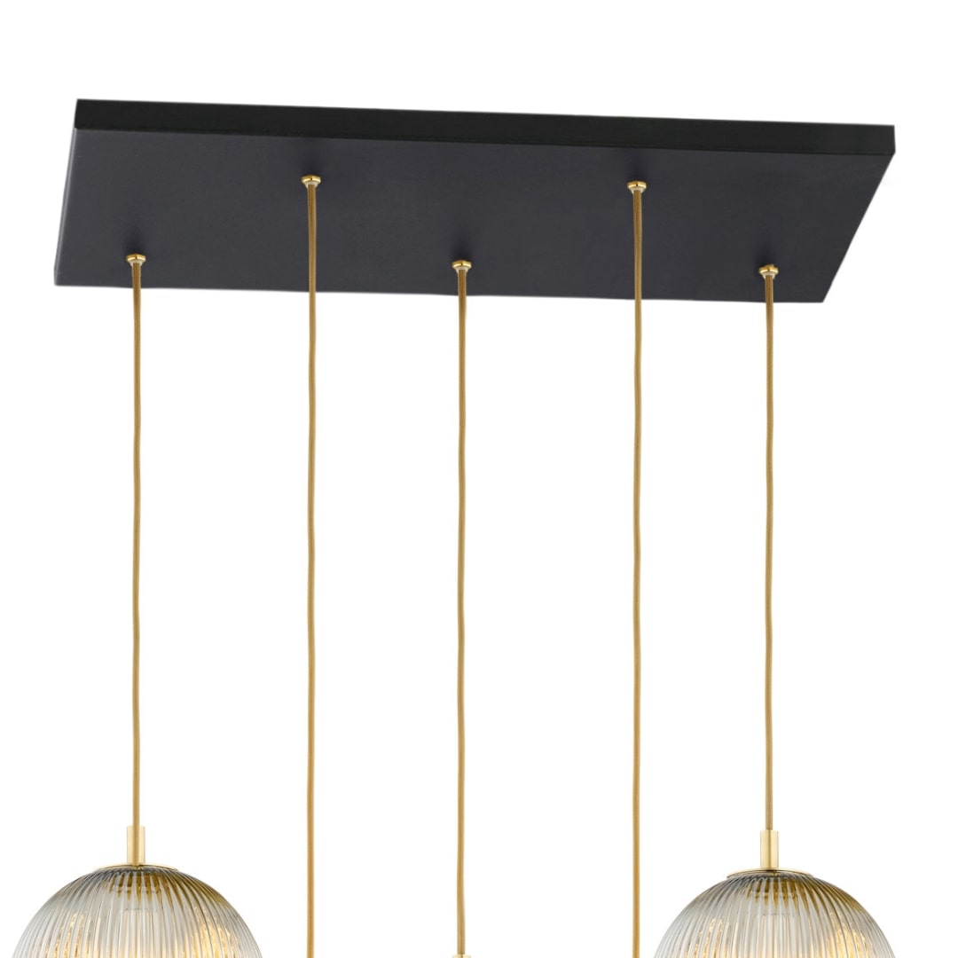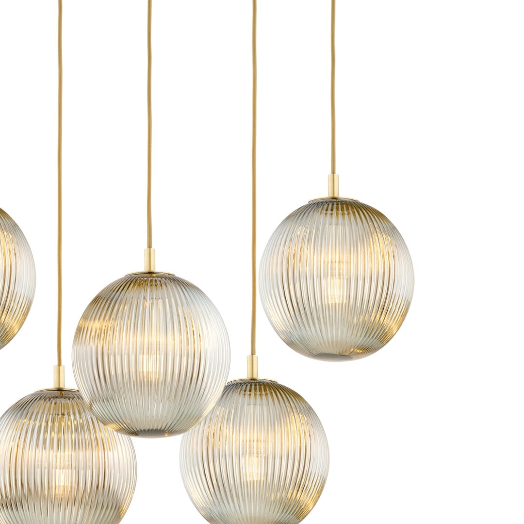 The Loma 5 Light Pendant Lamp in Grey Glass combines black steel with grey lister (ribbed) glass shades in a striking multi-drop design. The cluster arrangement creates a dramatic focal point with its 80cm diameter.