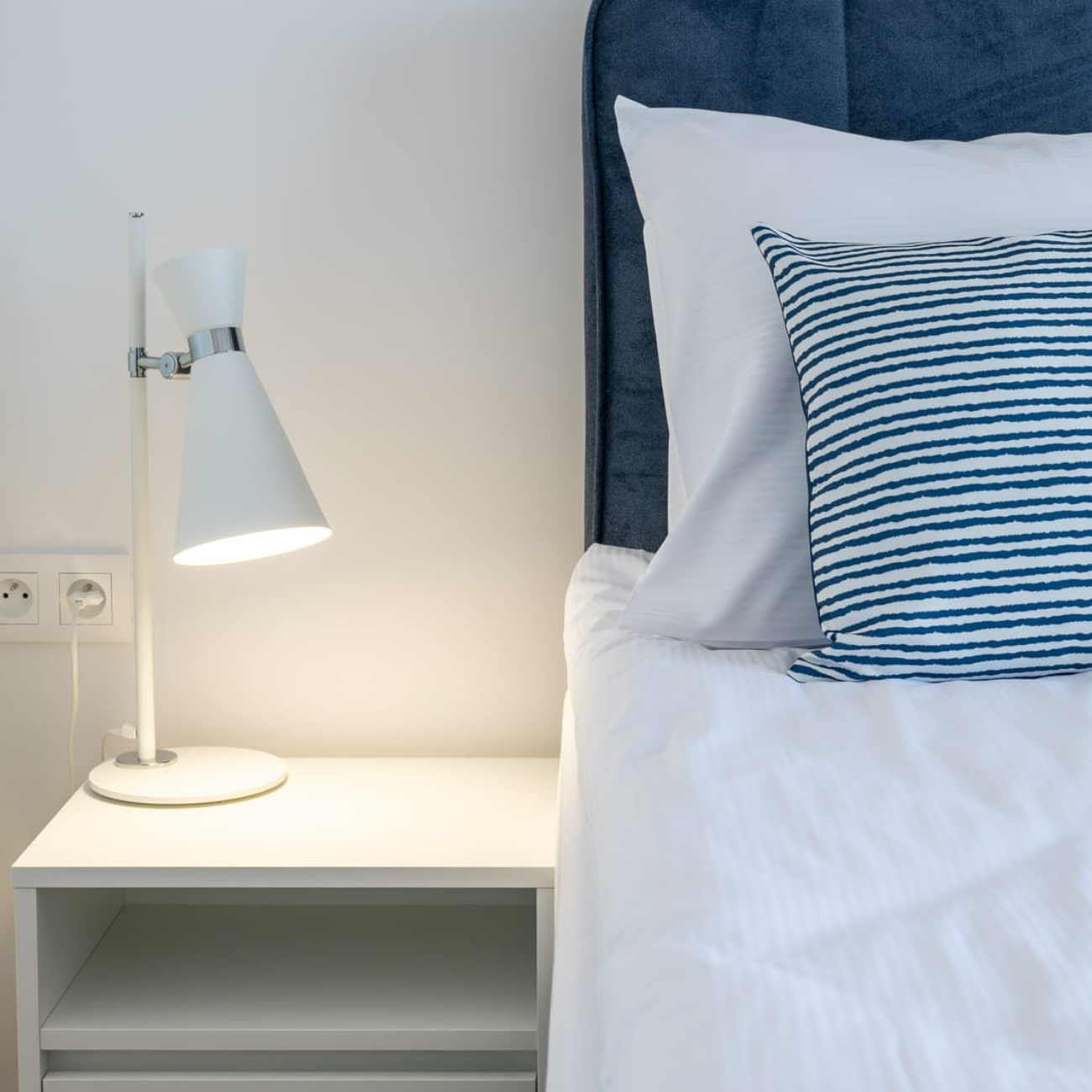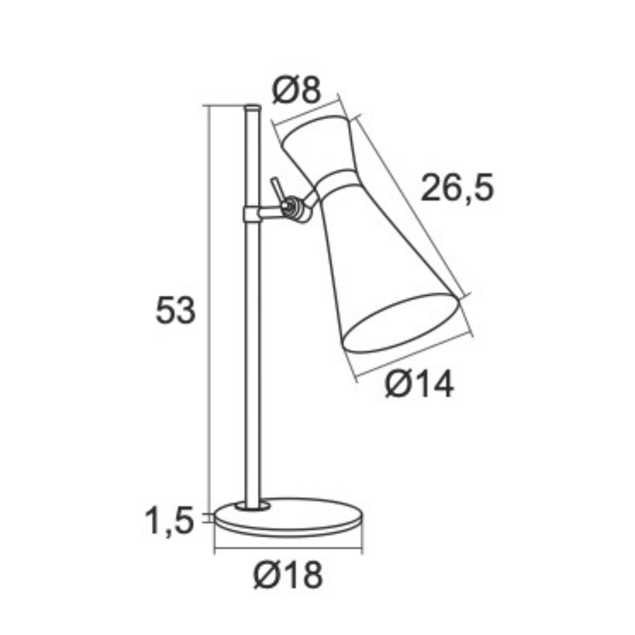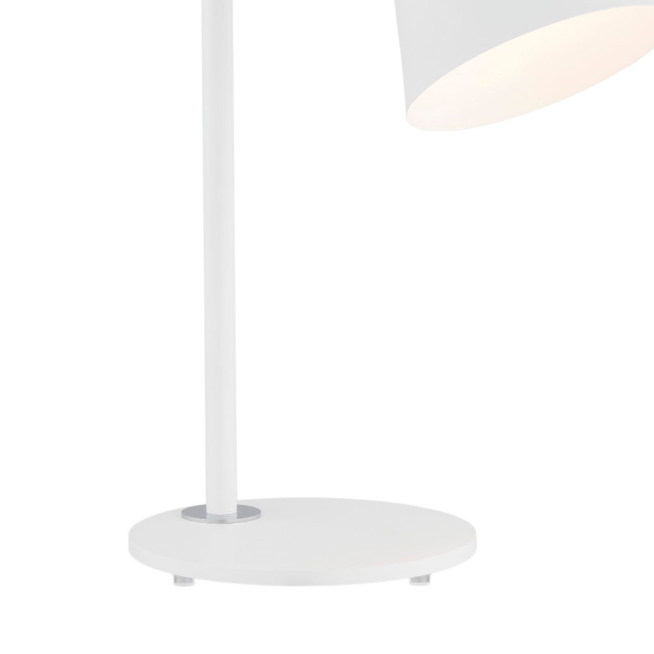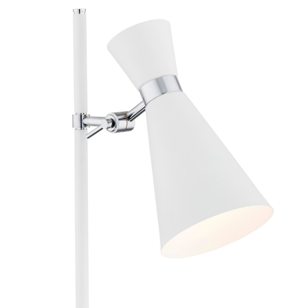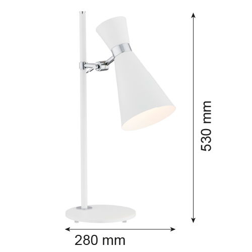 The Luke Desk Lamp has a white cone shade and a white and chrome stem with a pivot joint to angle the shade direction. It stands neatly on desks or side tables.