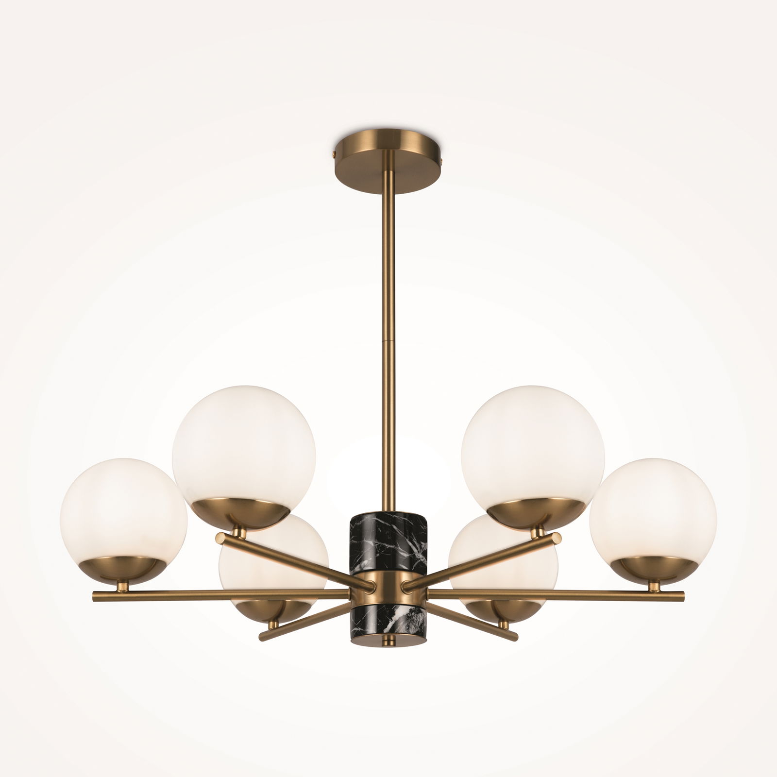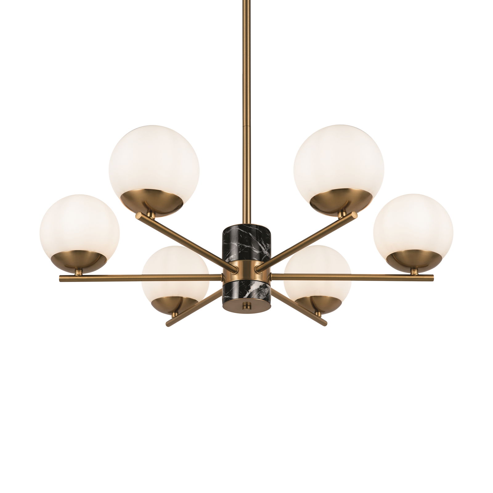 The Marble 6 Lamp Chandelier has six brass arms extending horizontally from a central hub with black marble and brass detailing. Each arm holds an upward-facing opal glass globe.