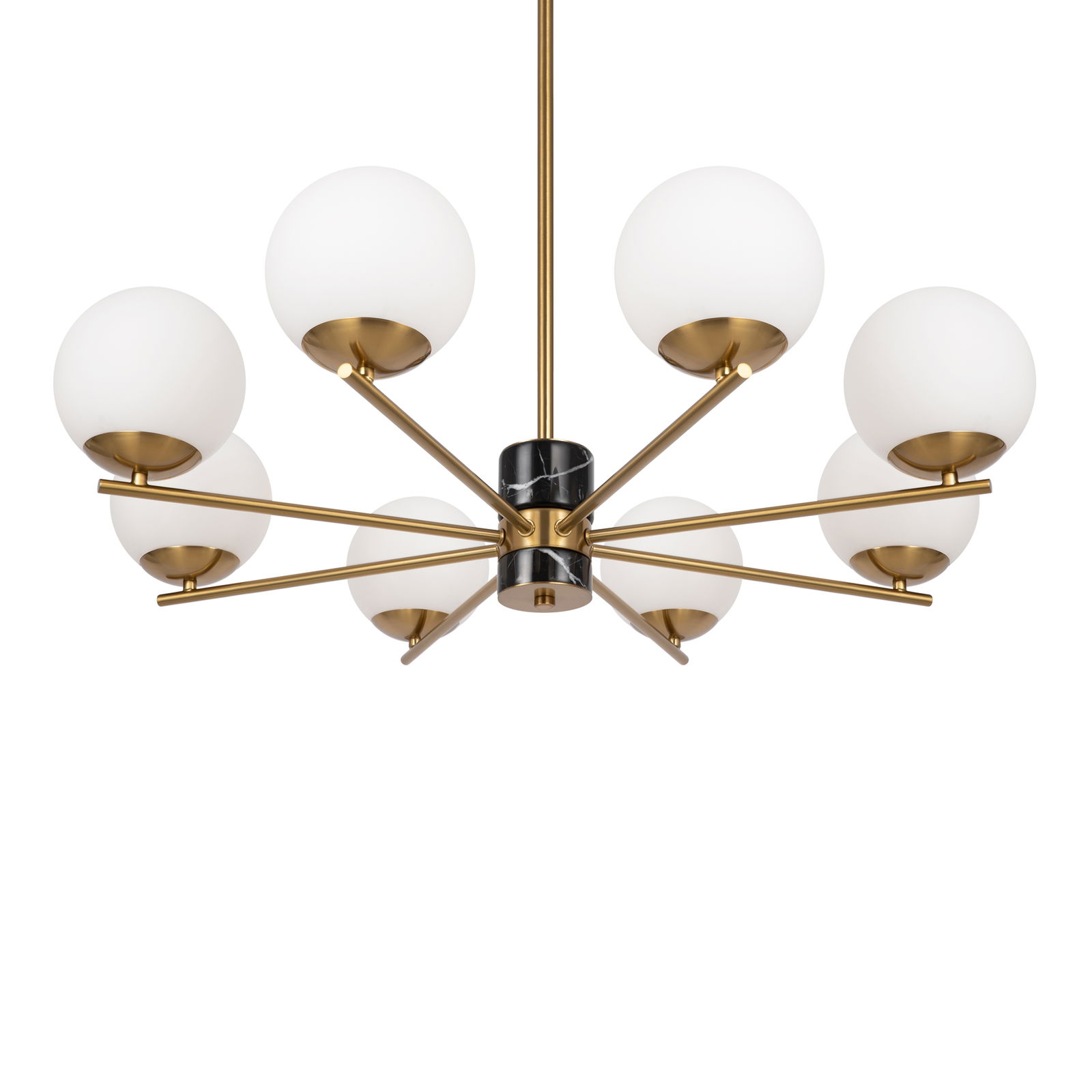 The Marble 8 Light Chandelier has eight brass arms which extend from a central black marble hub with white veining. Each arm holds an opal glass globe shade in a brass cup holder.