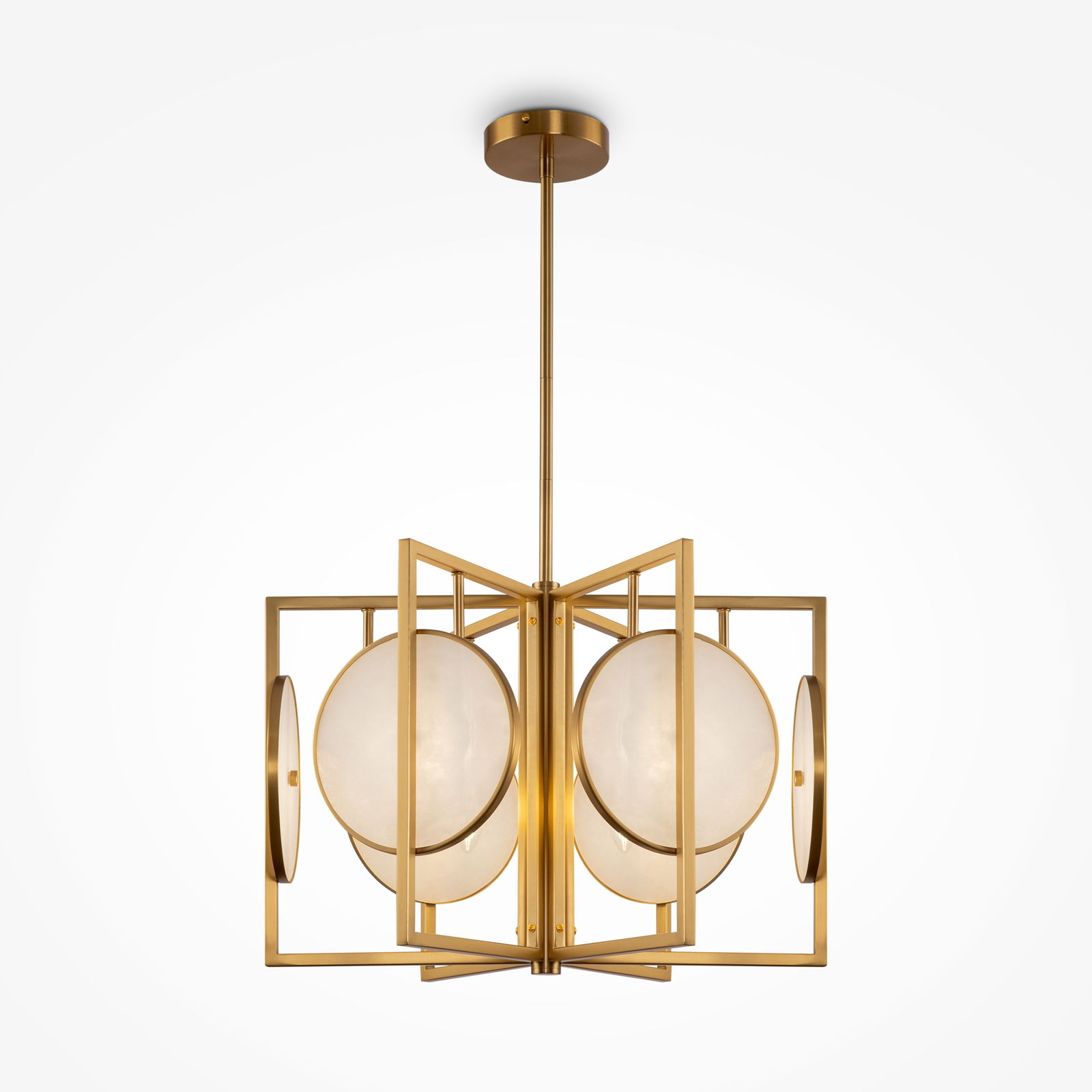 The Marmo Alabaster Six Light Chandelier has six circular alabaster glass discs held within brass rectangular frames that are suspended from a central brass rod. Each alabaster disc is encased in a brass ring within its frame.