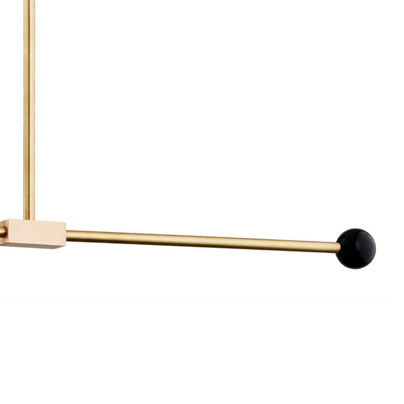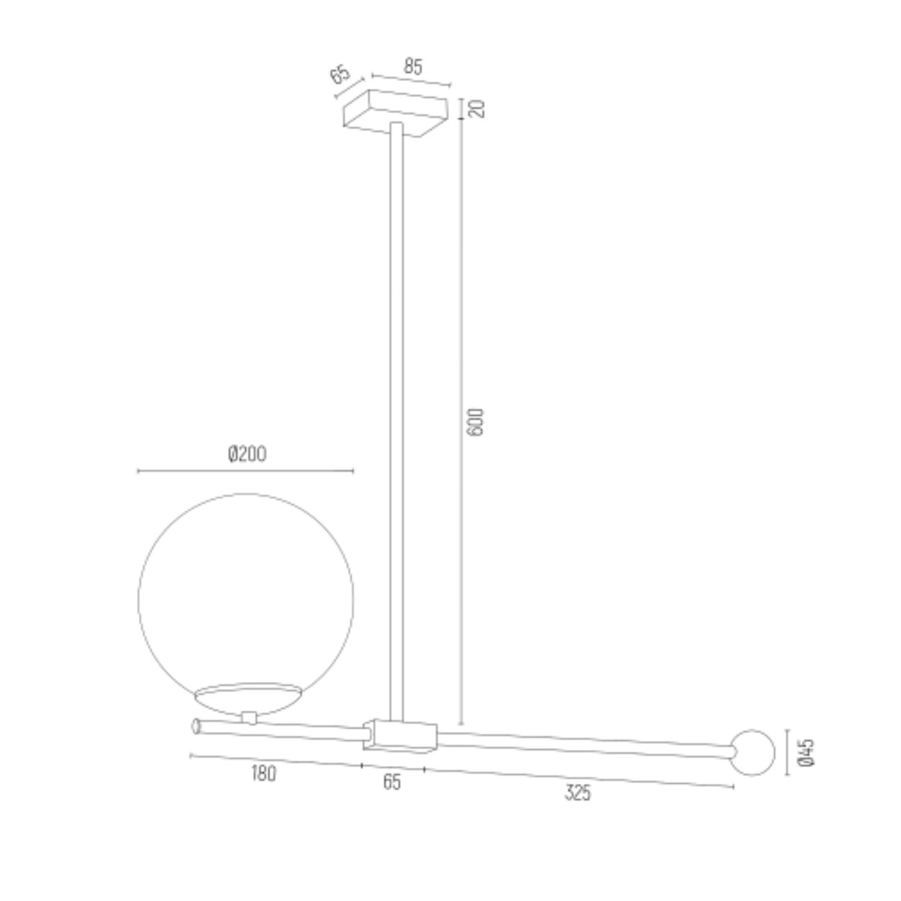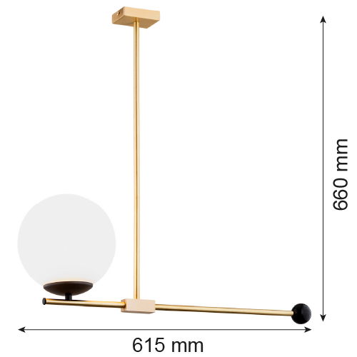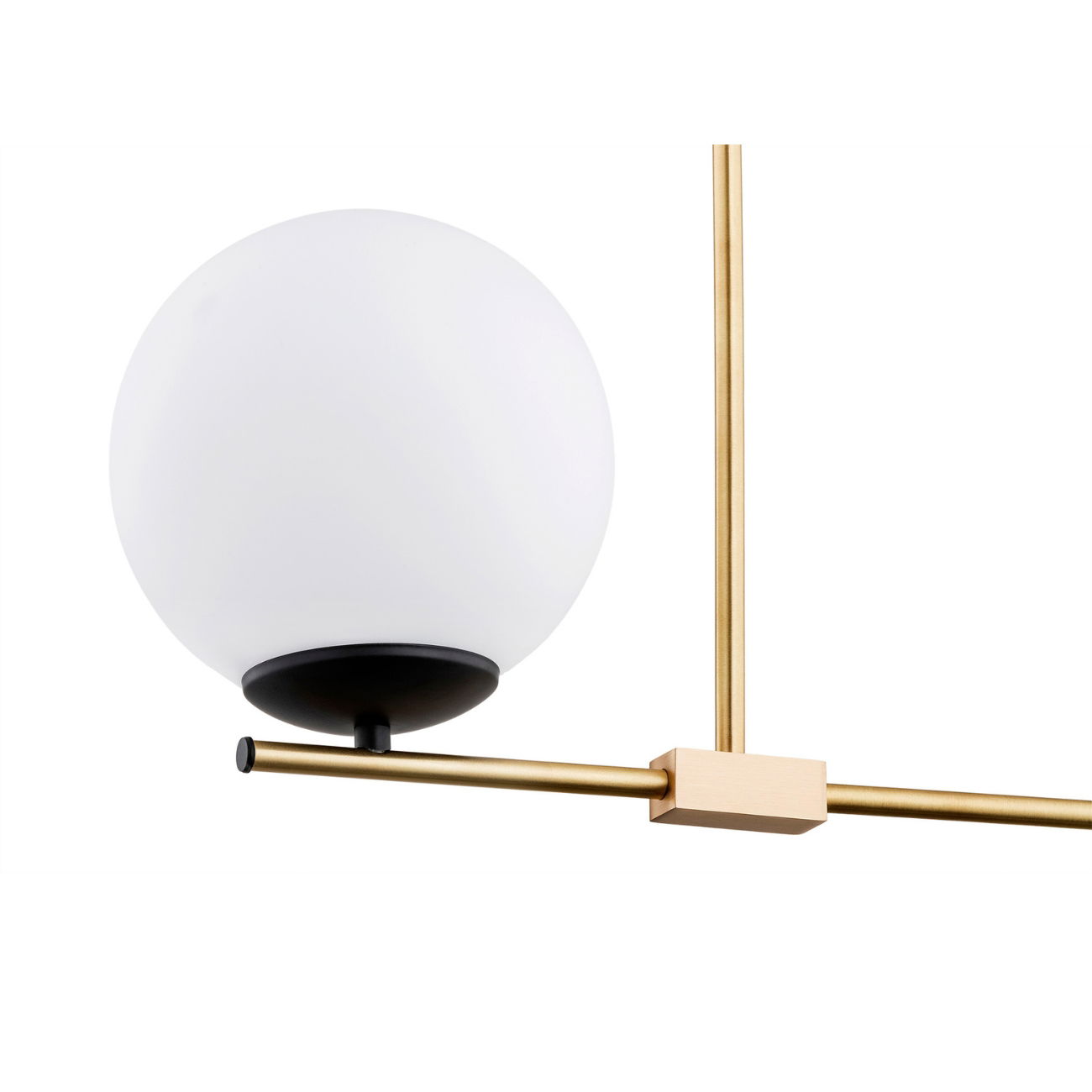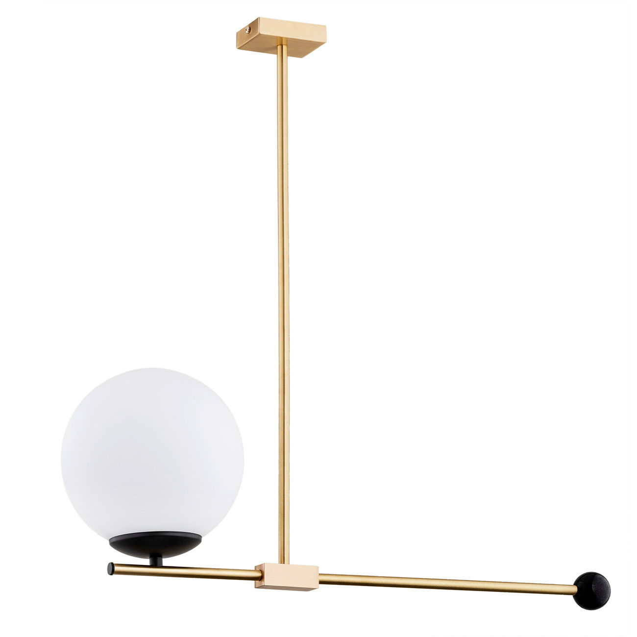 The Meg Linear Pendant Lamp has one large opal glass globe on a horizontal brushed brass bar. A small black decorative sphere sits on the opposite end, and the total pendant lamp hangs down 66cm from a square brass ceiling plate.