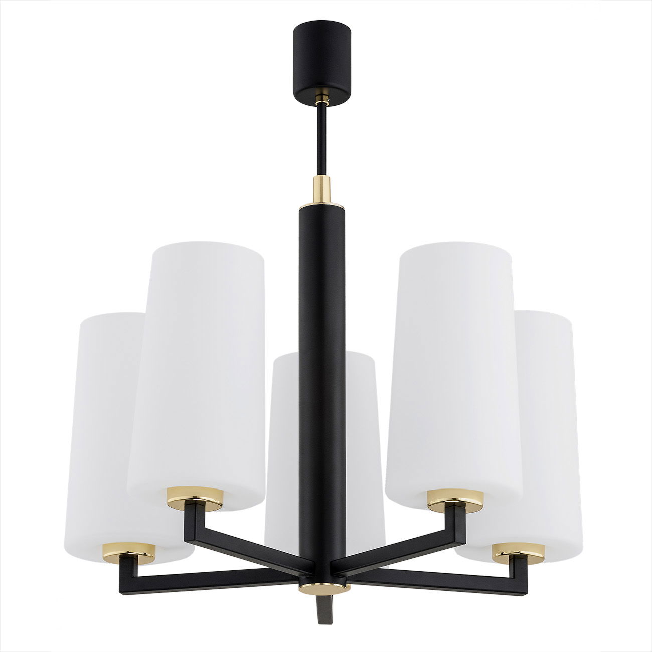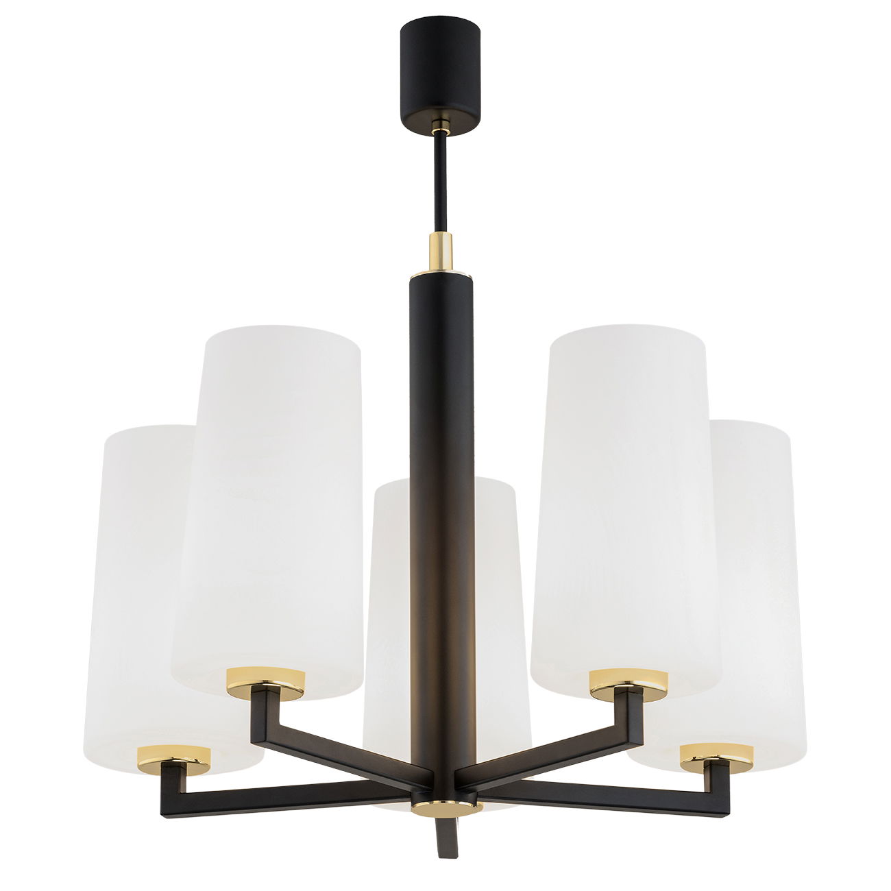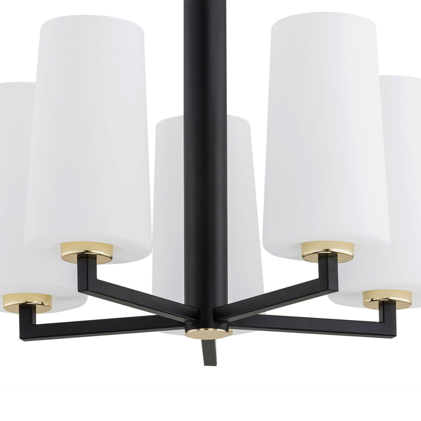 The black Melot 5 Lamp Chandelier has a black matt frame with brass details and five white opal glass cylinder shades. The chandelier holds the four shades on horizontal arms.